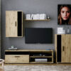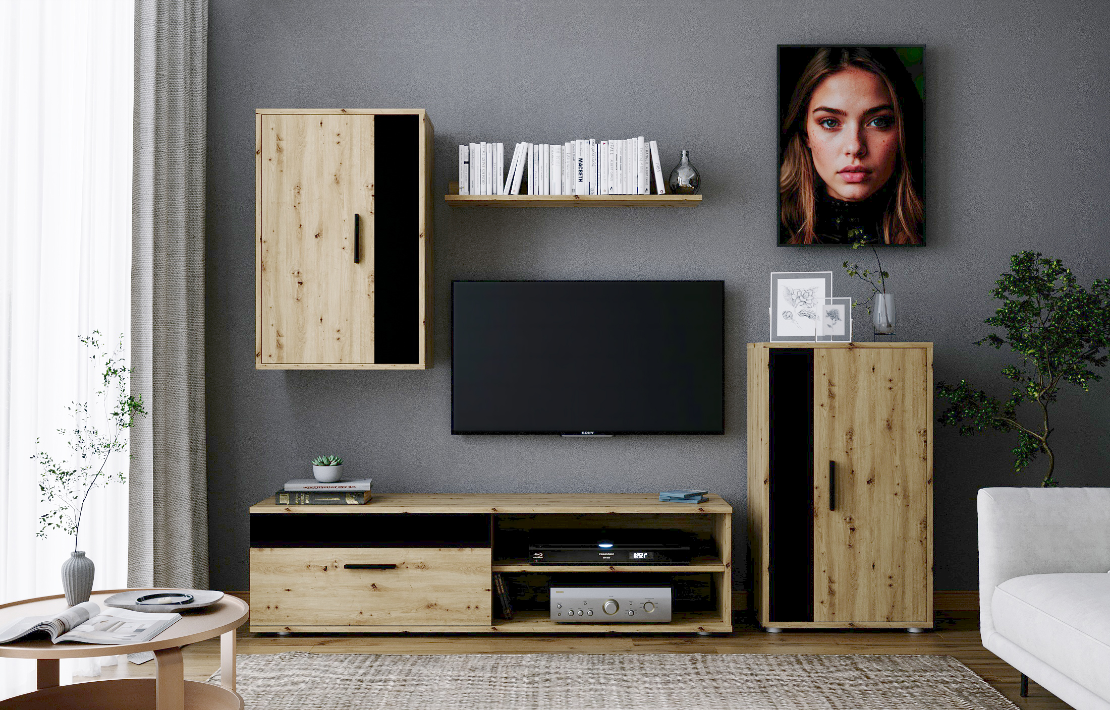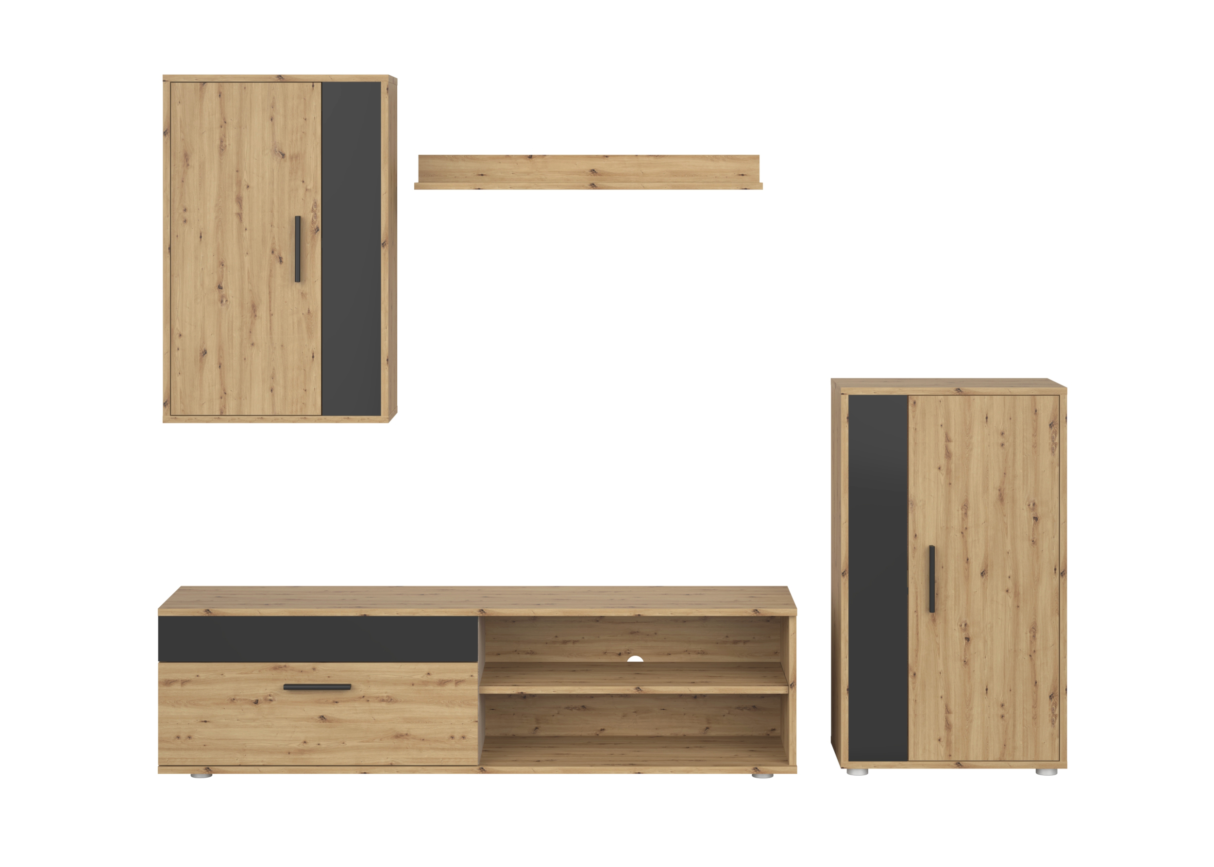 zestaw mebli, materiał: płyta meblowa 16 mm, uchwyty plastikowe, zawiasy Hettich, kolor: dąb artisan / czarny