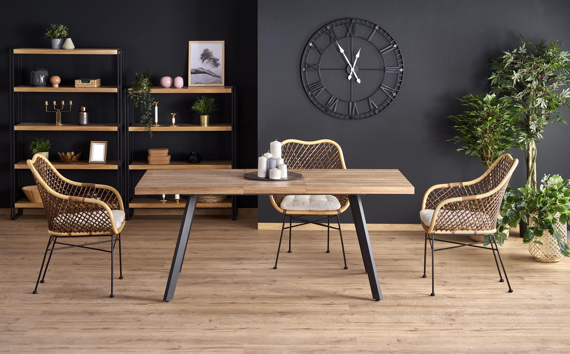 wymiary: 140÷180/85/76 cm, stół rozkładany, materiał: MDF laminowany / stal malowana proszkowo, kolor: blat – orzech miodowy, nogi – czarny