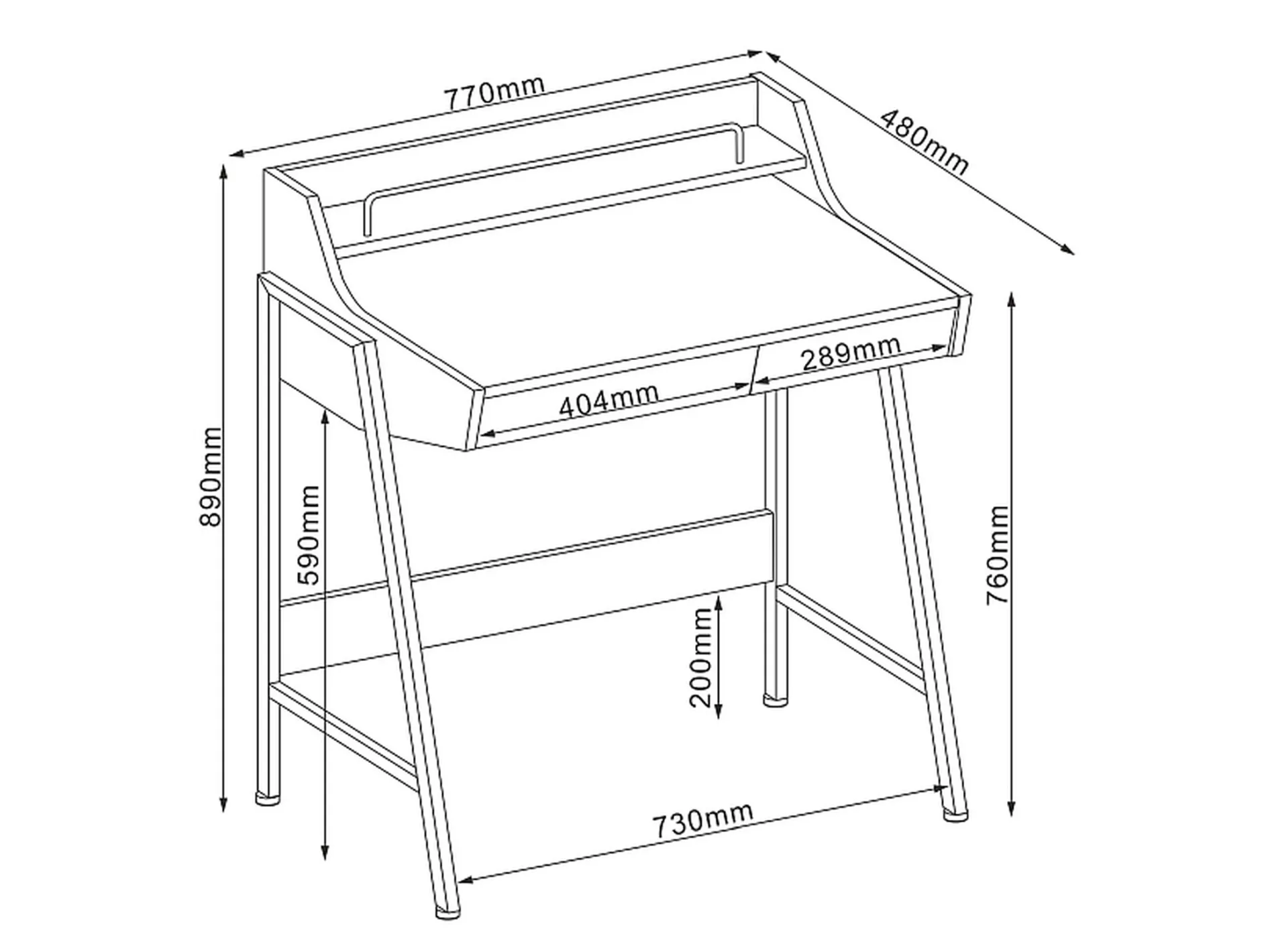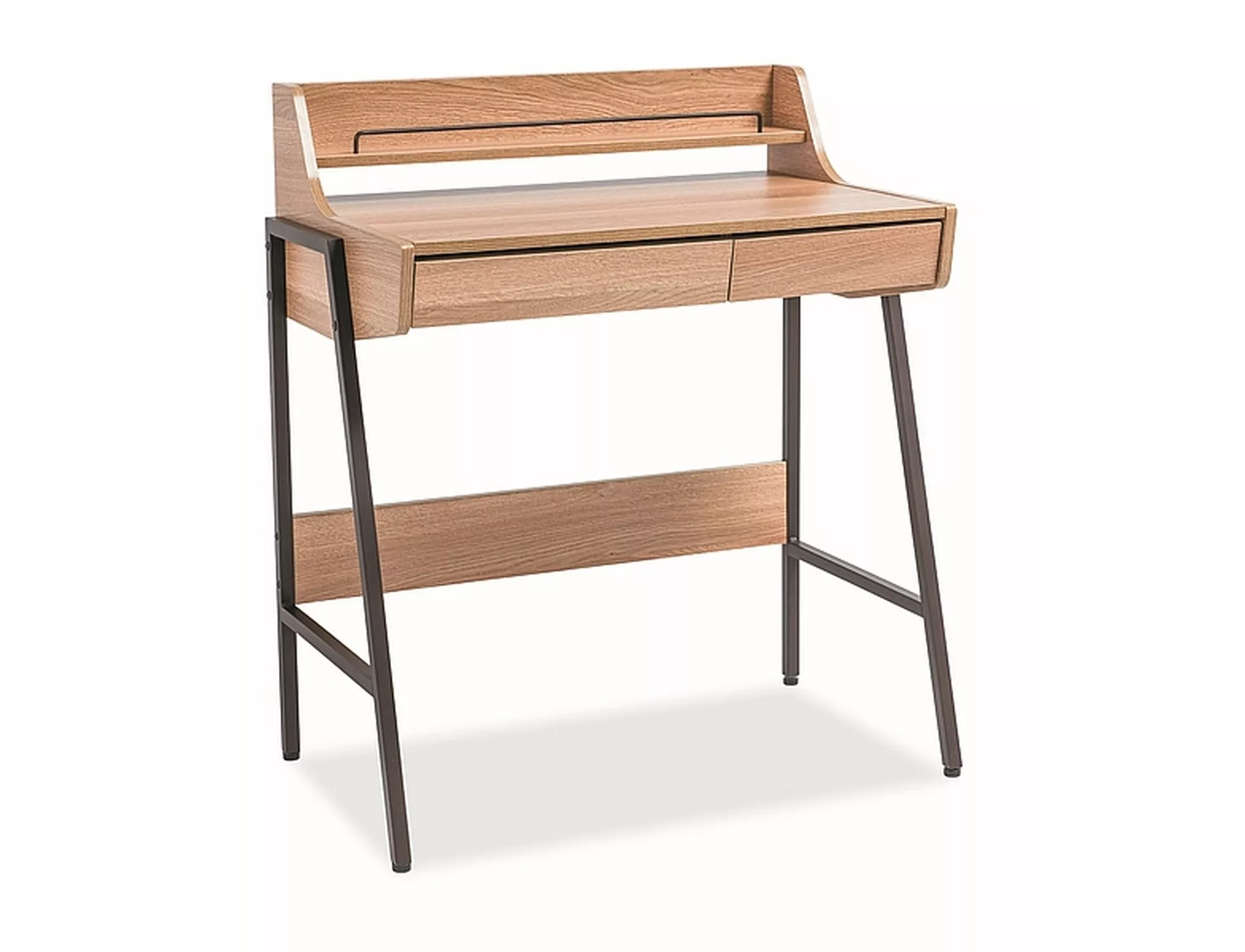 Biurko, blat: MDF, kolor: dąb, stelaż: metal, kolor: ciemny brąz. Wysokość szuflad 6cm.