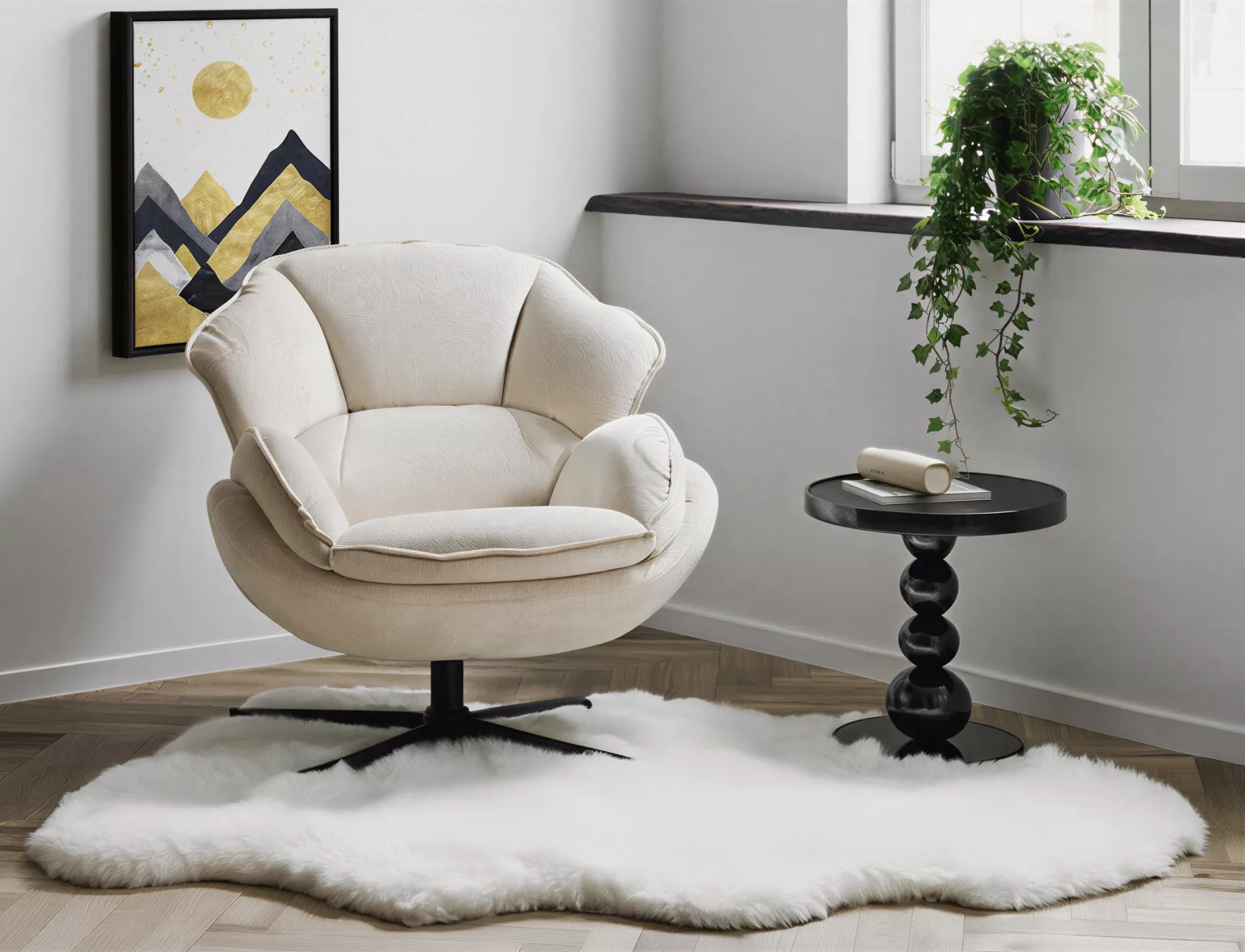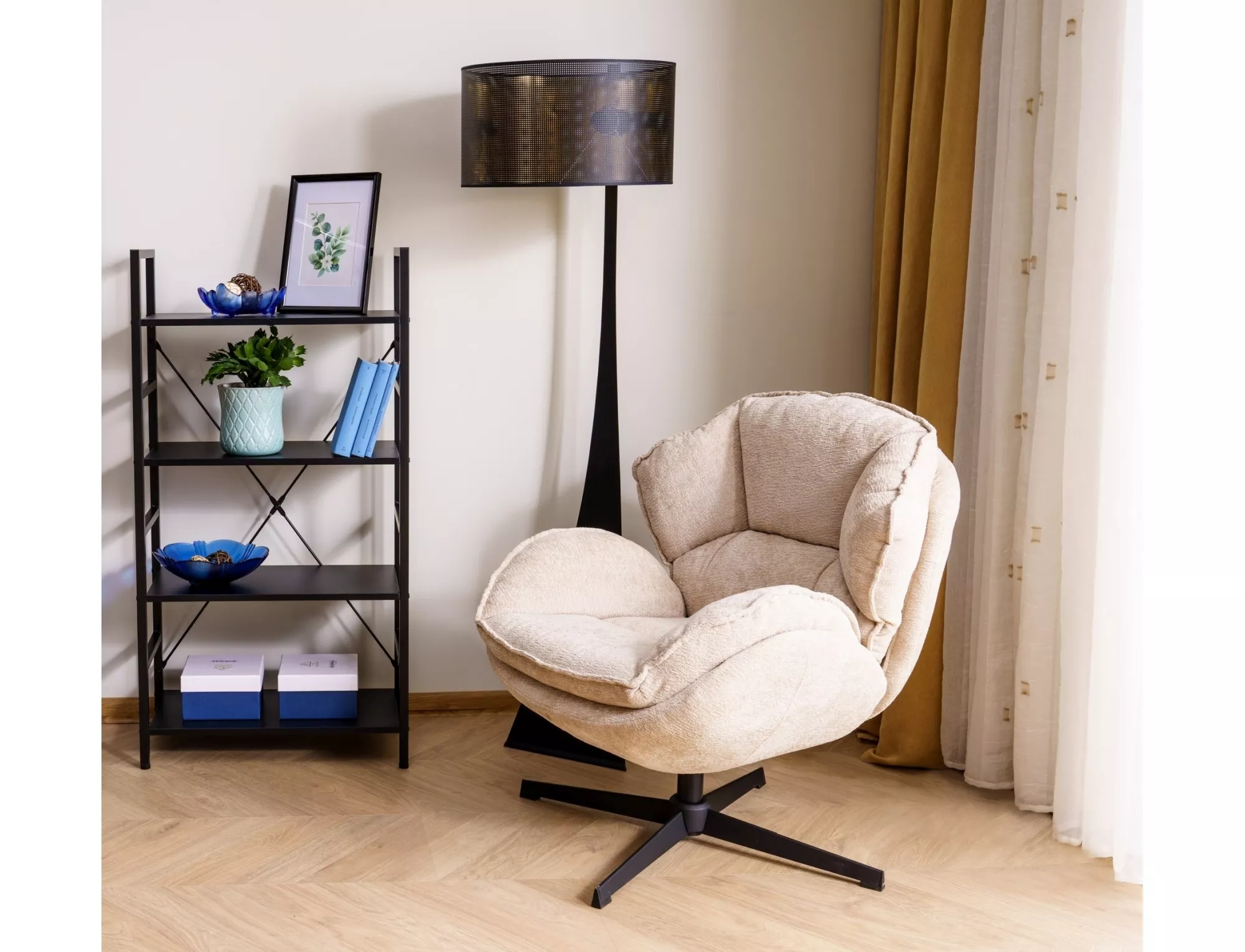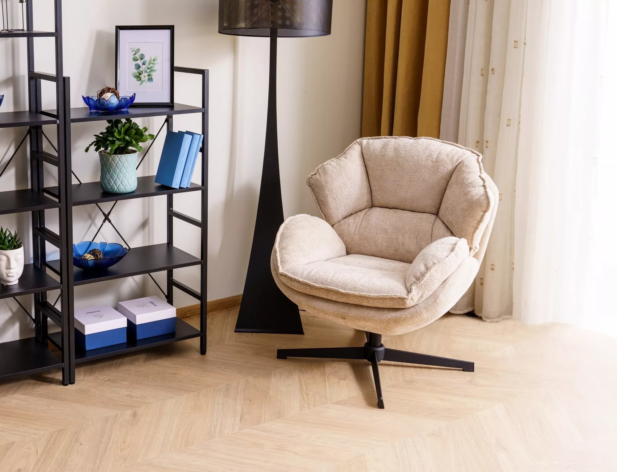Fotel, tkanina tap. 241, stelaż: metal, kolor: beżowy / czarny. Siedzisko obracane w zakresie 360st.