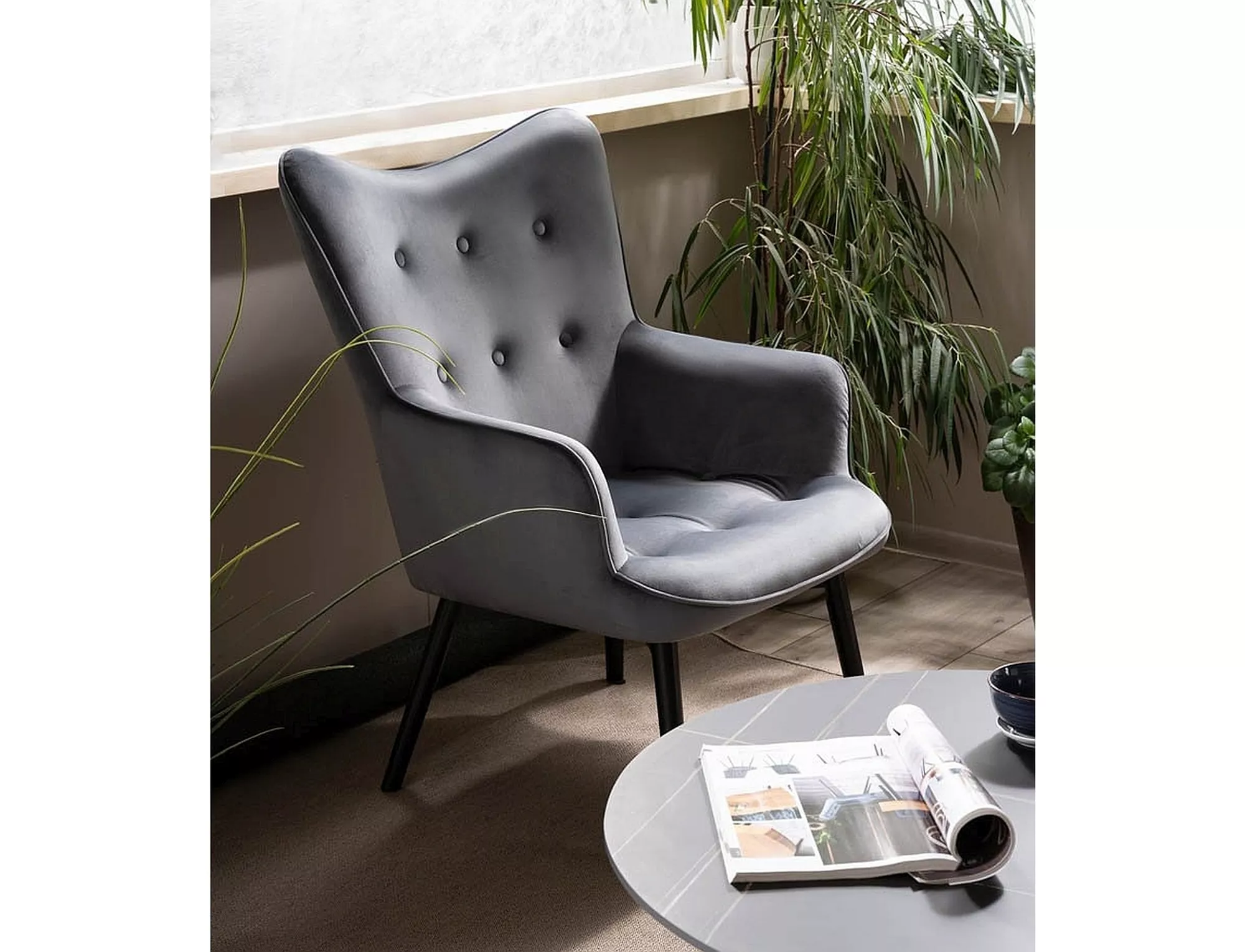 Fotel, tkanina aksamit, kolor: szary Bluvel 14, drewno, kolor: czarny mat