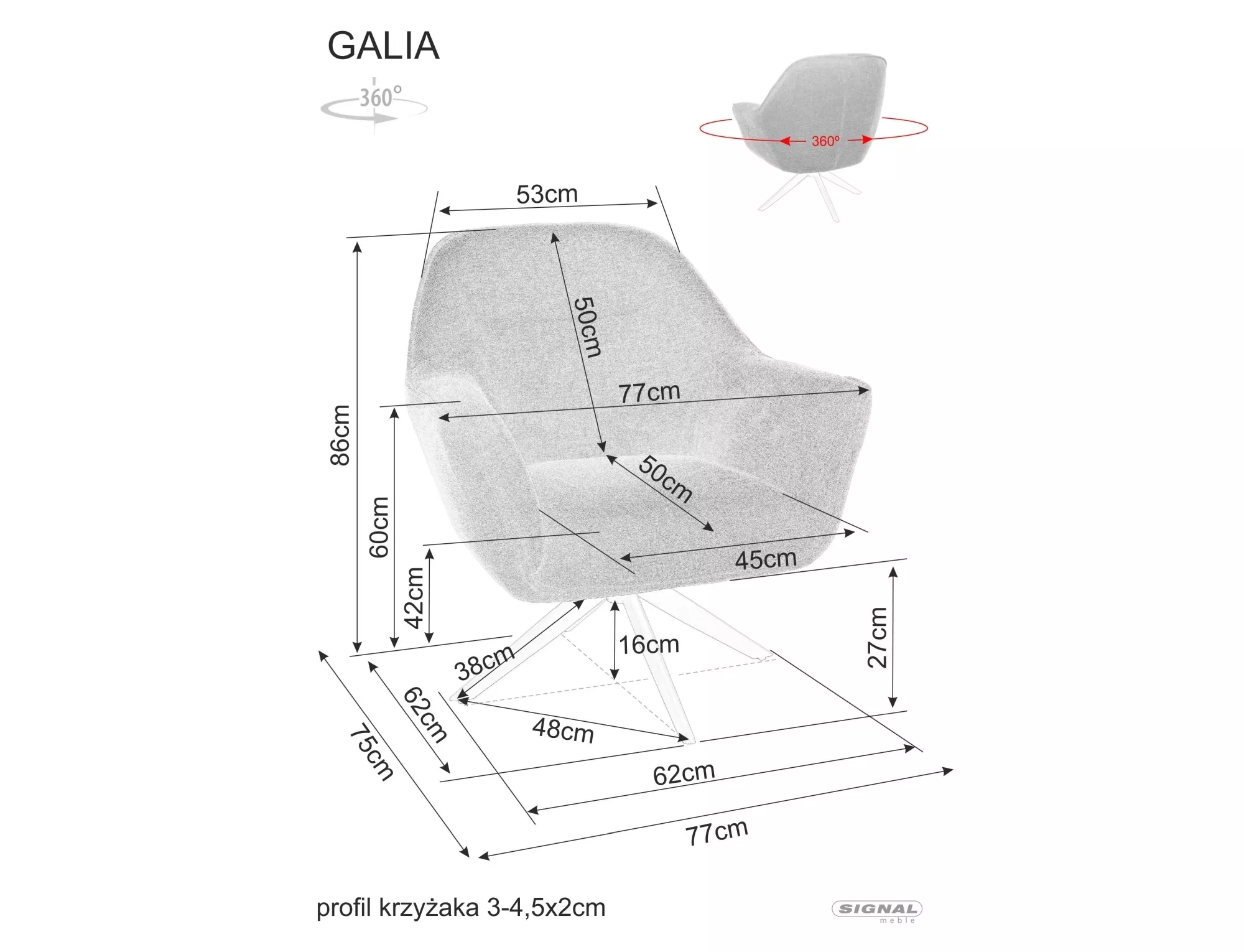 Wymiary fotela: A – 86, B – 77, C – 42, D – 50, E – 75, F – 27 cm