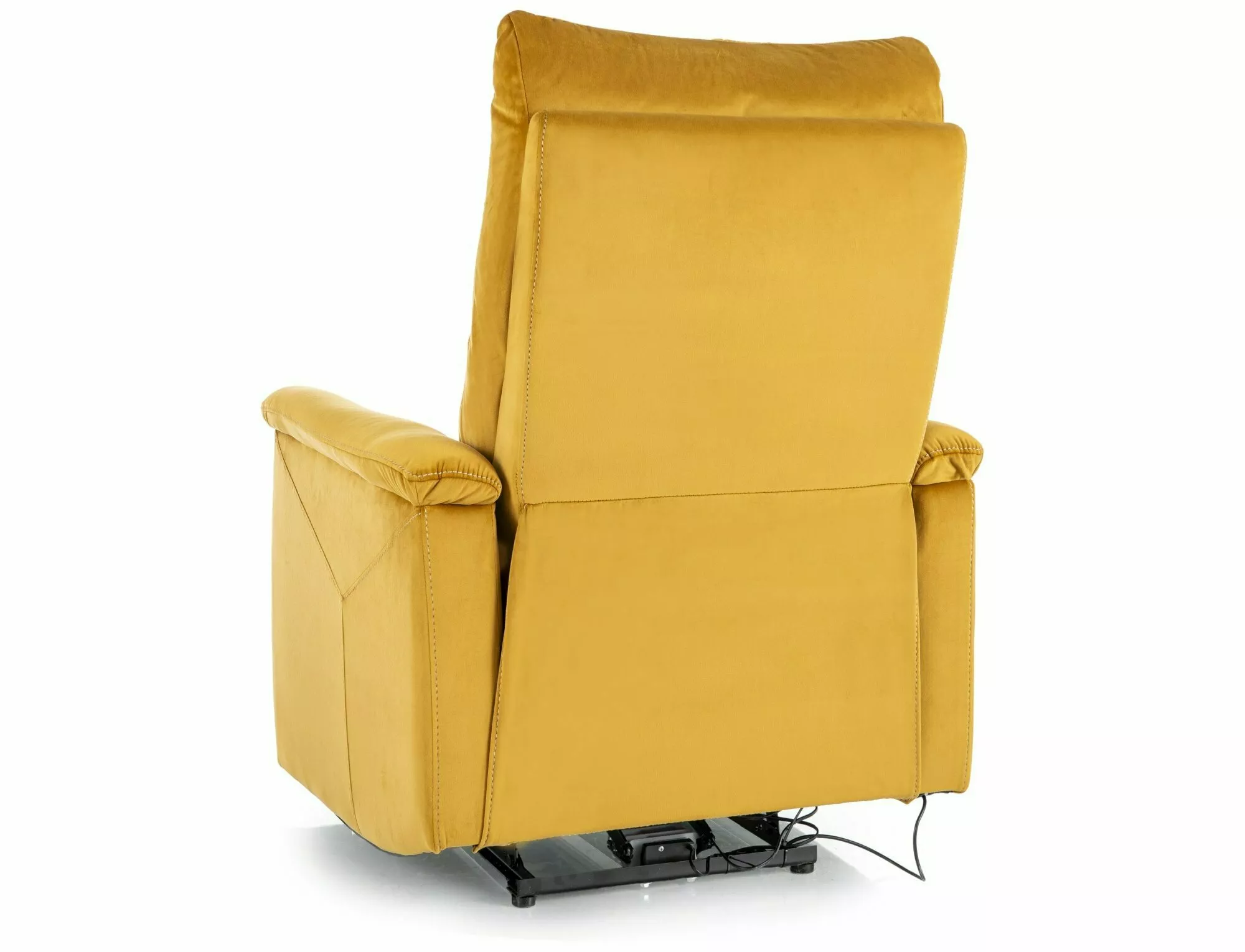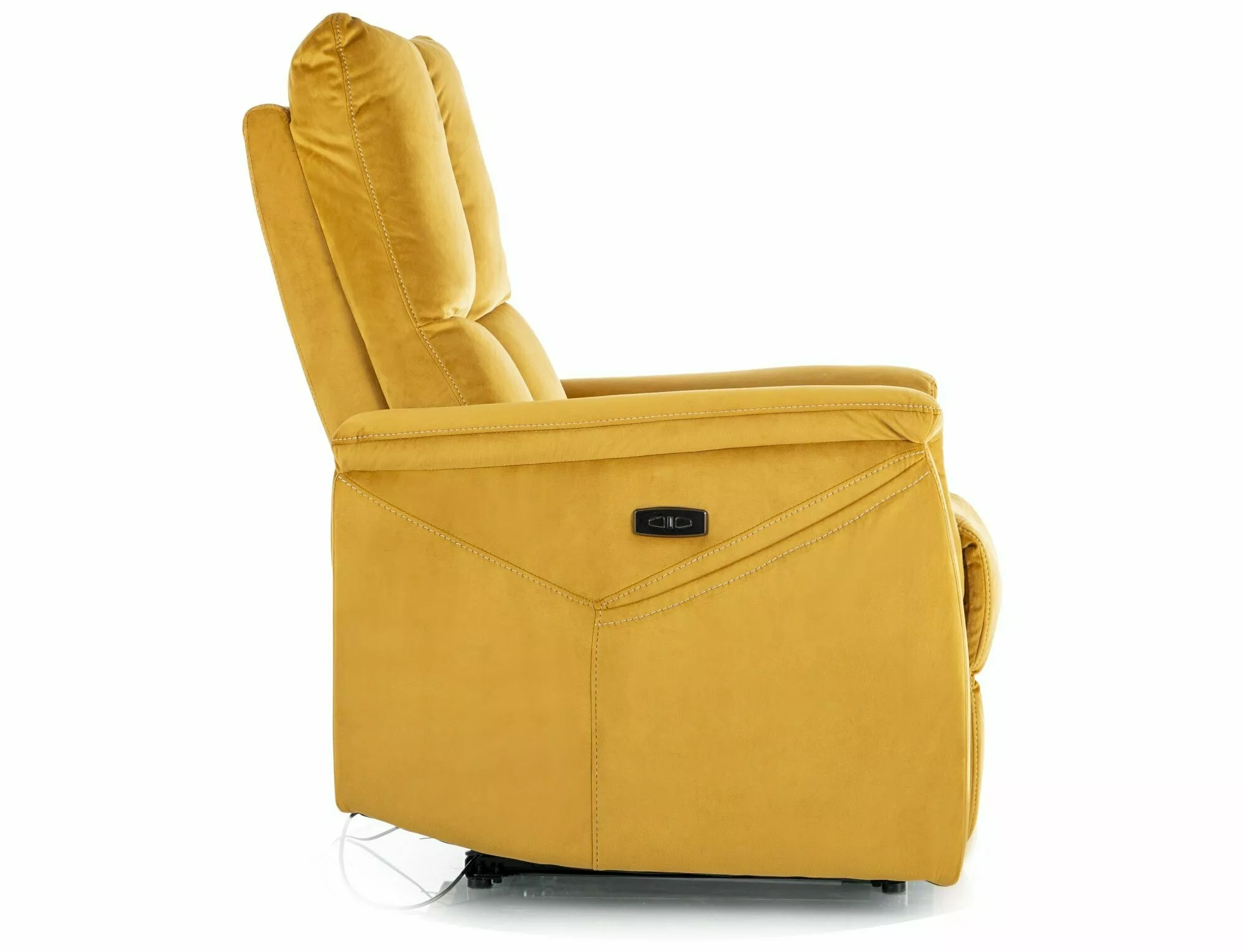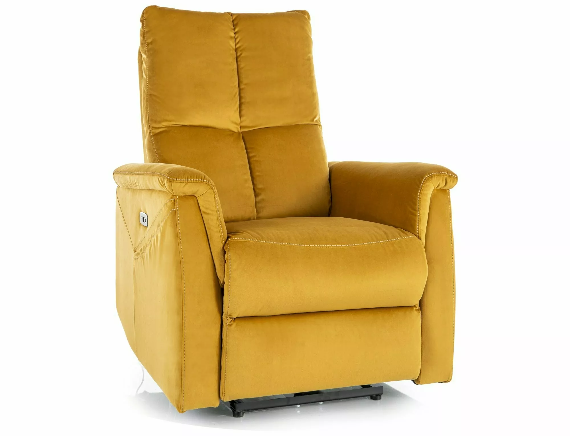 Fotel rozkładany elektrycznie, tkanina aksamit: Bluvel, kolory: curry 68. W panel sterowania wbudowane gniazdo USB.