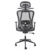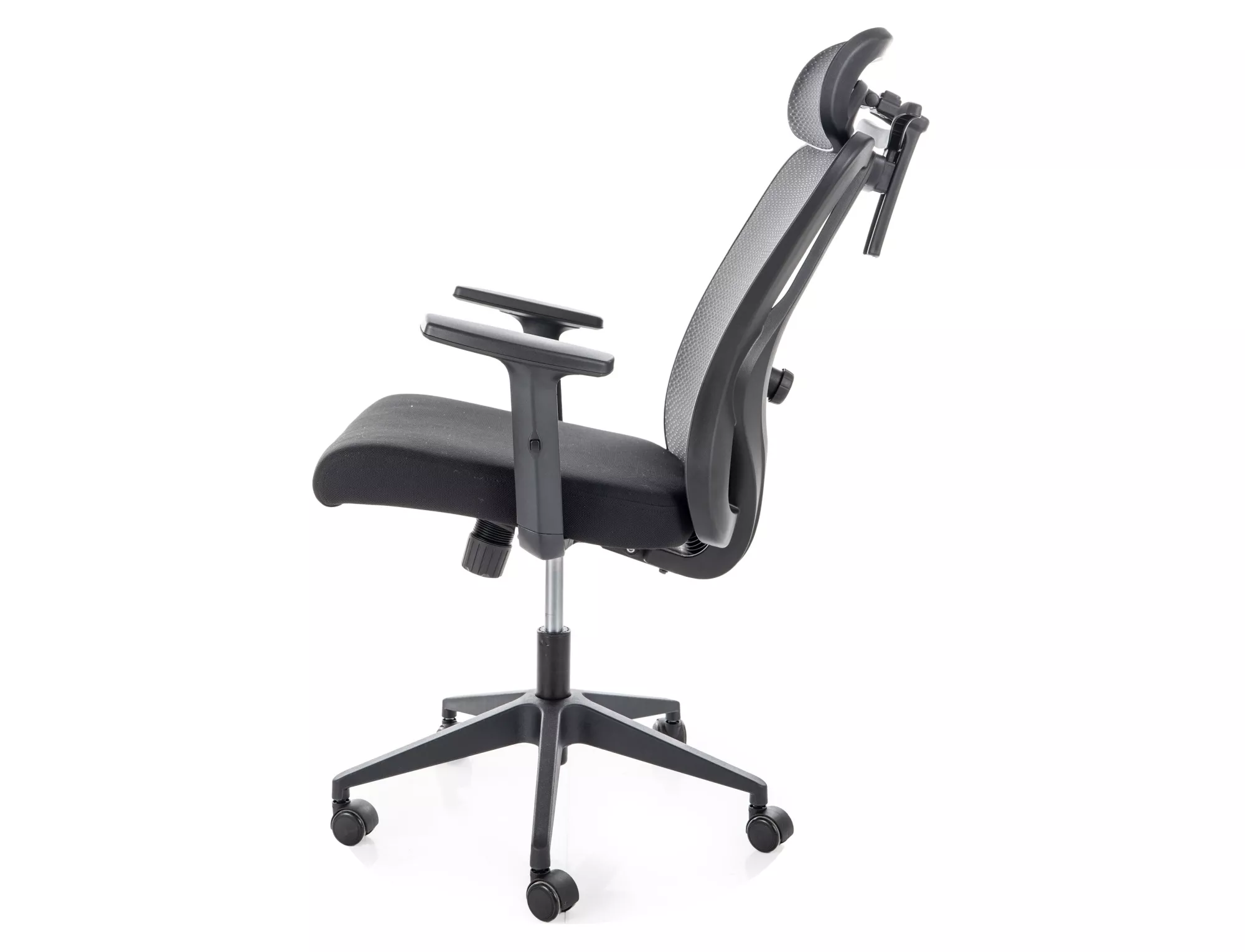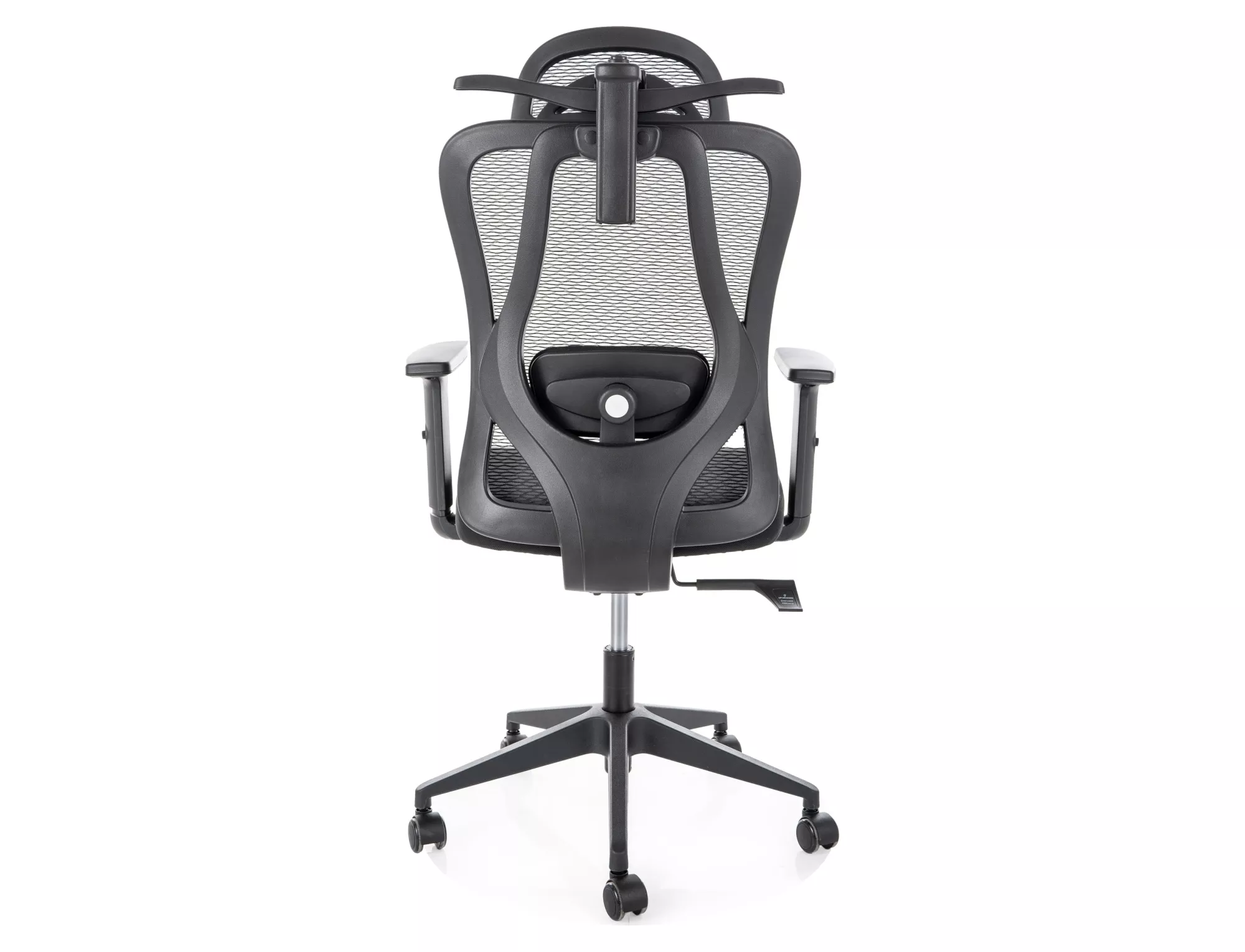 Fotel obrotowy ergonomiczny, spełnia wymogi BHP dotyczące krzeseł biurowych zgodnie z rozporządzeniem  Dz. U. poz.2367. Siatka / tkanina membranowa, kolor: czarny, mechanizm TILT, multiblock, regulowane podłokietniki, odcinek lędźwiowy oraz zagłówek. Na zwieńczeniu oparcia fotel posiada praktyczny wieszak na marynarkę / żakiet.