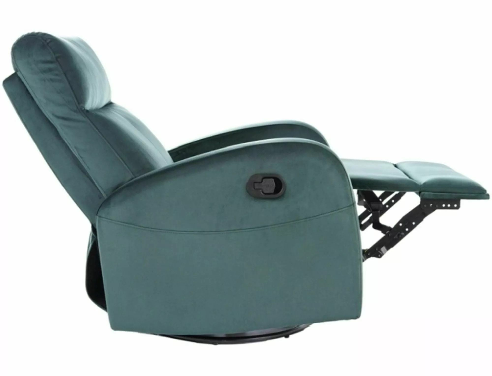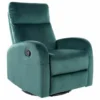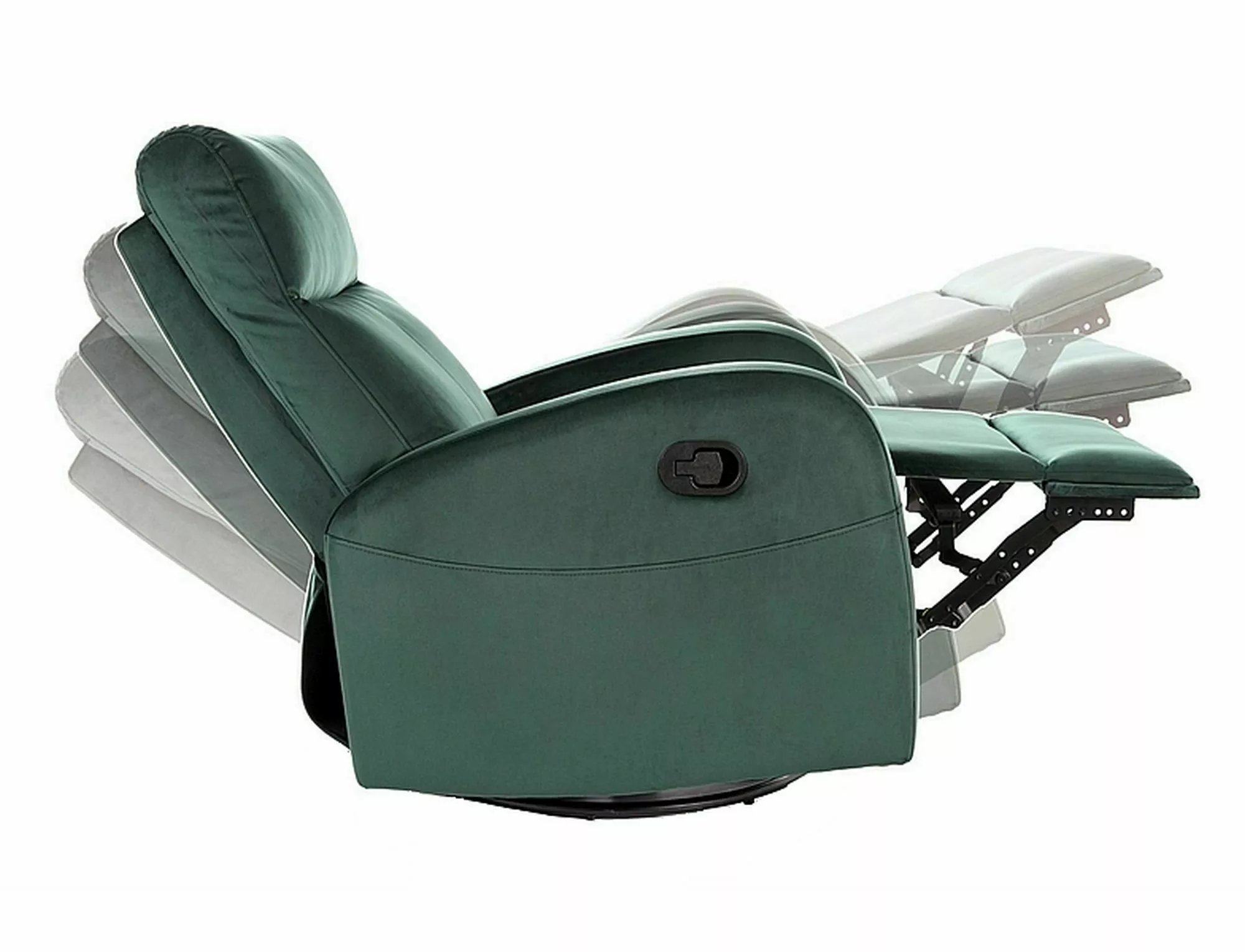 Fotel rozkładany z funkcją bujania i obrotu, tkanina aksamit: Bluvel, kolory: zielony 78. Siedzisko obracane w zakresie 360st., opcja kołyski działa w pozycji złożonej.