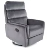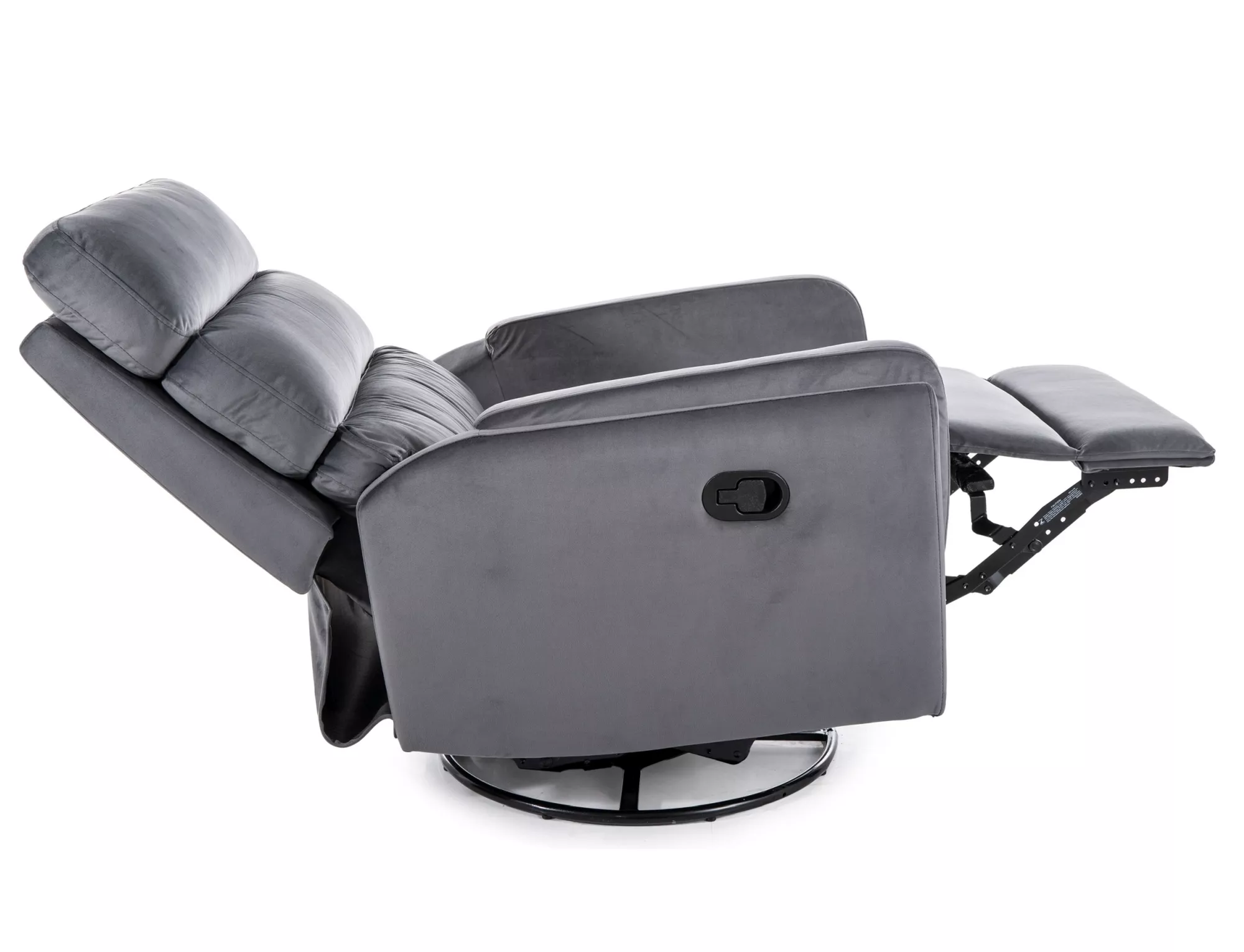 Fotel rozkładany z funkcją kołyski, tkanina aksamit: Bluvel 14 , stelaż: metal, kolor: szary / czarny. Siedzisko obracane w zakresie 360st., opcja kołyski działa w pozycji złożonej.