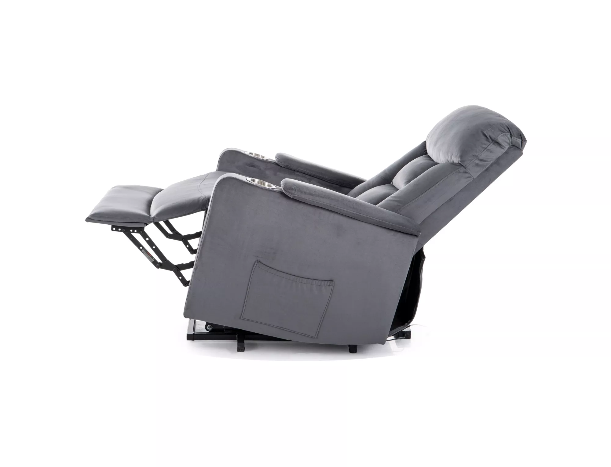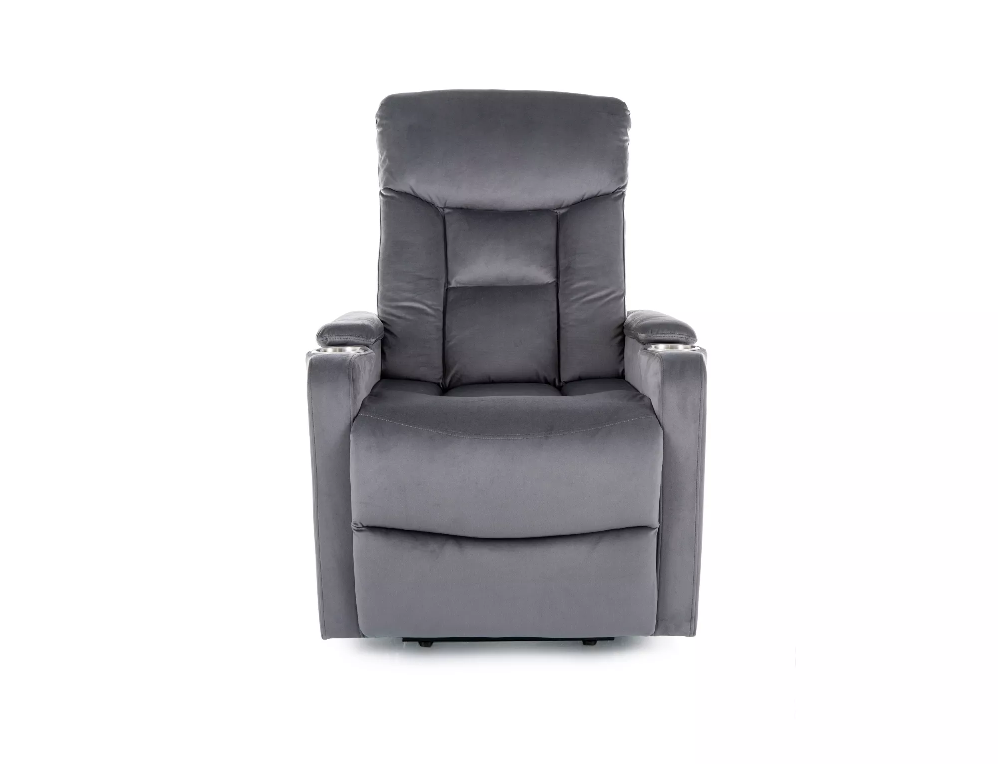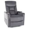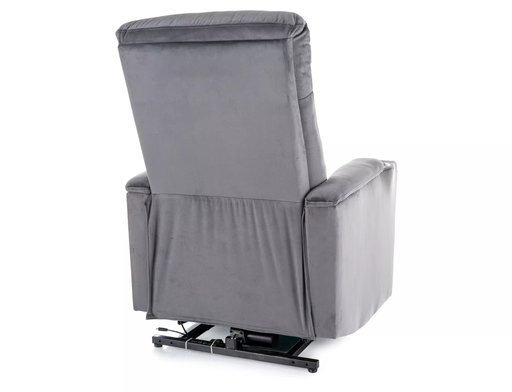 Fotel pionizujący rozkładany elektrycznie, tkanina aksamit: Bluvel 14, stelaż: metal, kolor: szary / czarny. Uchwyt na kubek, praktyczna kieszń na prawym boku, przewodowy pilot sterujący.