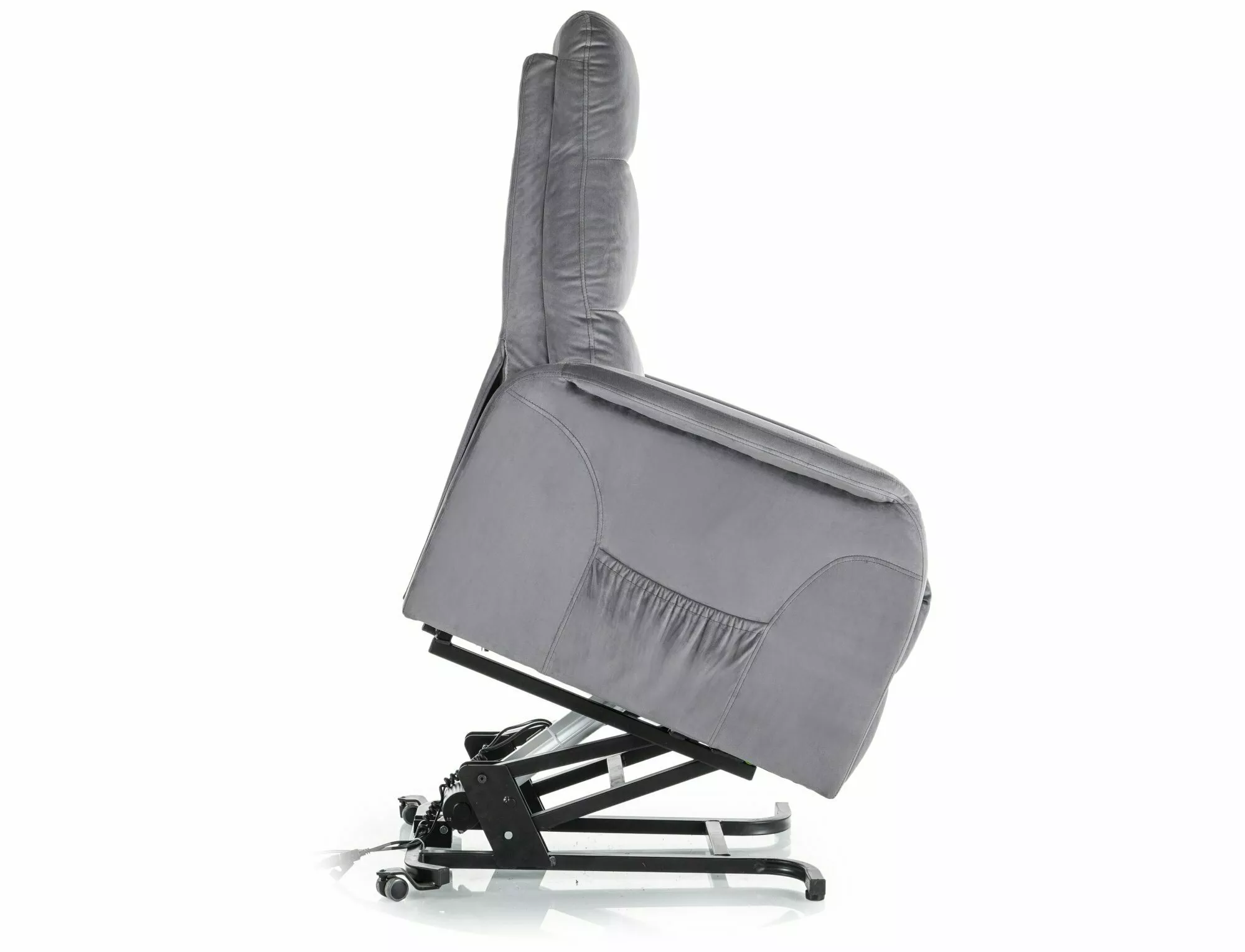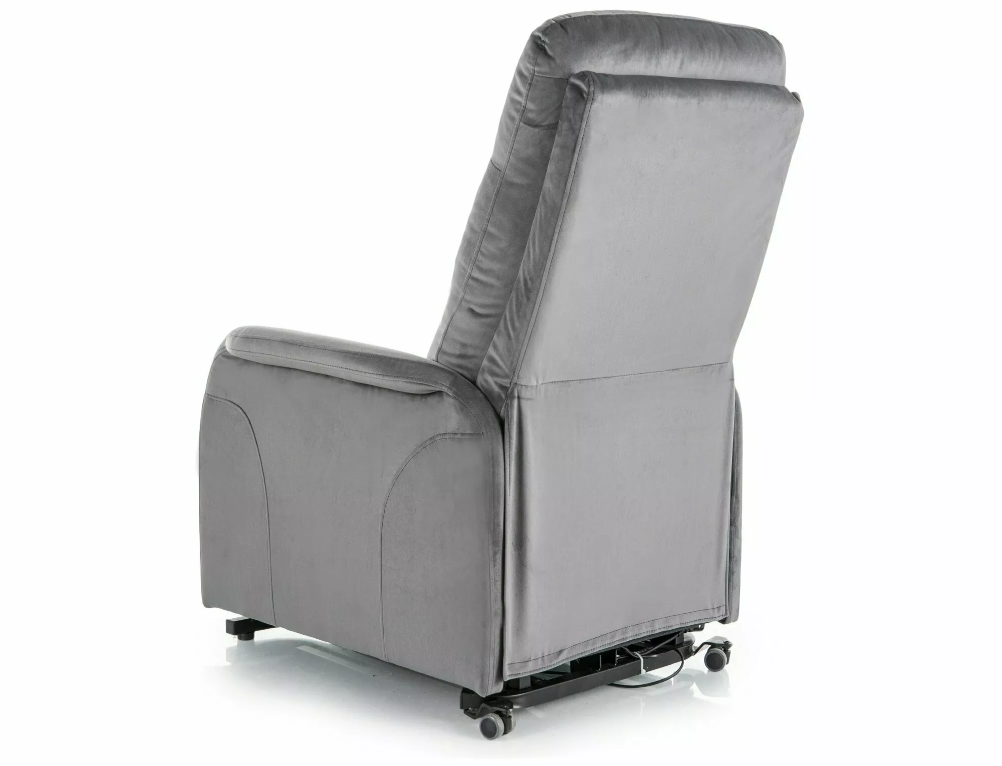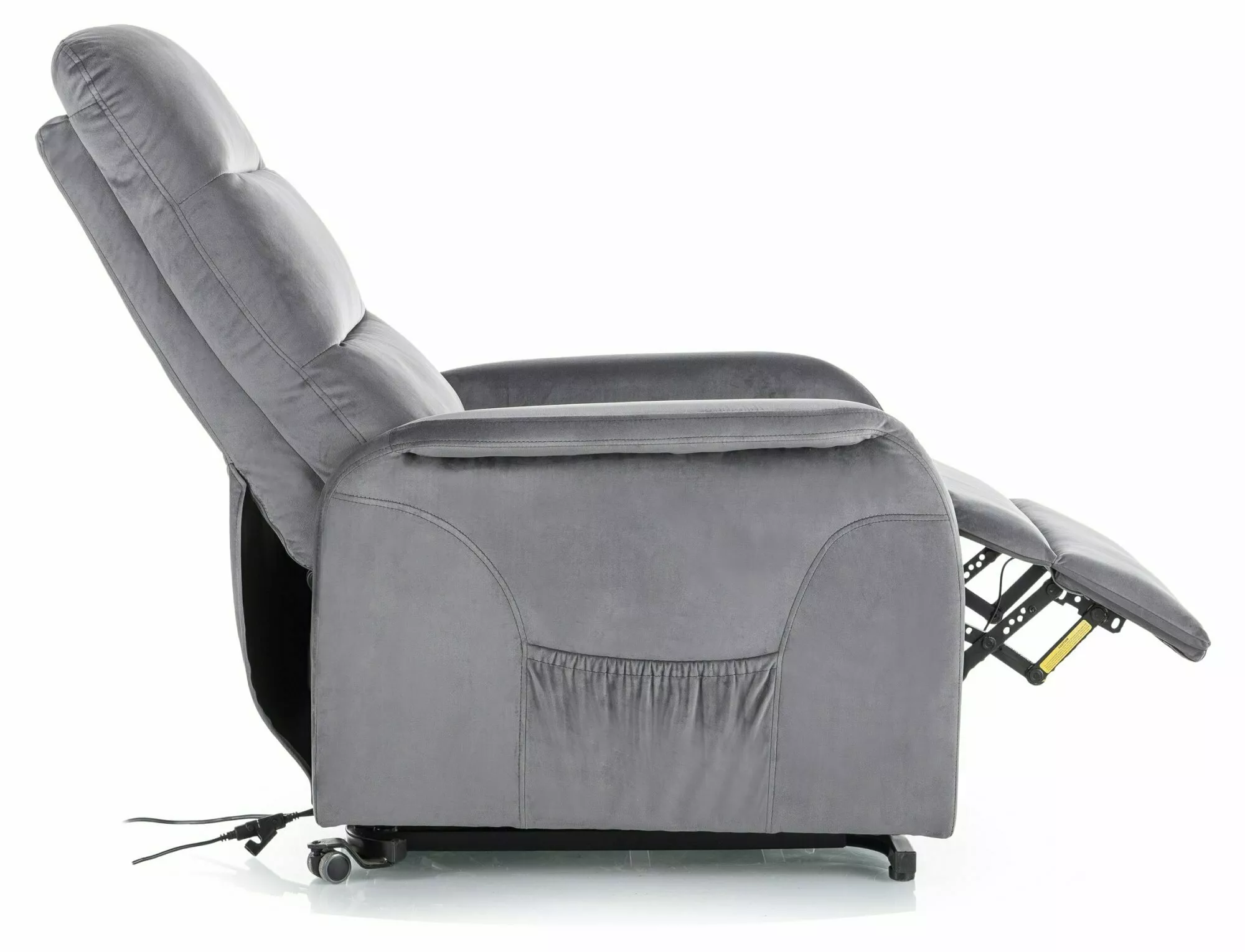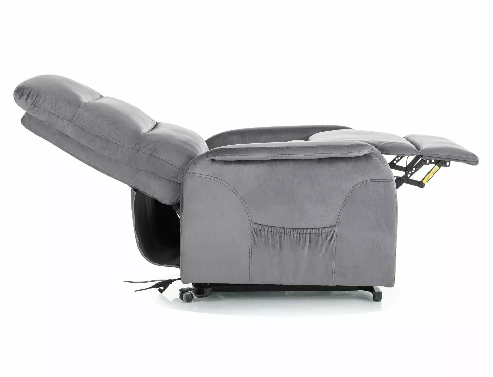 Fotel pionizujący rozkładany elektrycznie z funkcją masażu, tkanina aksamit: Bluvel 14, stelaż: metal, kolor: szary / czarny. Praktyczna kieszeń na prawym boku. Dwa przewodowe piloty sterujące.