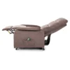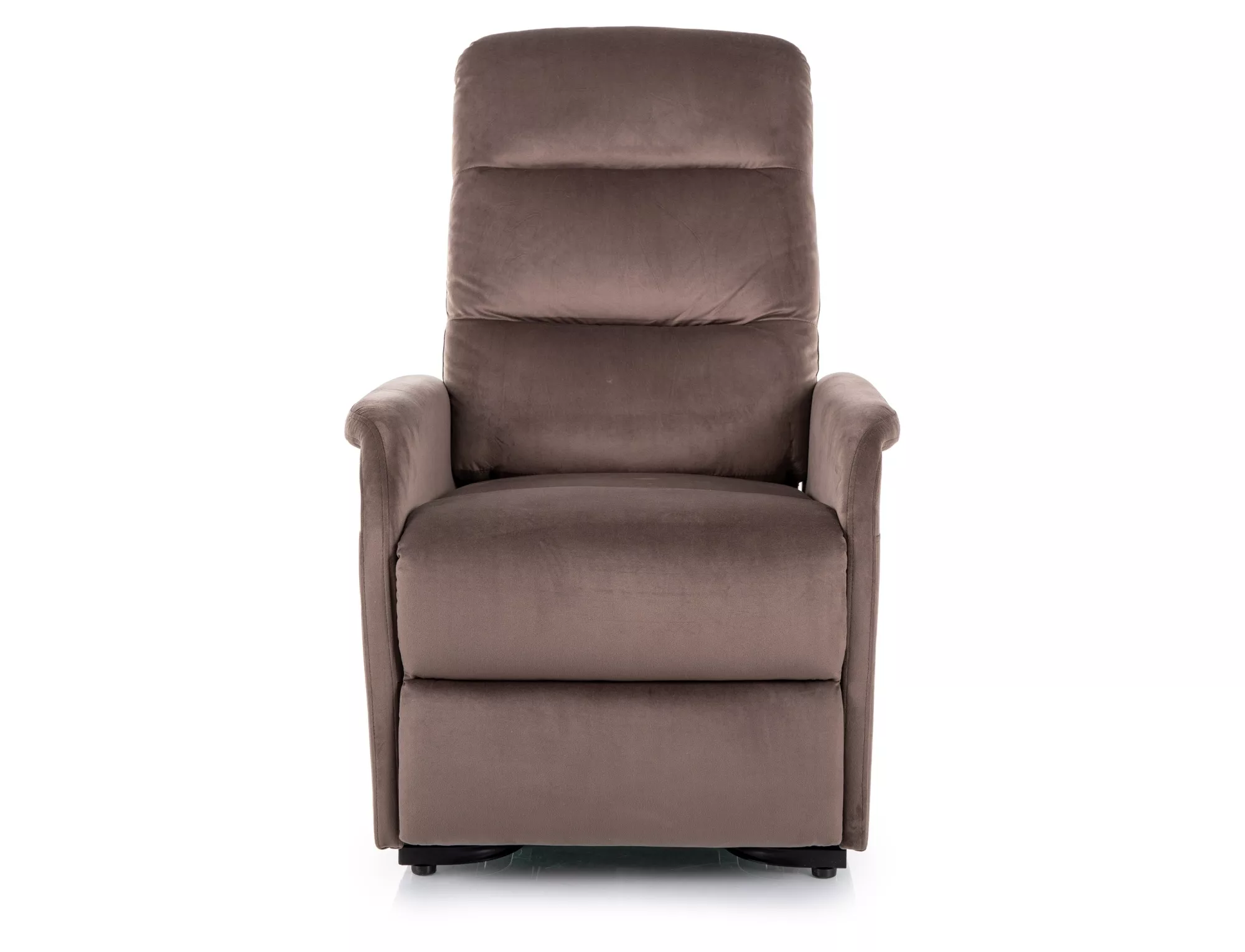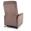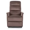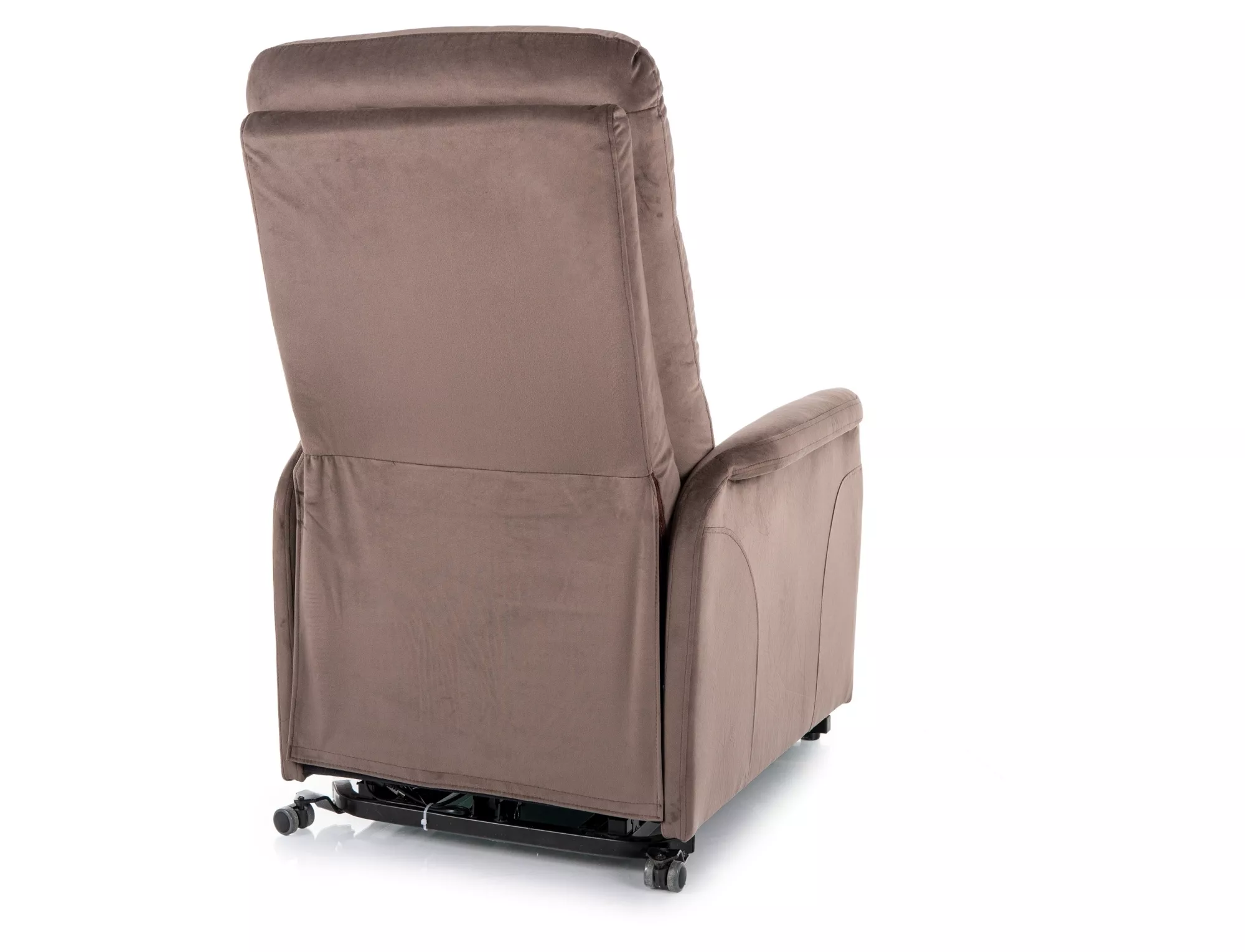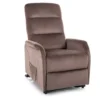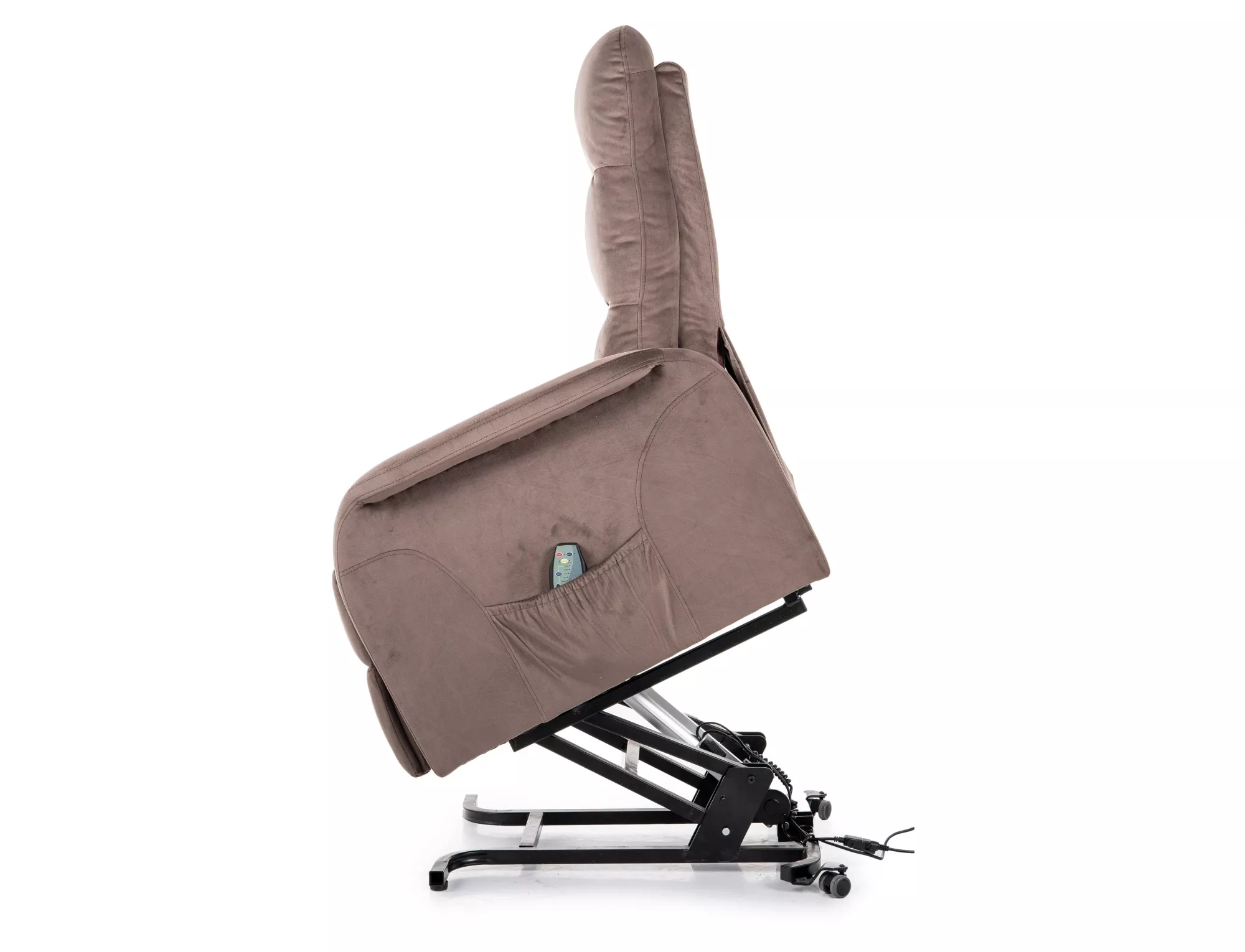 Fotel pionizujący rozkładany elektrycznie z funkcją masażu, tkanina aksamit: Bluvel 38, stelaż: metal, kolor: cappuccino / czarny. Praktyczna kieszeń na prawym boku. Dwa przewodowe piloty sterujące.