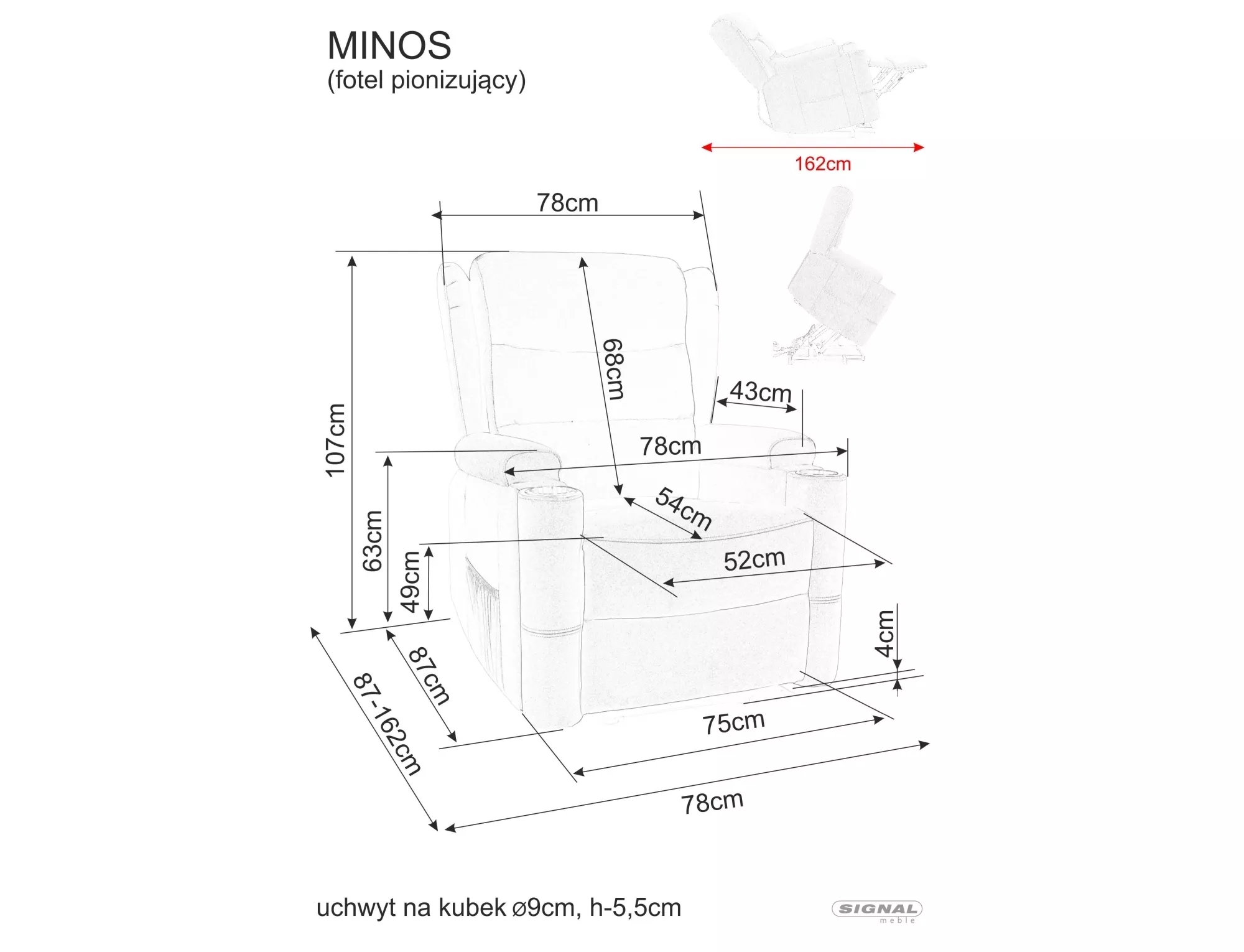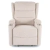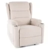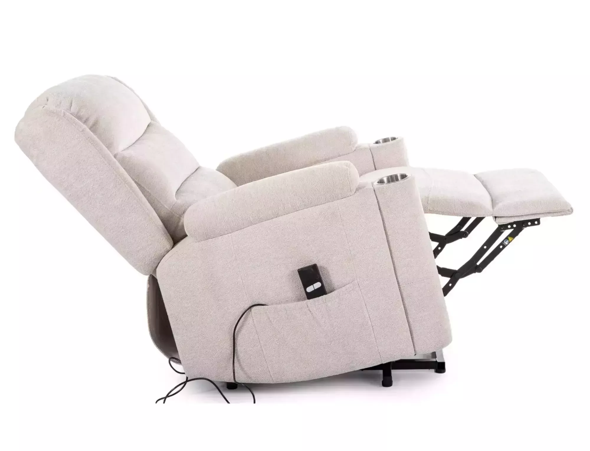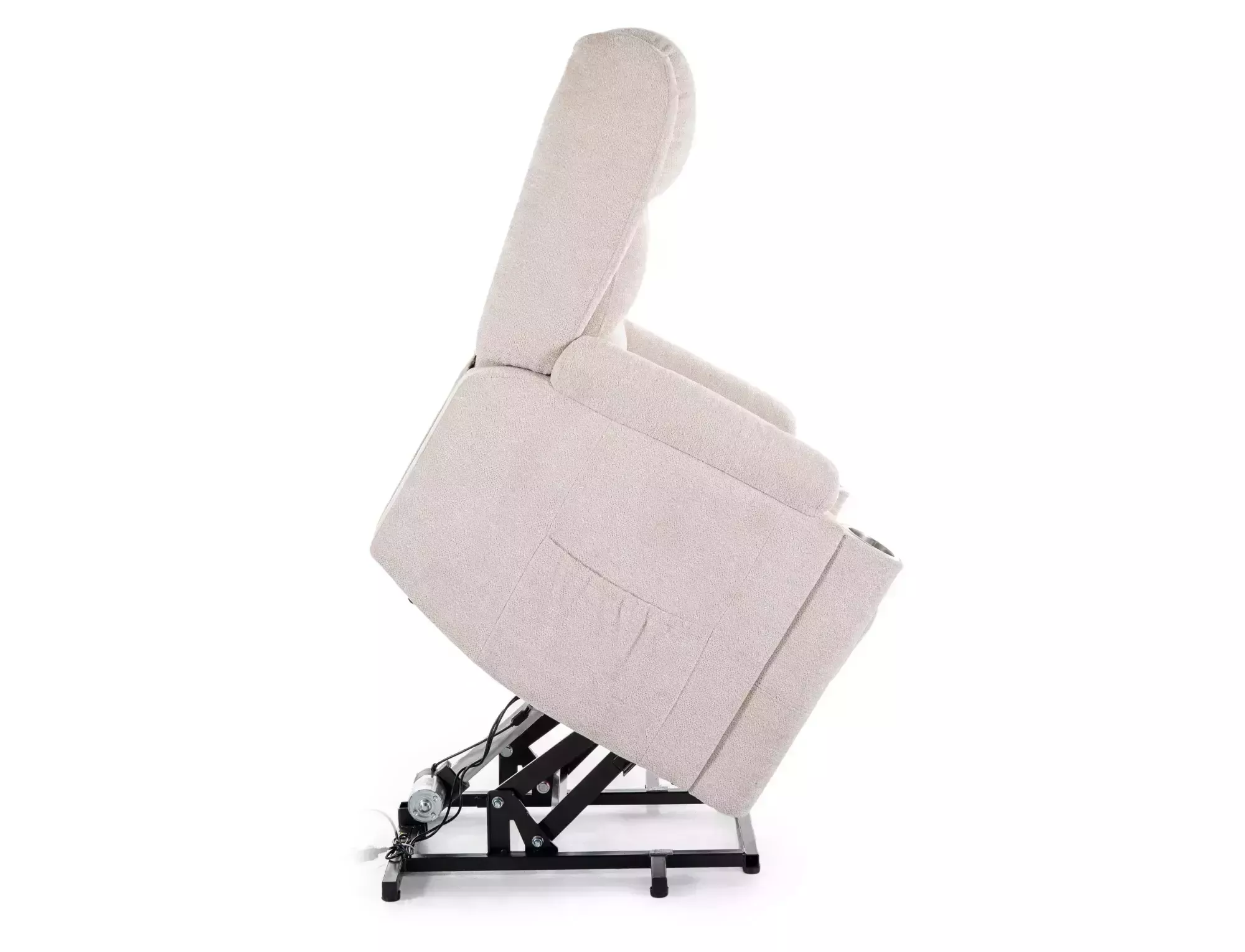 Fotel pionizujący rozkładany elektrycznie, tkanina Raven 24, stelaż: metal, kolor: beżowy / czarny. Uchwyt na kubek, praktyczna kieszń na prawym boku, przewodowy pilot sterujący.
