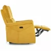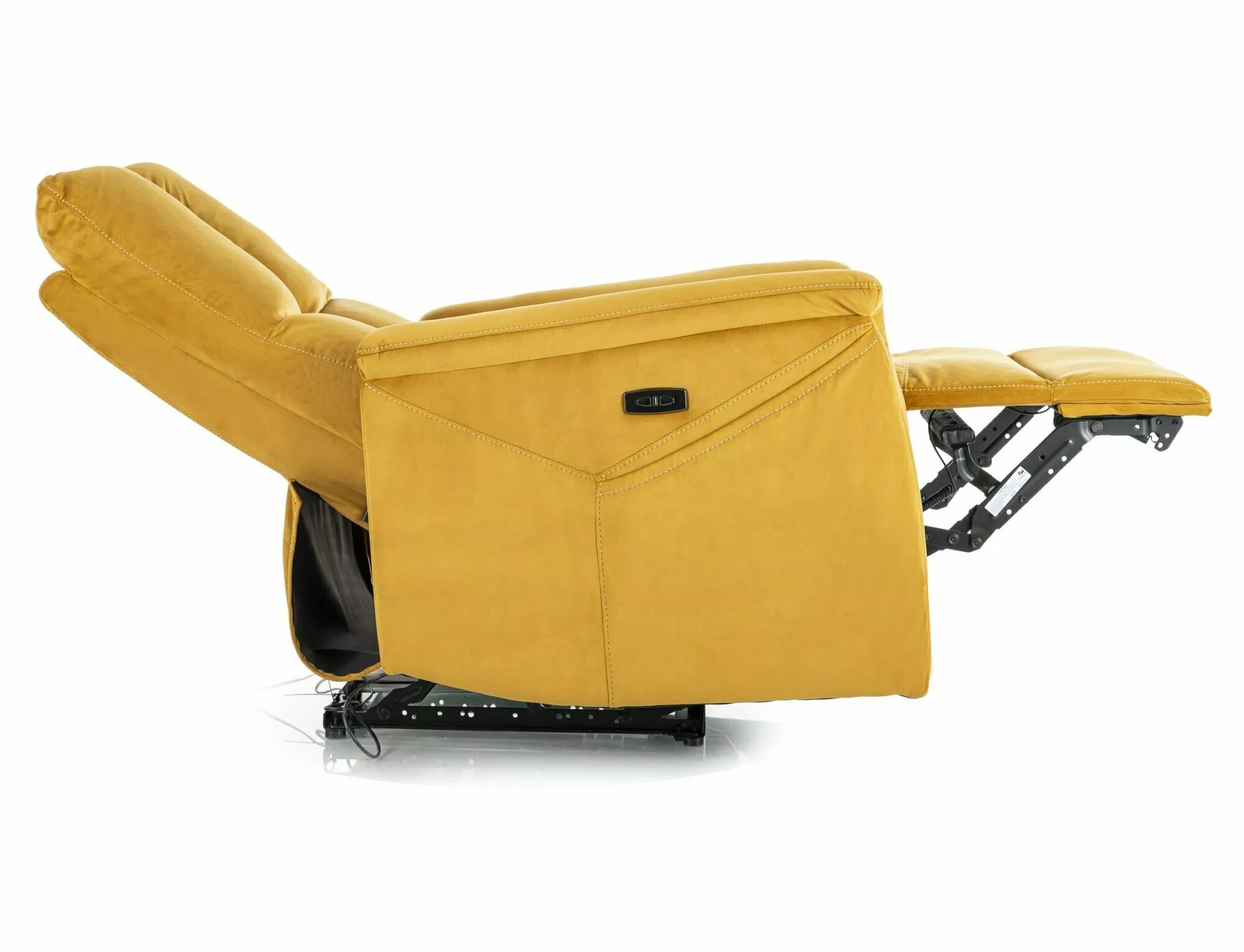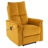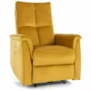 Fotel rozkładany elektrycznie z funkcją masażu i podgrzewania, tkanina aksamit: Bluvel 68, stelaż: metal, kolor: curry / czarny. Rozkładanie sterowane przyciskami na prawym boku, port USB. Funkcje masażu i podrzewania aktywowane przewodowym pilotem.