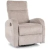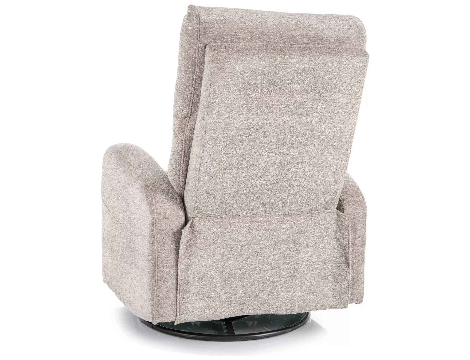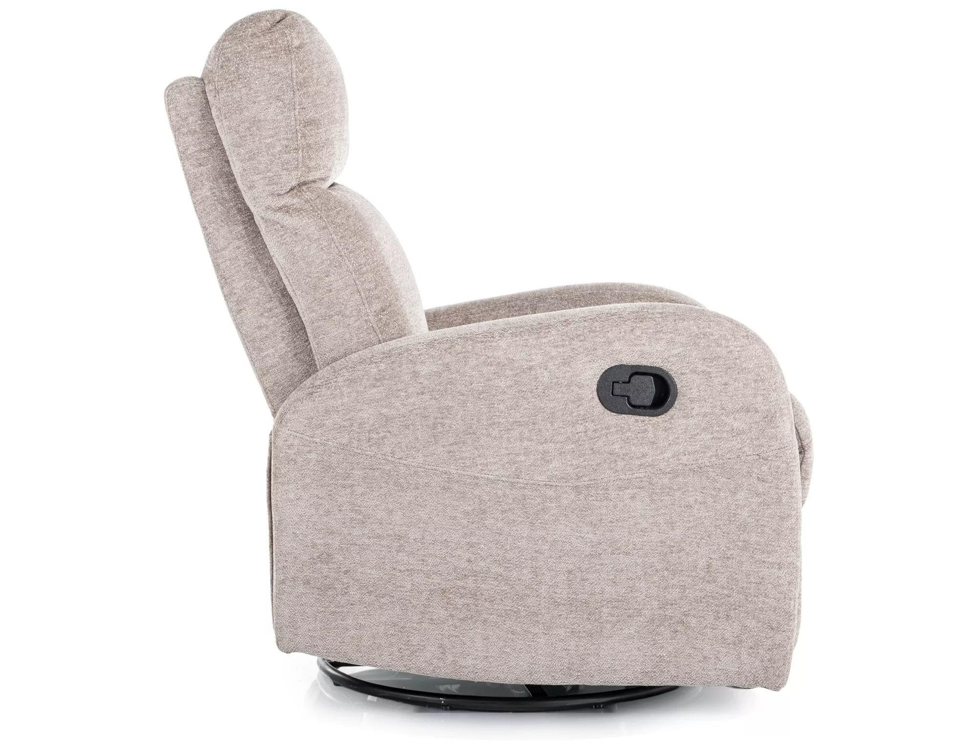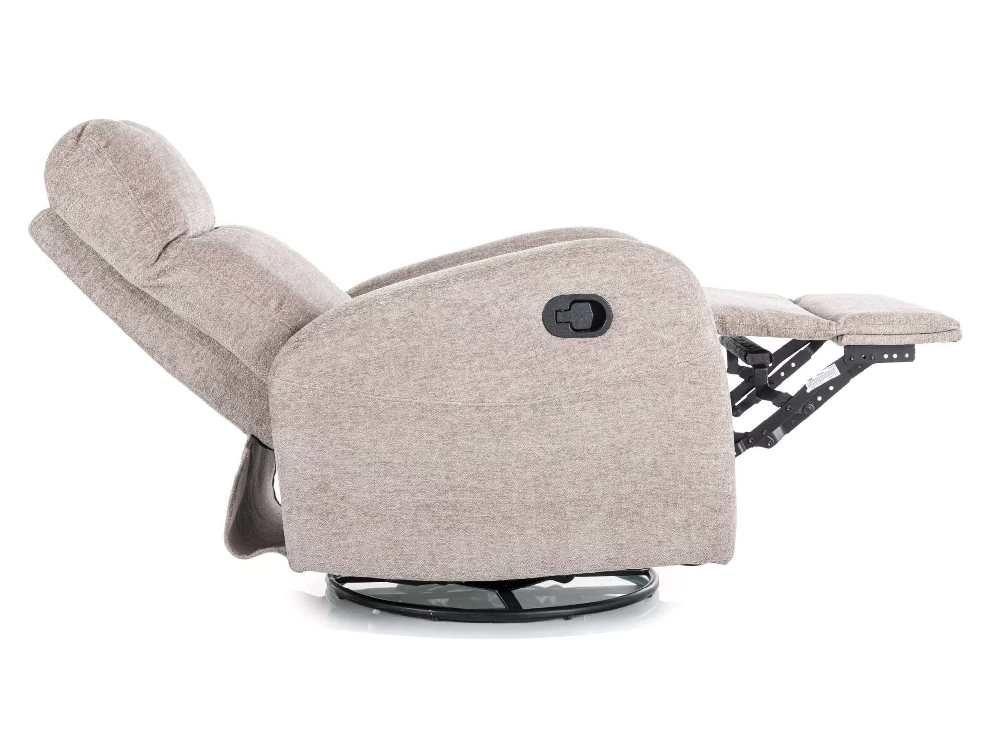 Fotel rozkładany z funkcją kołyski i obrotu, tkanina Raven 30, stelaż: metal, kolor: ciemny beżowy / czarny. Siedzisko obracane w zakresie 360st., opcja kołyski działa w pozycji złożonej.