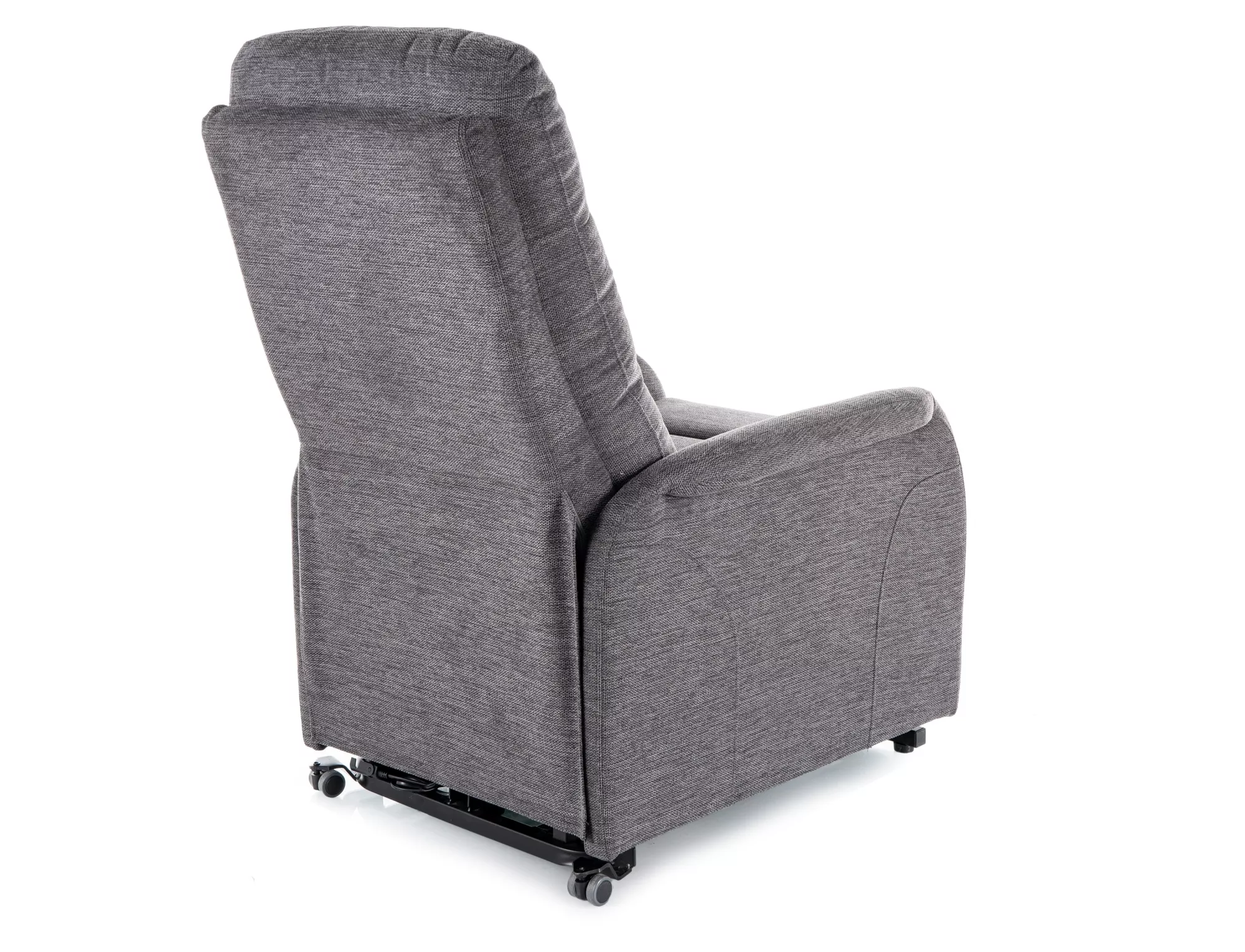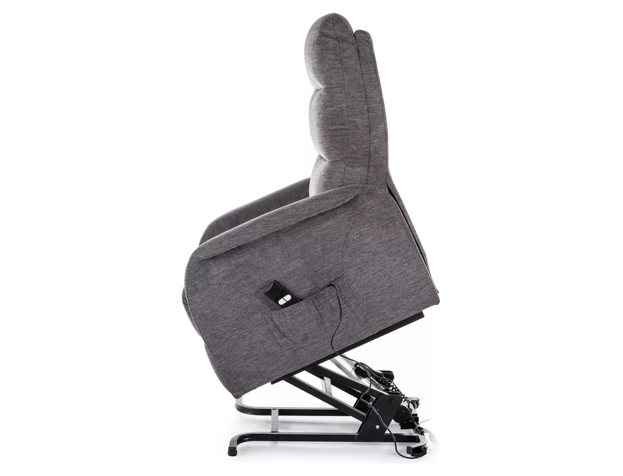 Fotel pionizujący rozkładany elektrycznie z funkcją masażu, tkanina Brego 18, stelaż: metal, kolor: ciemny szary / czarny. Praktyczna kieszeń na prawym boku. Dwa przewodowe piloty sterujące.