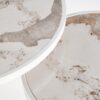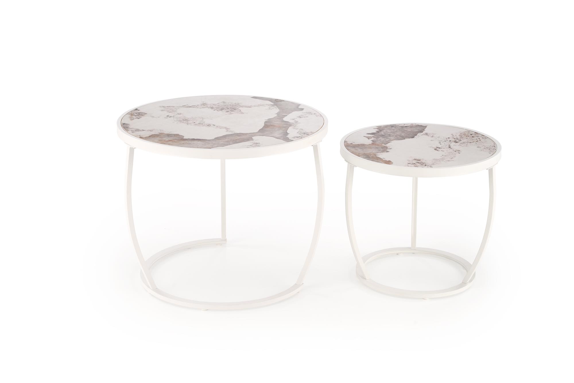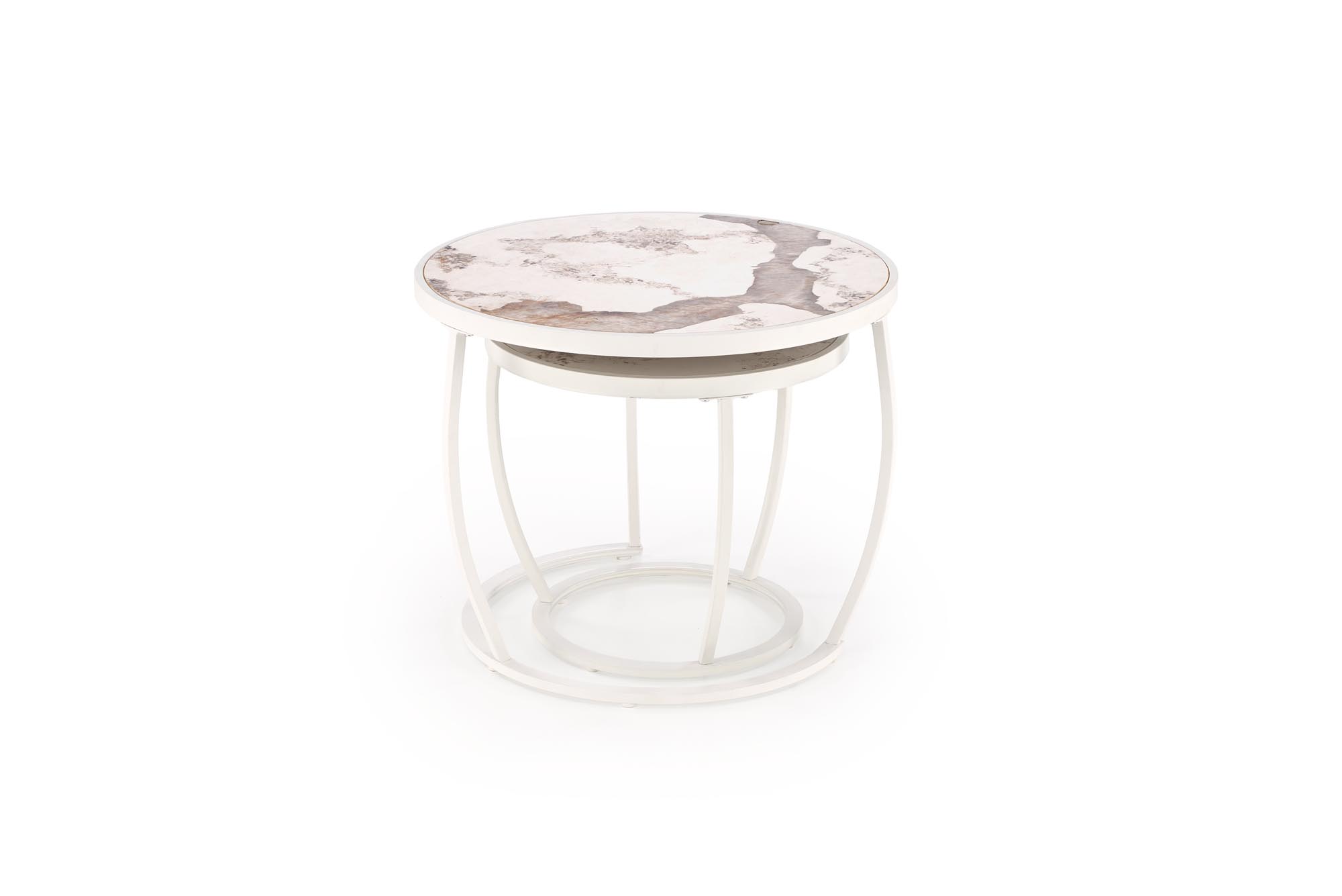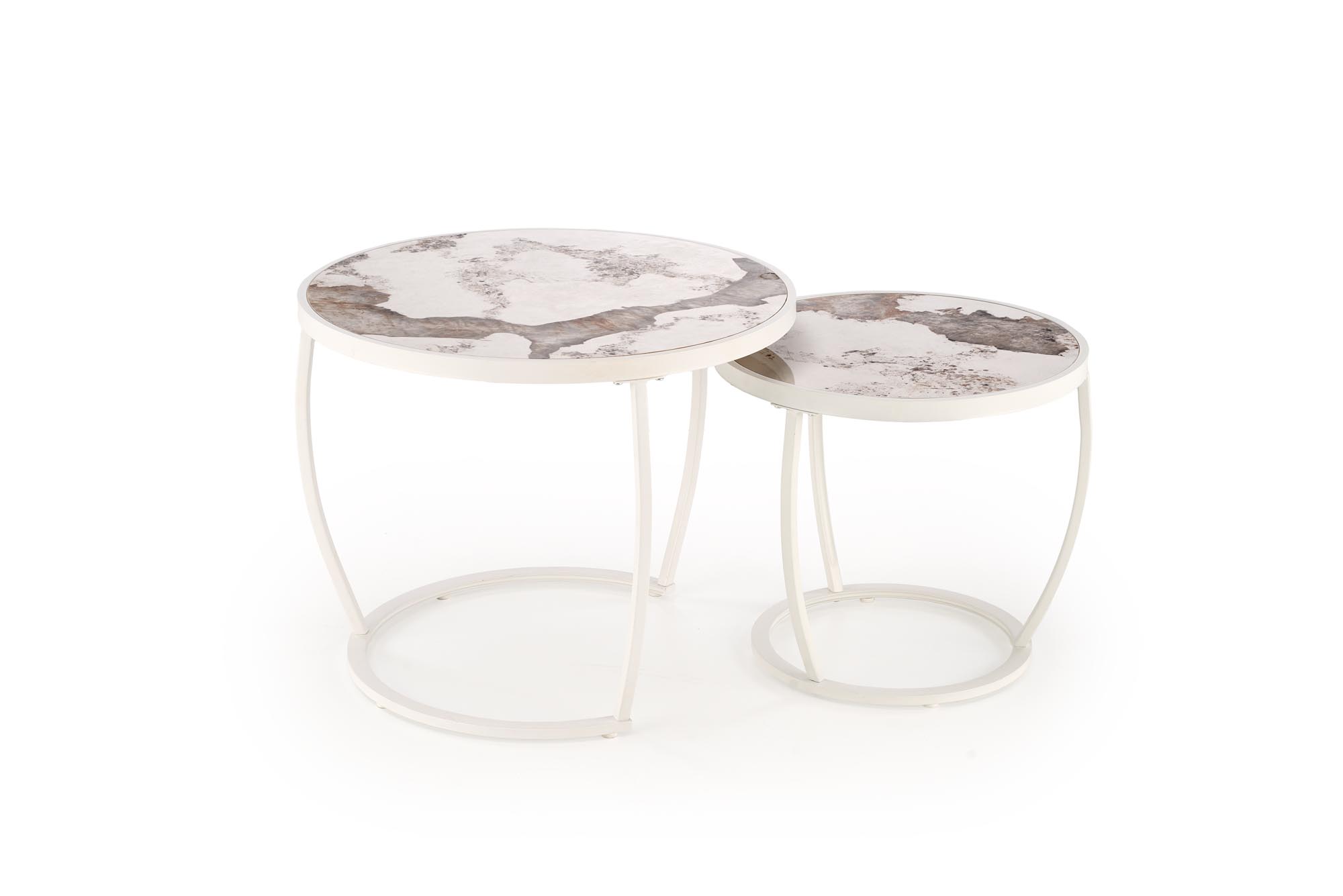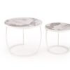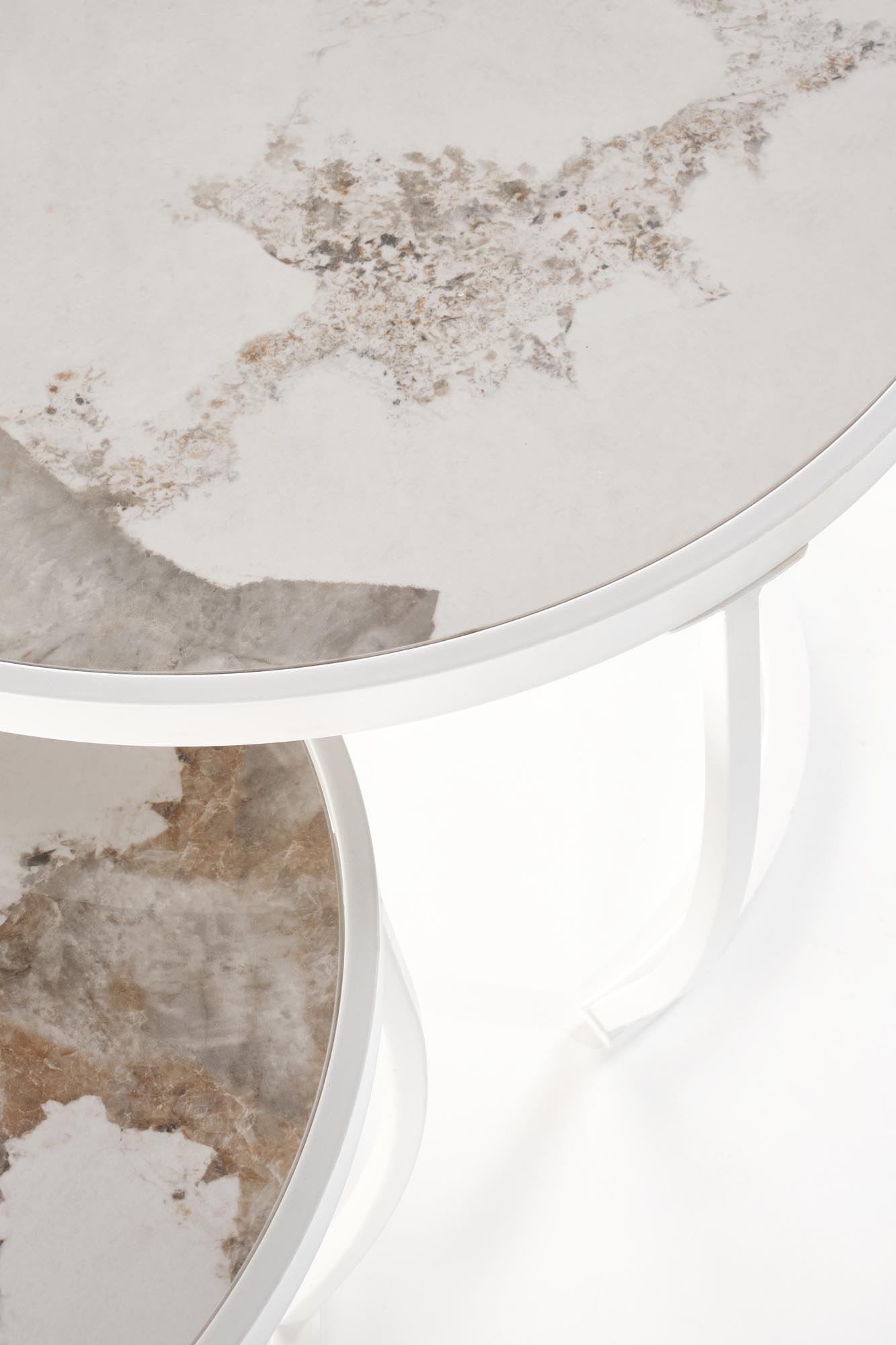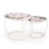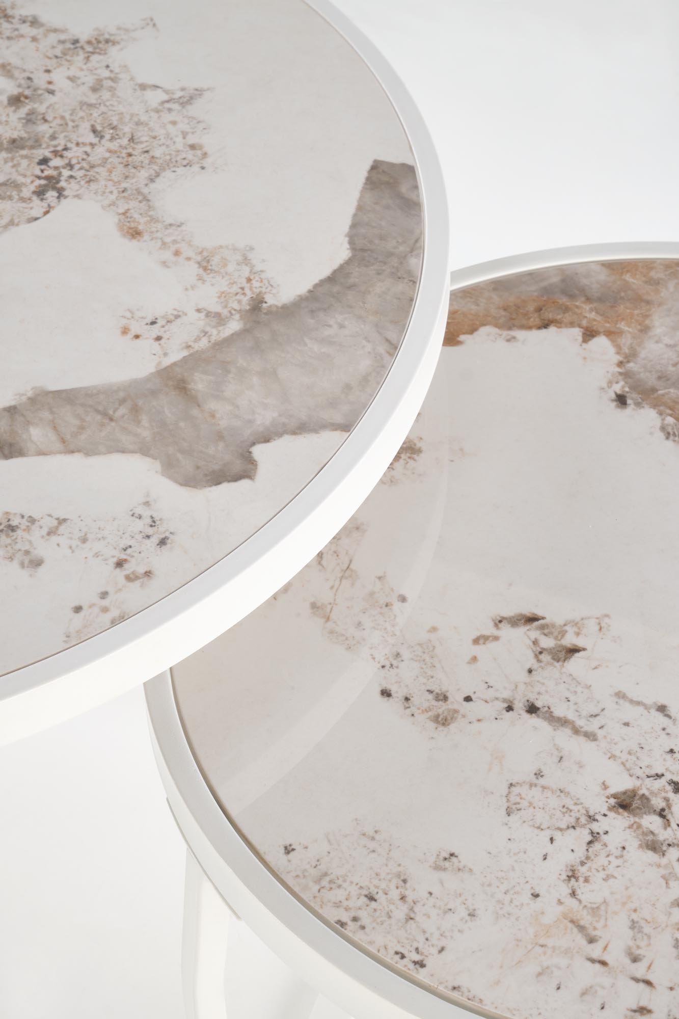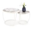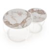 wymiary: 62/50 cm oraz 47/43 cm; zestaw 2 ław, materiał: spiek / stal malowana proszkowo, kolory: beżowy marmur / biały