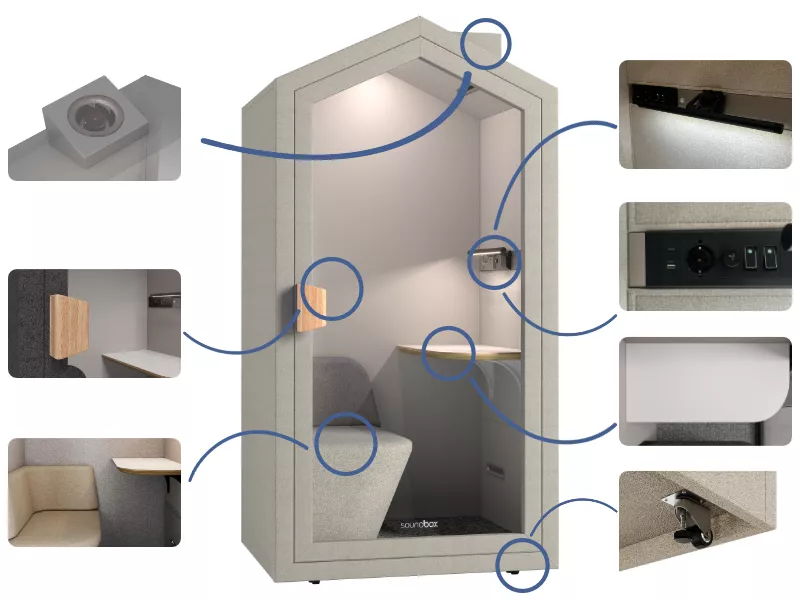Nowoczesna wygłuszająca kabina akustyczna to absolutny must have w nowoczesnych wnętrzach biur typu open space, urzędach, lotniskach, hotelach jak i również w domach. Kabina zapewnia możliwość prowadzenia rozmów telefonicznych lub telekonferencji w komfortowych warunkach w których można skupić się na rozmowie oraz prowadzić ją nie przeszkadzając współpracownikom lub domownikom. Przeszklone drzwi sprawiają, że kabina wygląda niezwykle lekko i ozdabia wnętrze w którym się znajduje. Niewielka praktyczna budka telefoniczna sprawdzi się w nowoczesnym biurze charakteryzującym się innowacyjnością jak i domu jako komfortowe miejsce do pracy online, nauki lub rozmów telefonicznych. Kabina została wykonana z wysokogatunkowych surowców zapewniających odpowiednie wygłuszenie. Wewnętrzny design i wykończenie zachęcają do korzystania z tego komfortowego miejsca zawsze gdy zajdzie taka potrzeba.