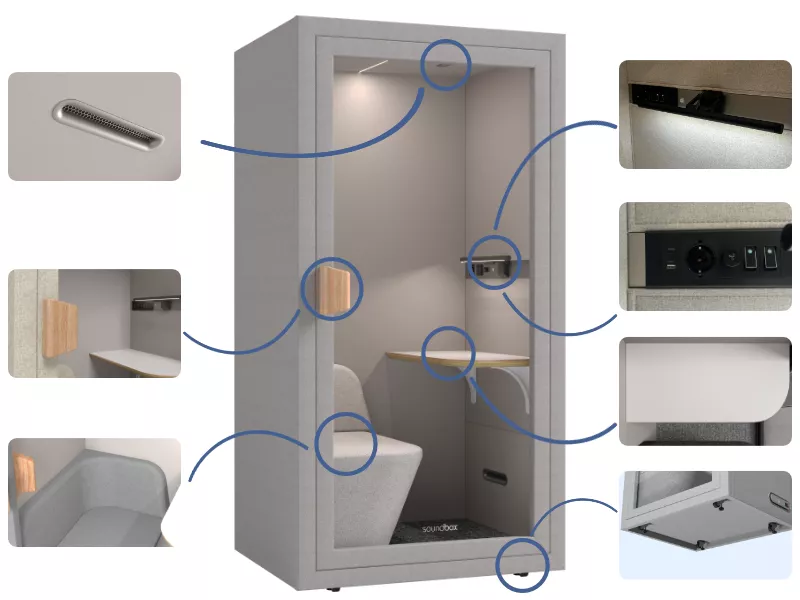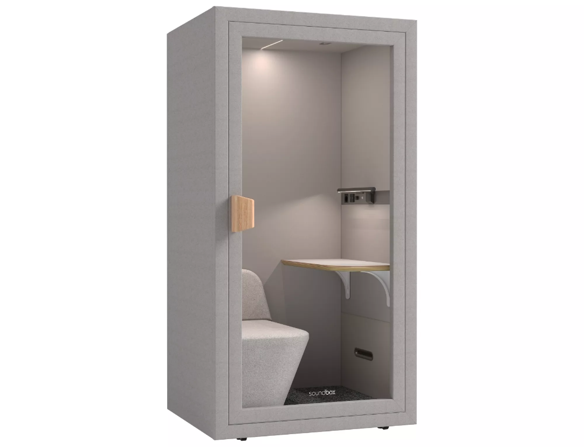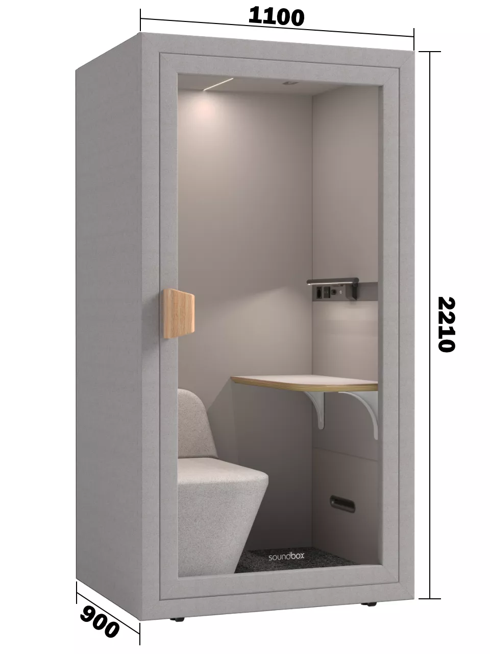 Nowoczesna wygłuszająca kabina akustyczna to absolutny must have w nowoczesnych wnętrzach biur typu open space, urzędach, lotniskach, hotelach jak i również w domach. Kabina zapewnia możliwość prowadzenia rozmów telefonicznych lub telekonferencji w komfortowych warunkach w których można skupić się na rozmowie oraz prowadzić ją nie przeszkadzając współpracownikom lub domownikom. Przeszklone drzwi sprawiają, że kabina wygląda niezwykle lekko i ozdabia wnętrze w którym się znajduje. Niewielka praktyczna budka telefoniczna sprawdzi się w nowoczesnym biurze charakteryzującym się innowacyjnością jak i domu jako komfortowe miejsce do pracy online, nauki lub rozmów telefonicznych. Kabina została wykonana z wysokogatunkowych surowców zapewniających odpowiednie wygłuszenie. Wewnętrzny design i wykończenie zachęcają do korzystania z tego komfortowego miejsca zawsze gdy zajdzie taka potrzeba.