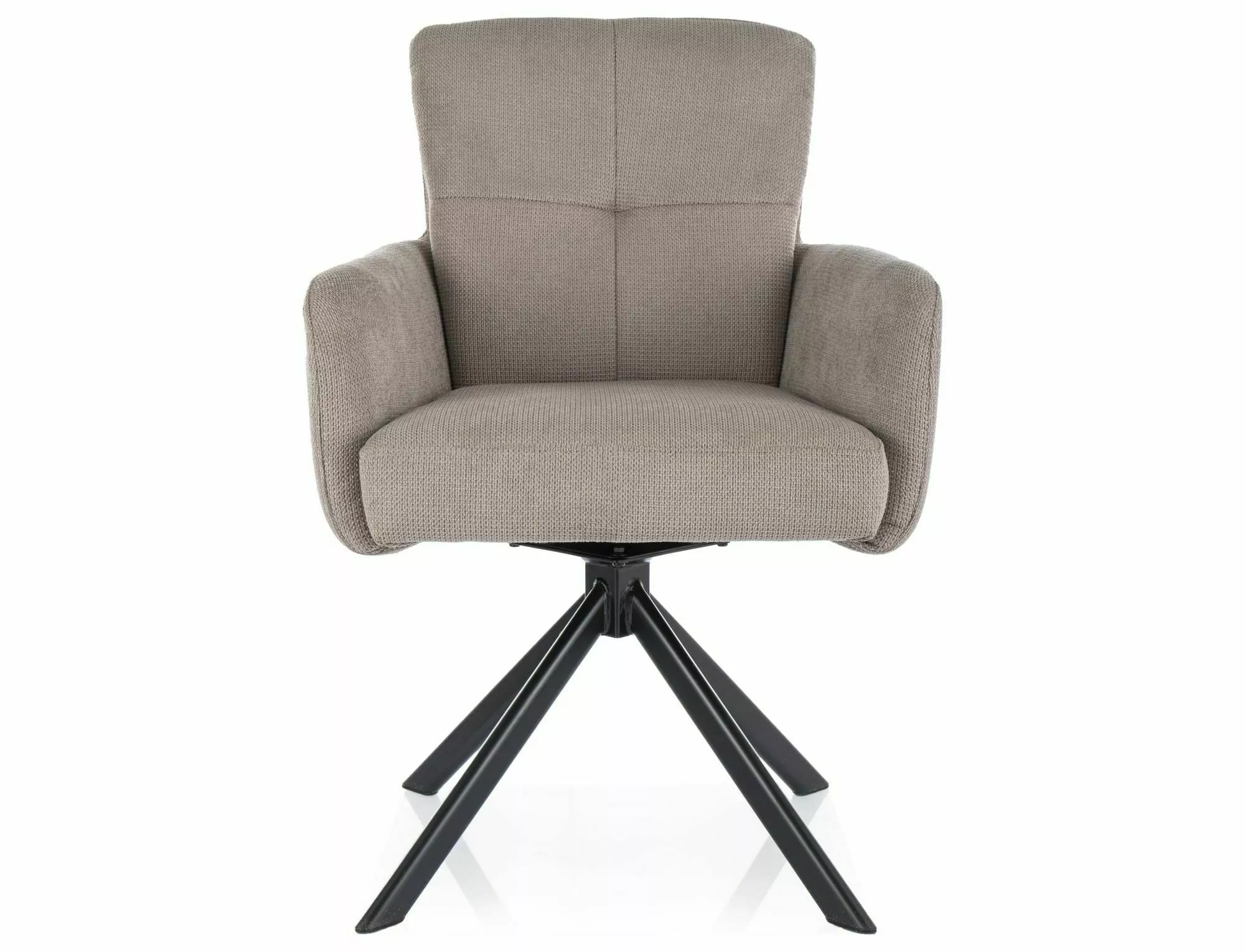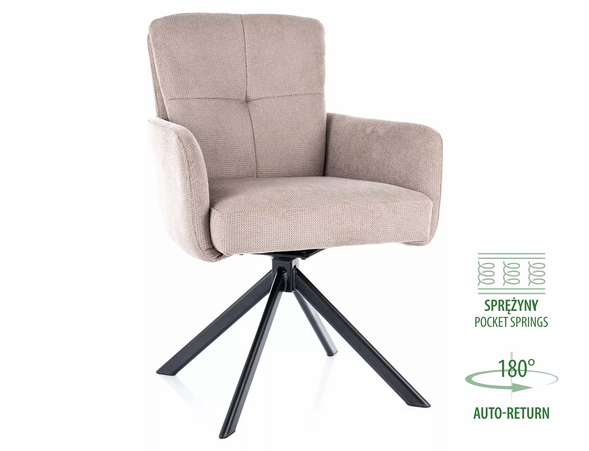 Krzesło, tapicerka: tkanina Vardo, stelaż: metal, kolor: 34 beżowy / czarny mat. Funkcja auto-return – siedzisko obracane w zakresie 180st, z funkcją powrotu do pierwotnej pozycji. Sprężyny kieszeniowe w siedzisku.