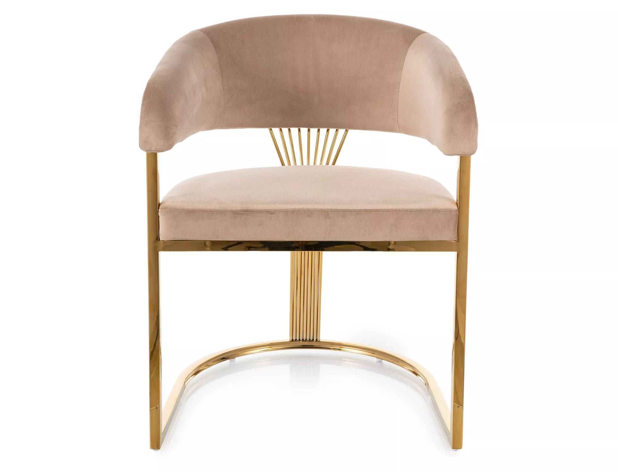 Krzesło, tapicerka: tkanina aksamit: Bluvel 28, stelaż: stal nierdzewna, kolor: beżowy / złoty.