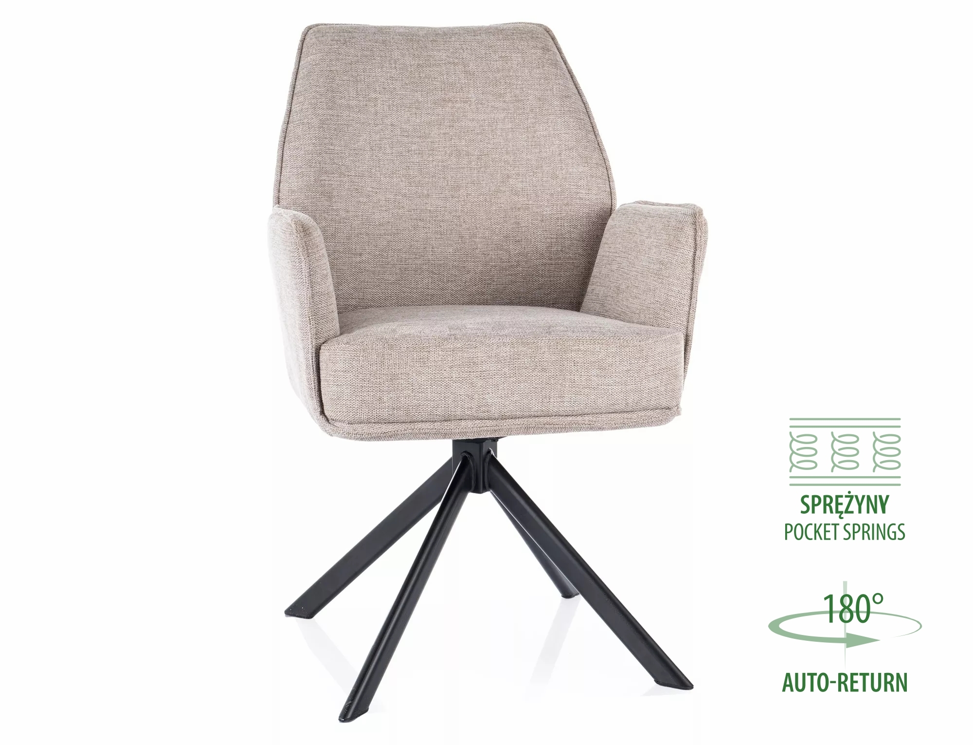 Krzesło, tapicerka: tkanina Brego, stelaż: metal, kolor: 31 jasny beżowy / czarny mat. Funkcja auto-return – siedzisko obracane w zakresie 180st, z funkcją powrotu do pierwotnej pozycji. Sprężyny kieszeniowe w siedzisku.