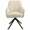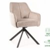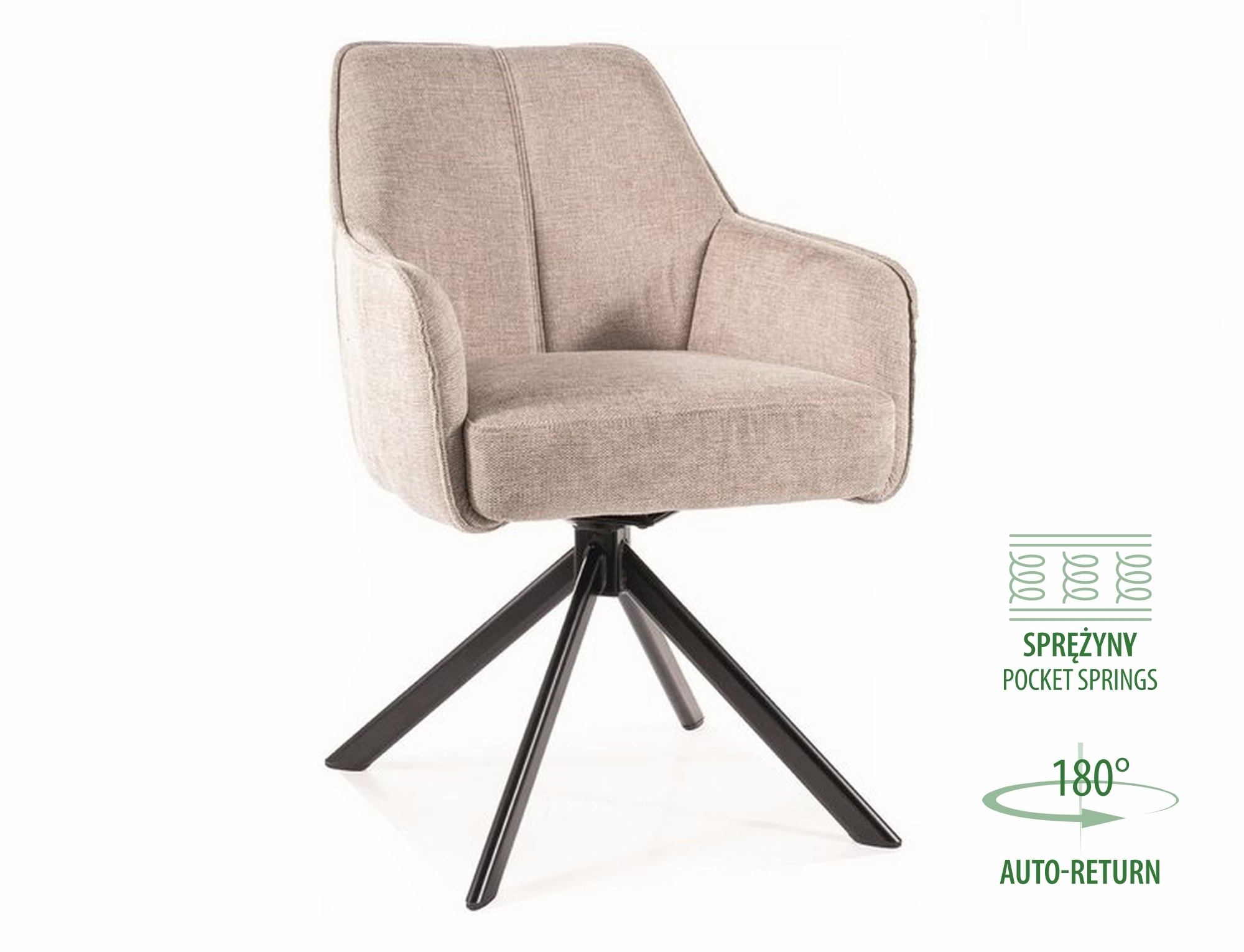 Krzesło, tkanina Brego, kolor: jasny beż 31, stelaż: metal, czarny mat. Siedzisko obracane w zakresie 180st, z funkcją powrotu do pierwotnej pozycji. Siedzisko wyposażone w sprężyny kieszeniowe.