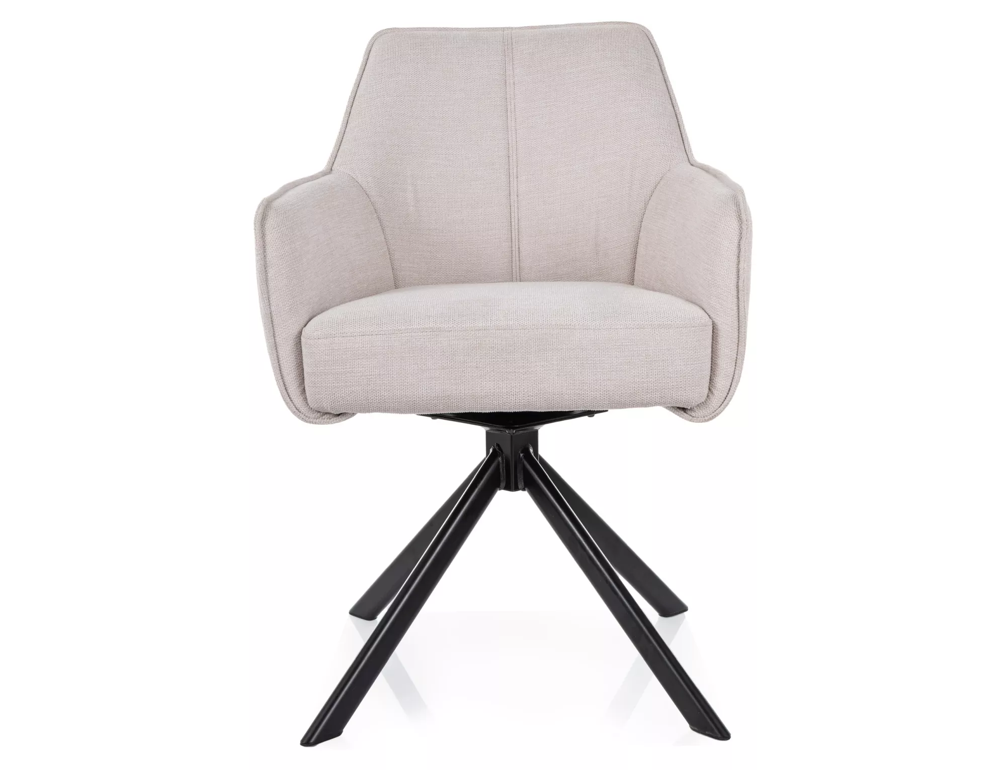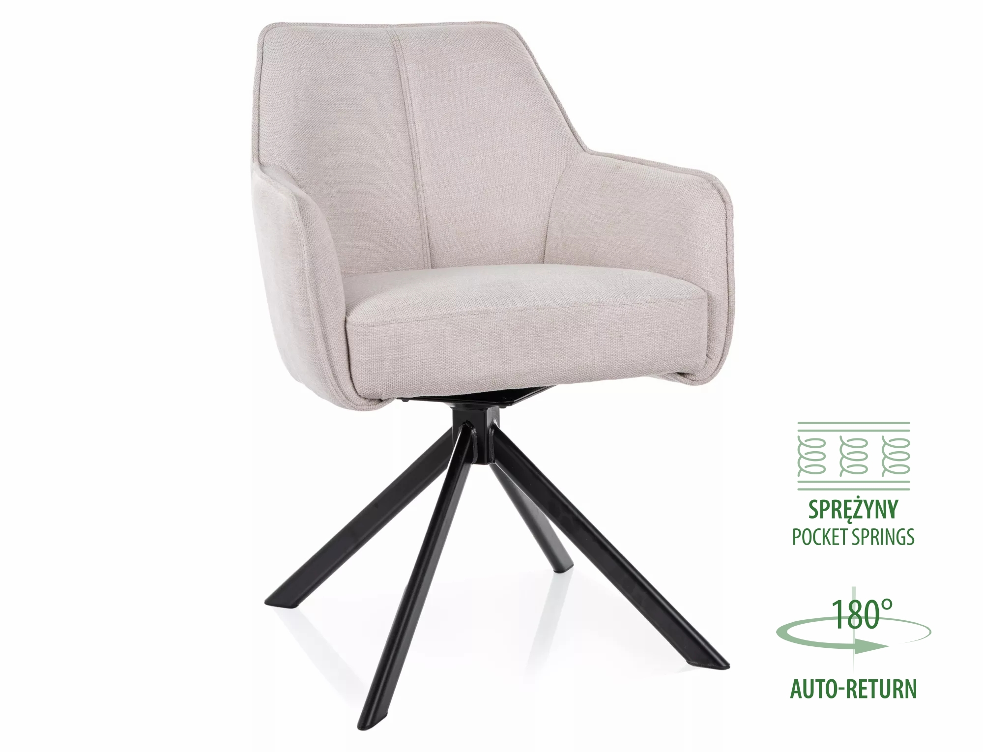 Krzesło, tapicerka: tkanina Brego 22, stelaż: metal, kolor: jasny beżowy / czarny metal.Funkcja auto-return – siedzisko obracane w zakresie 180st, z funkcją powrotu do pierwotnej pozycji. Sprężyny kieszeniowe w siedzisku.