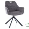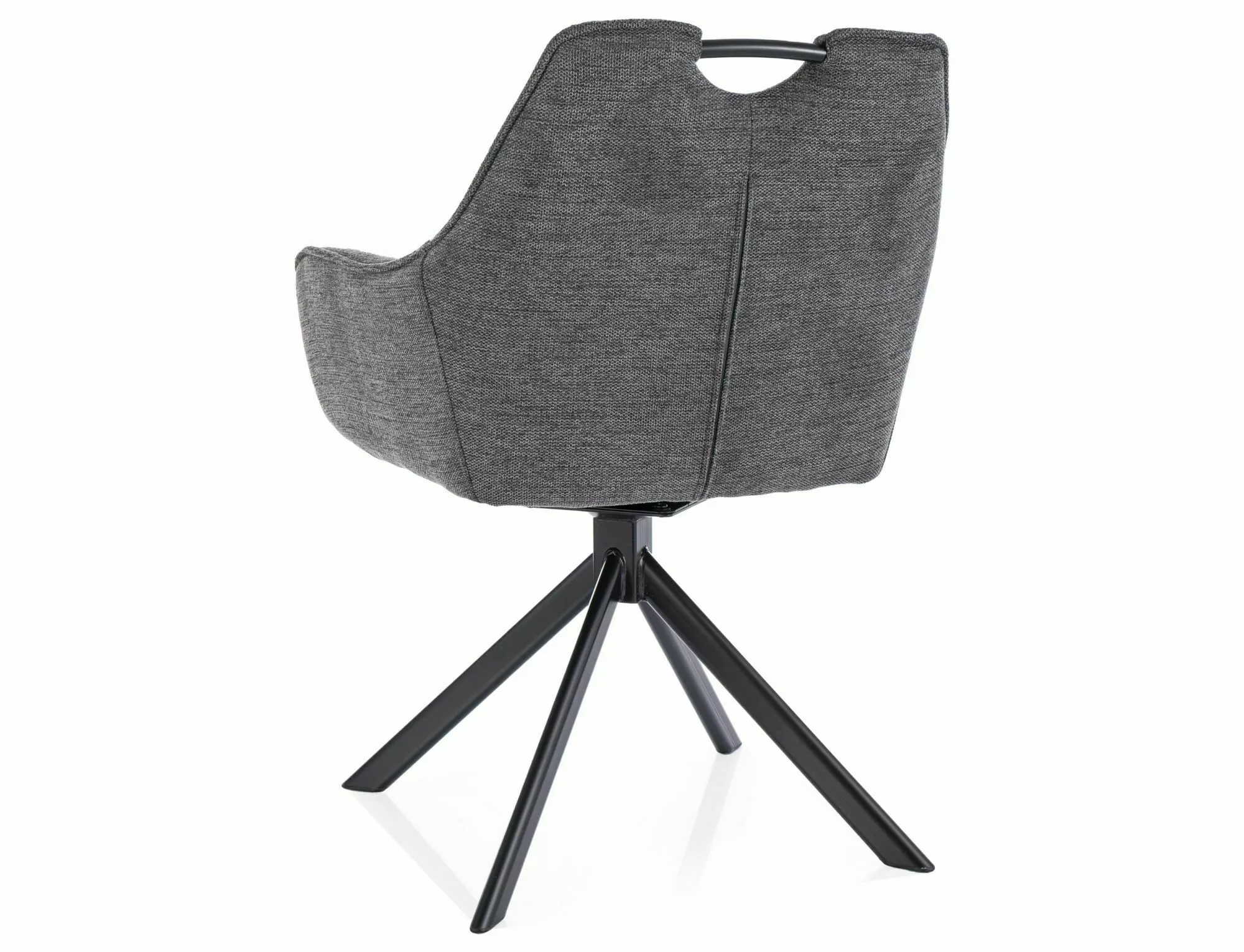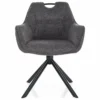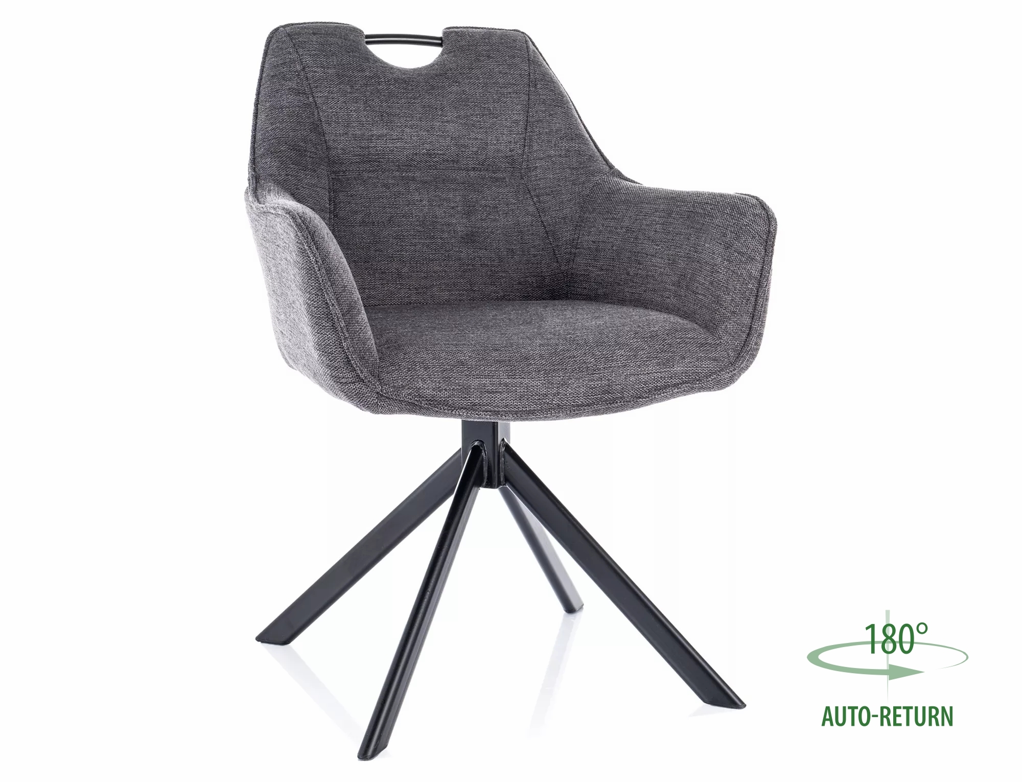 Krzesło, tapicerka: tkanina Brego, stelaż: metal, kolor: 18 ciemny szary / czarny mat. Funkcja auto-return – siedzisko obracane w zakresie 180st, z funkcją powrotu do pierwotnej pozycji. Rączka na szczycie oparcia.
