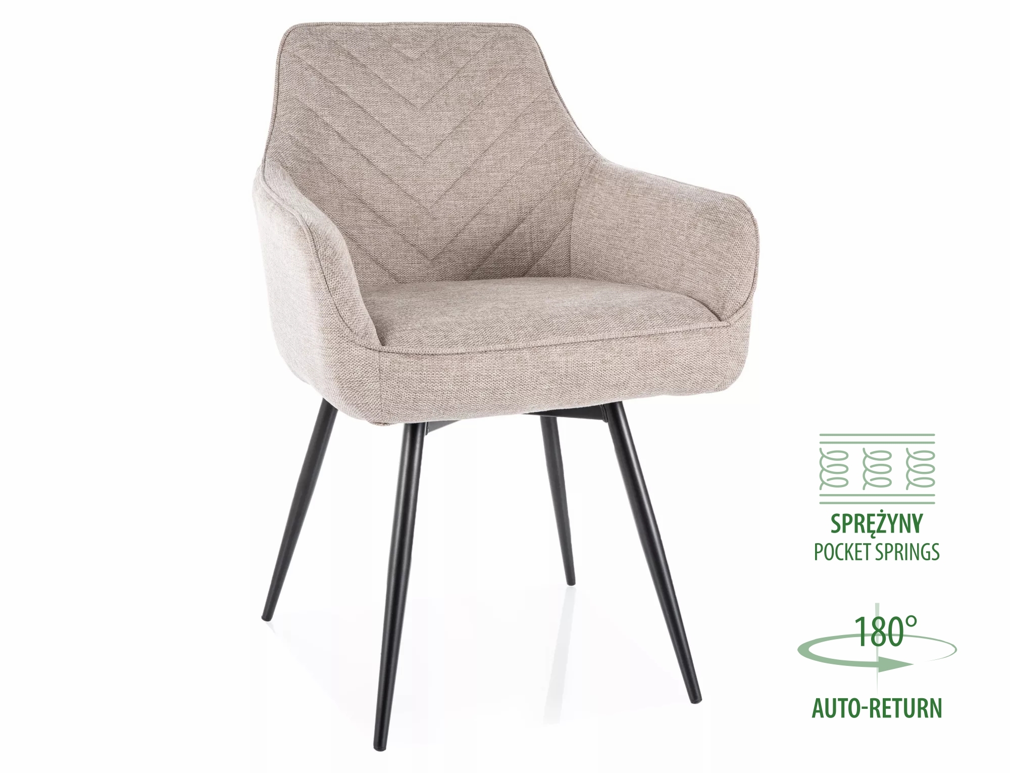 Krzesło, tapicerka: tkanina Brego 31, stelaż: metal, kolor: jasny beżowy / czarny mat.Funkcja auto-return – siedzisko obracane w zakresie 180st, z funkcją powrotu do pierwotnej pozycji. Sprężyny kieszeniowe w siedzisku.