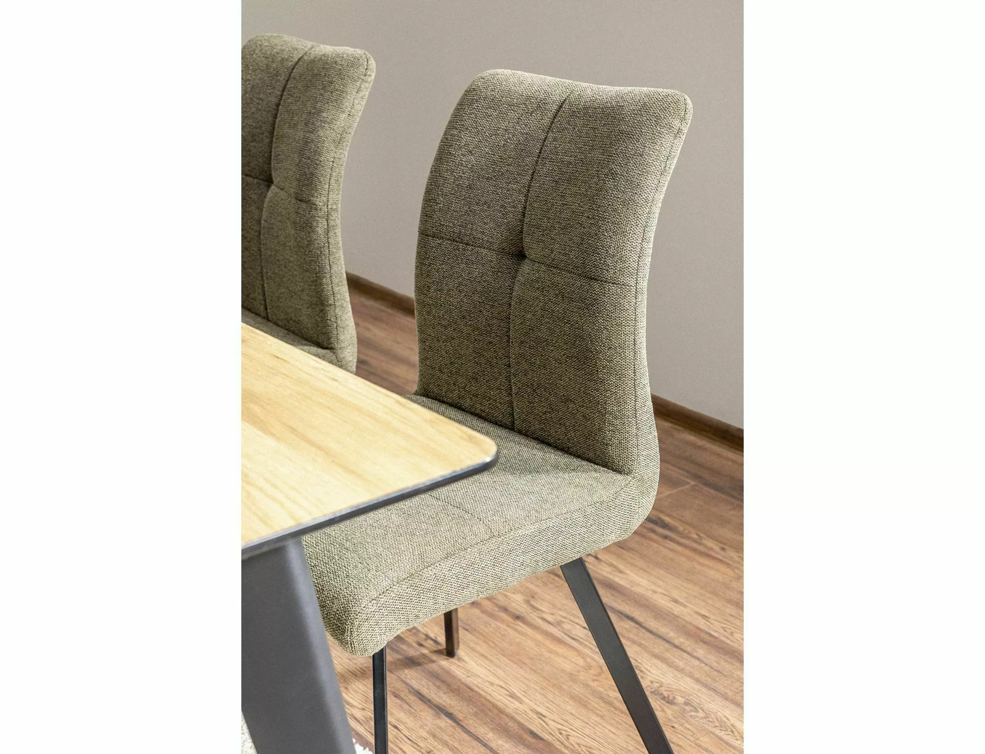 Krzesło, tapicerka: tkanina Brego, stelaż: metal, kolor: 77 oliwkowy / czarny mat. Rączka na tyle oparcia.