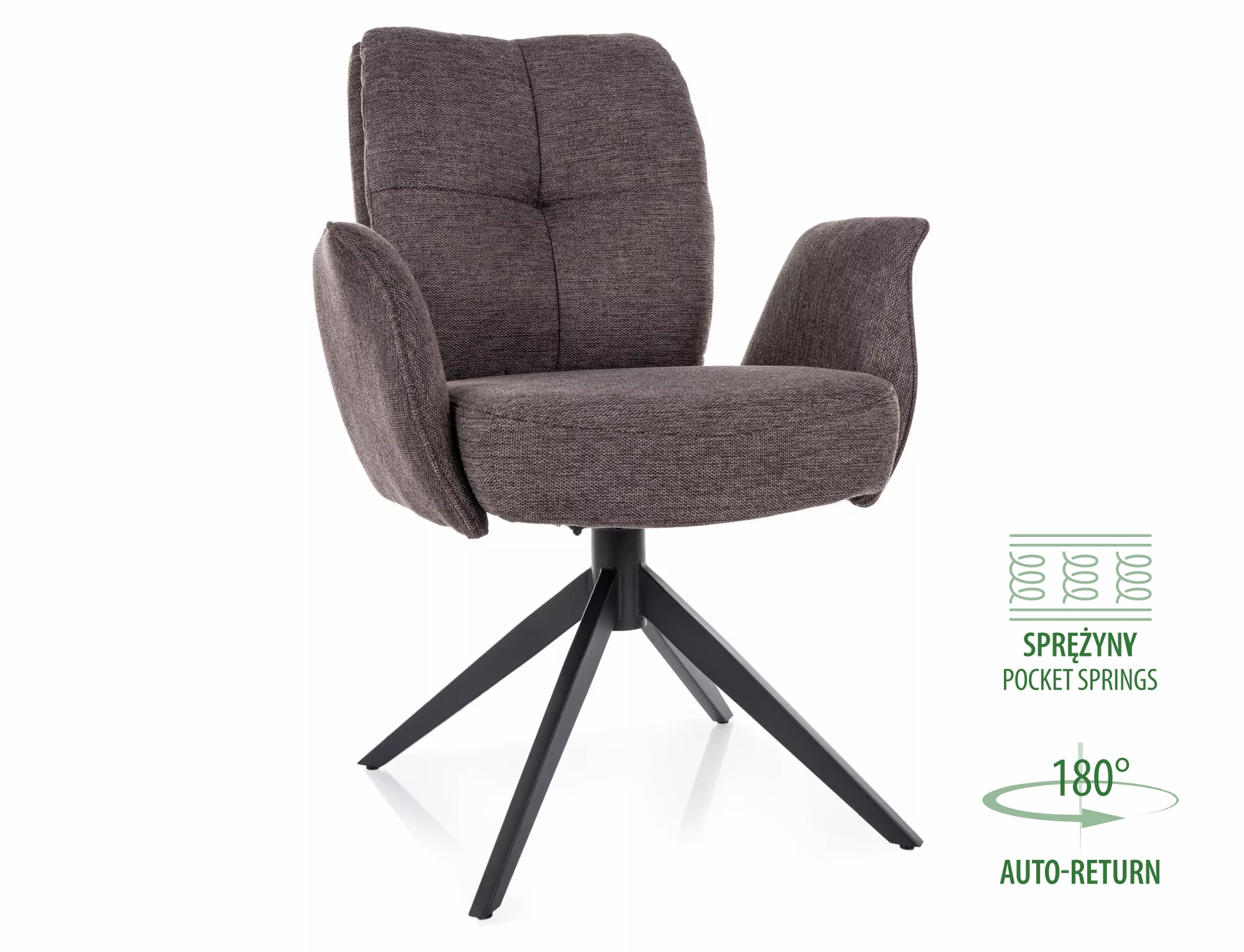 Krzesło, tapicerka: tkanina Brego 40, stelaż: metal, kolor: cappuccino / czarny mat.Funkcja auto-return – siedzisko obracane w zakresie 180st, z funkcją powrotu do pierwotnej pozycji. Sprężyny kieszeniowe w siedzisku.