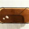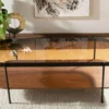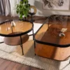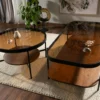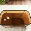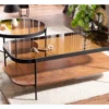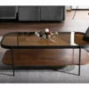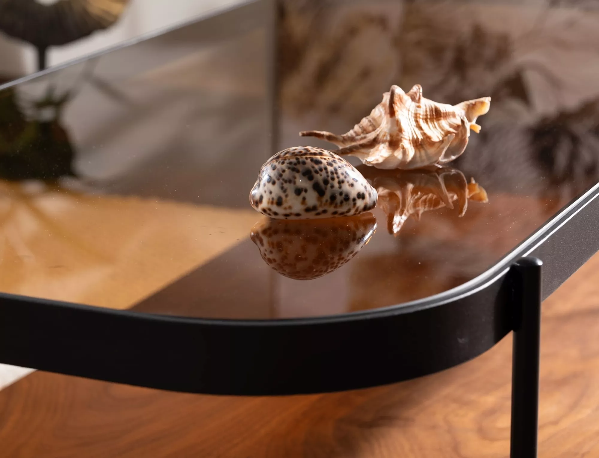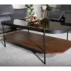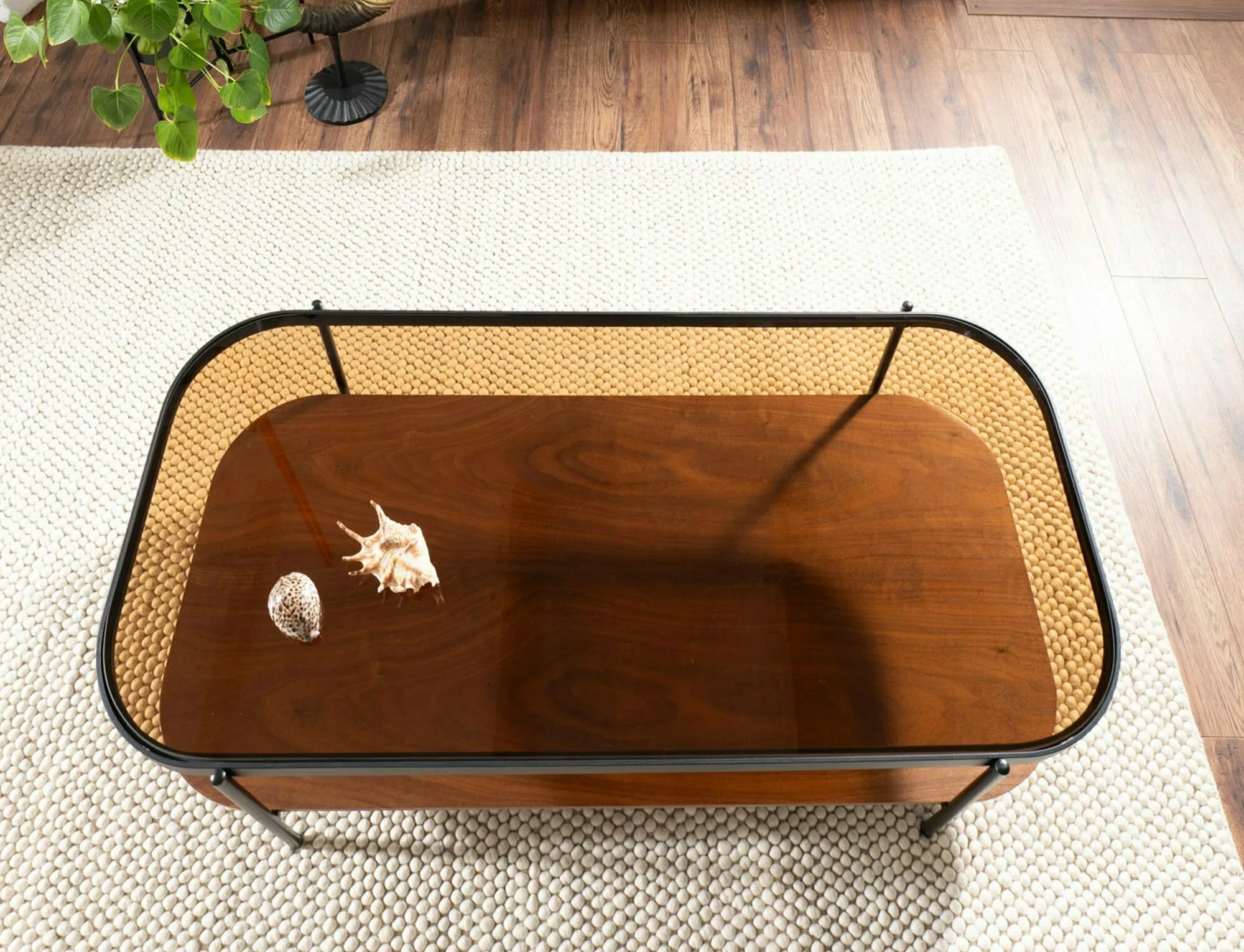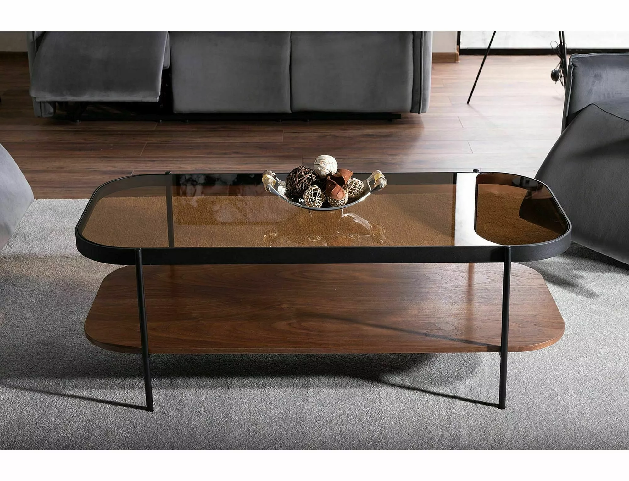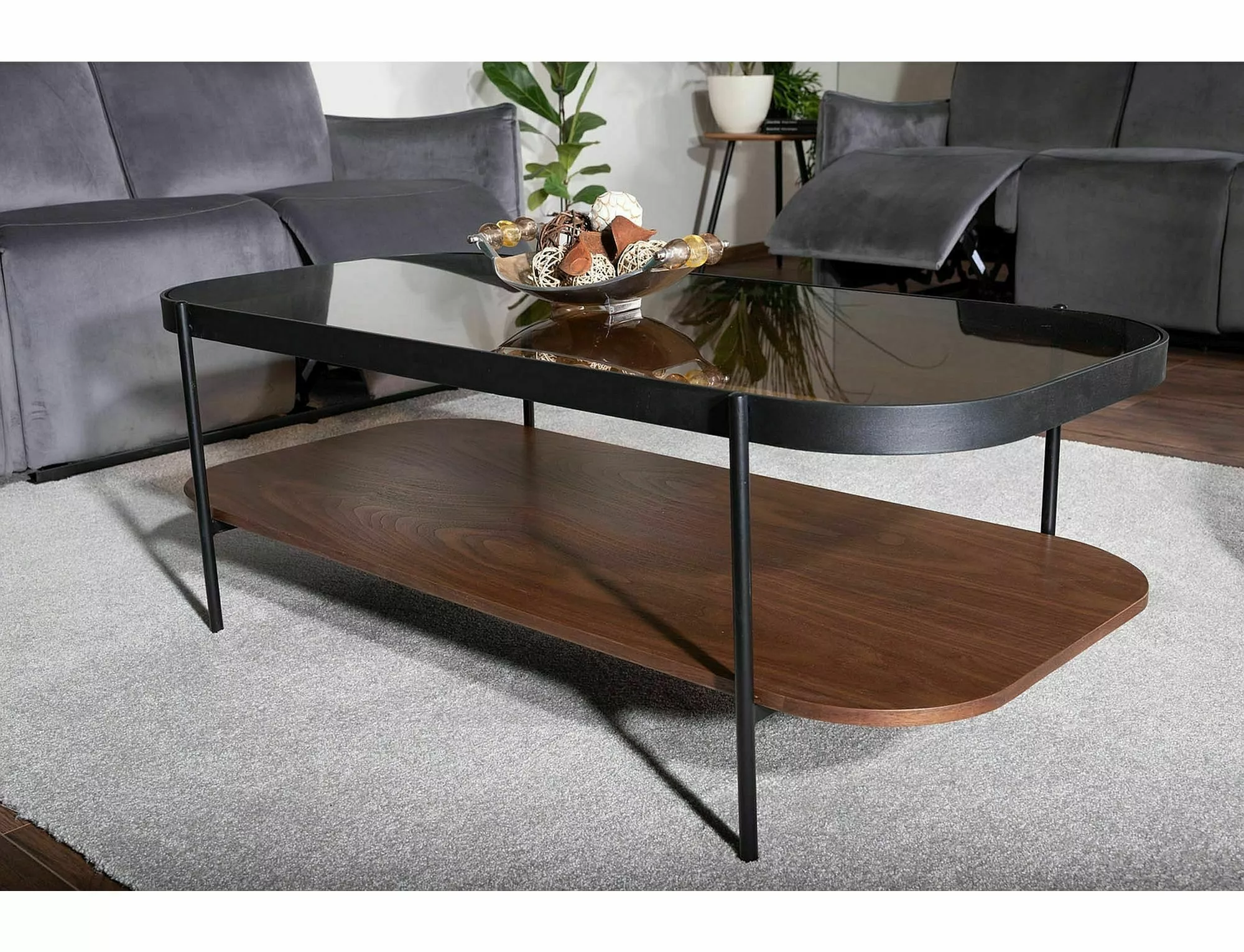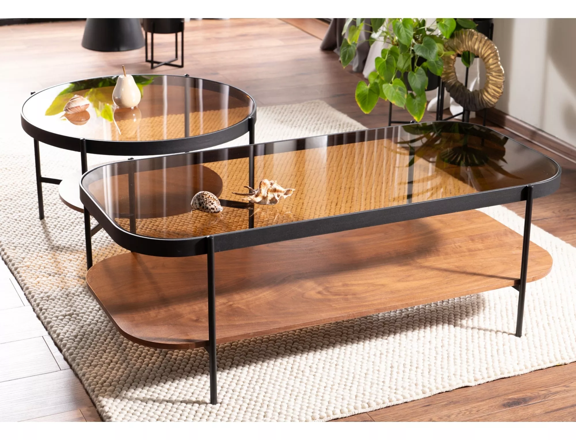 Ława, blat: szkło hartowane bursztynowe + MDF + okleina naturalna, stelaż: metal, kolor: orzech / czarny mat.