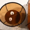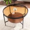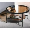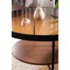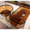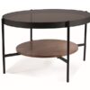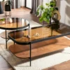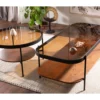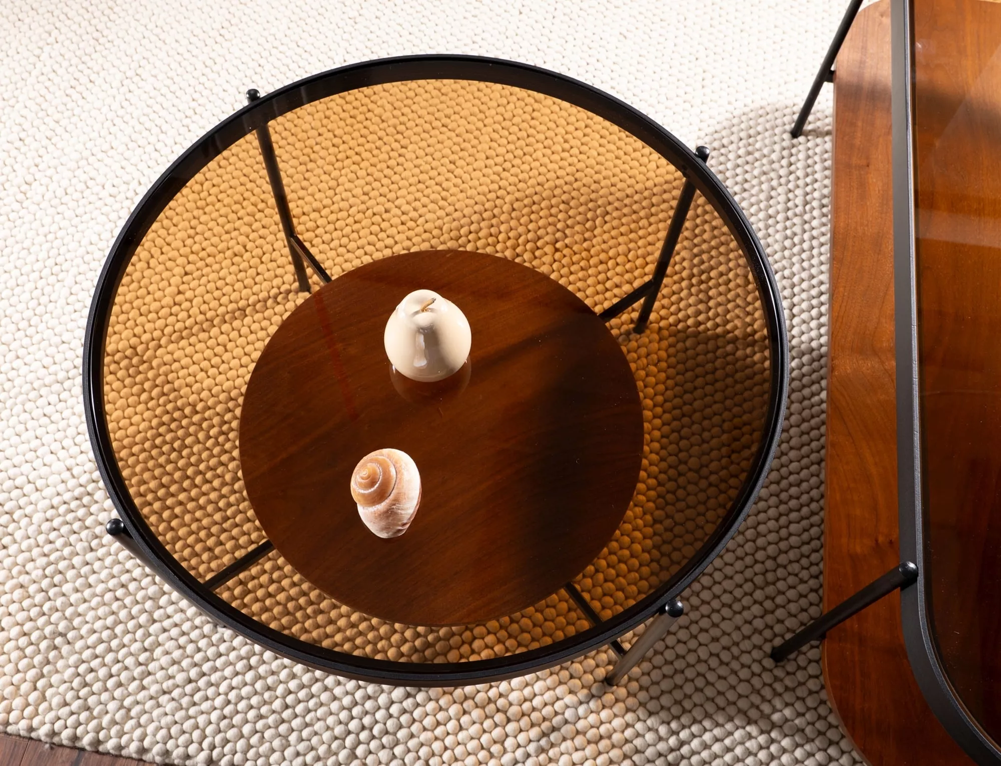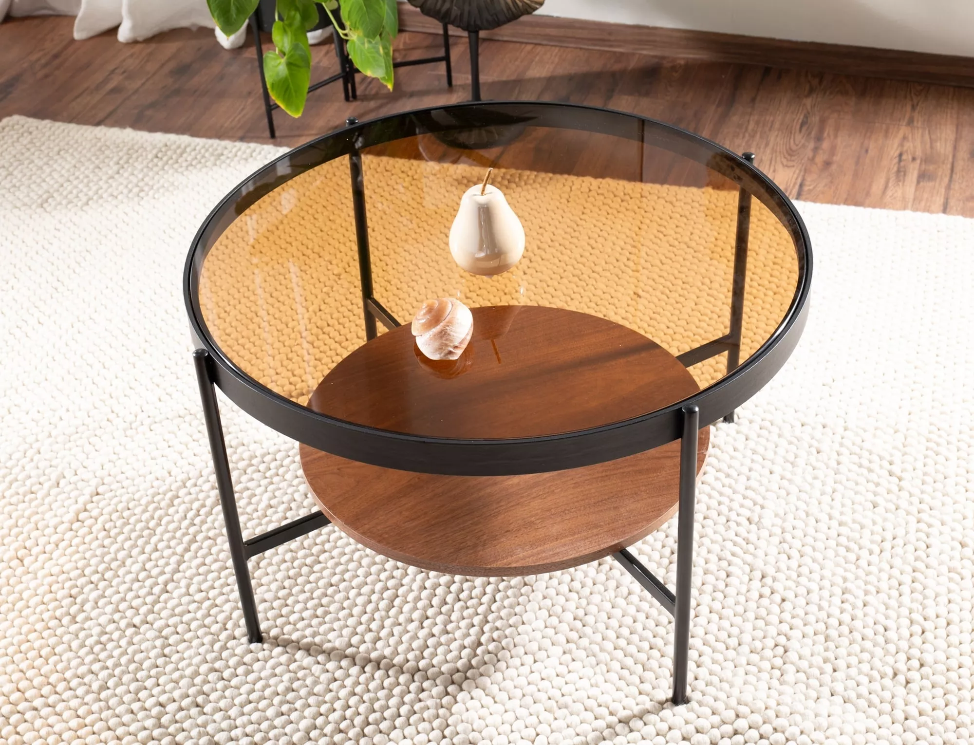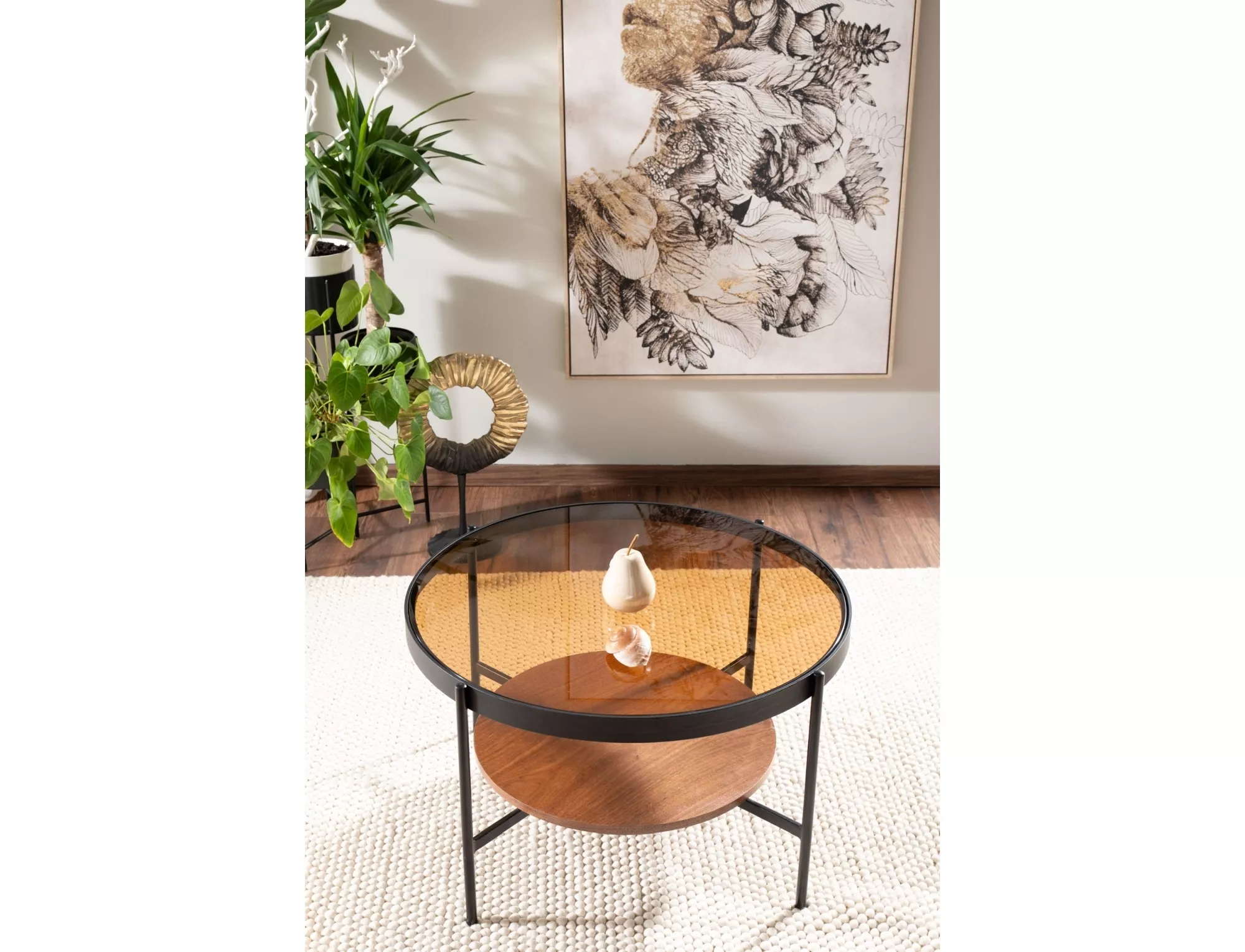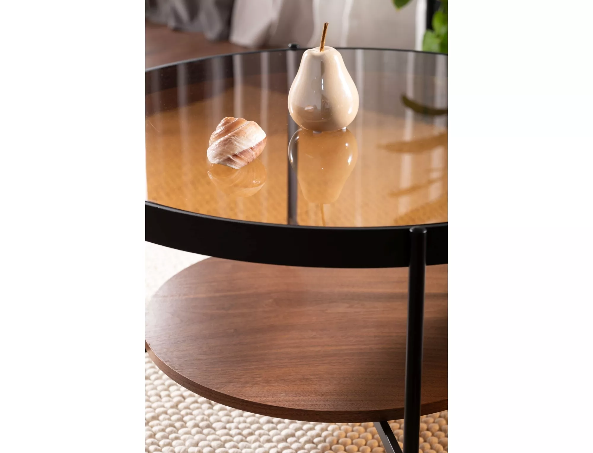 Ława, blat: szkło hartowane bursztynowe + MDF + okleina naturalna, stelaż: metal, kolor: orzech / czarny mat.