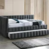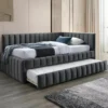 Łóżko z dodatkową powierzchnią do spania, tkanina aksamit Bluvel, kolor: 14 szary. W komplecie stelaż z drewnianych listew. Rozmiar materaca: 120x200cm, dodatkowa powierzchnia spania: max. 120x200x18cm (cena bez materacy). Uniwersalne ustawienie narożnika lewe/prawe.