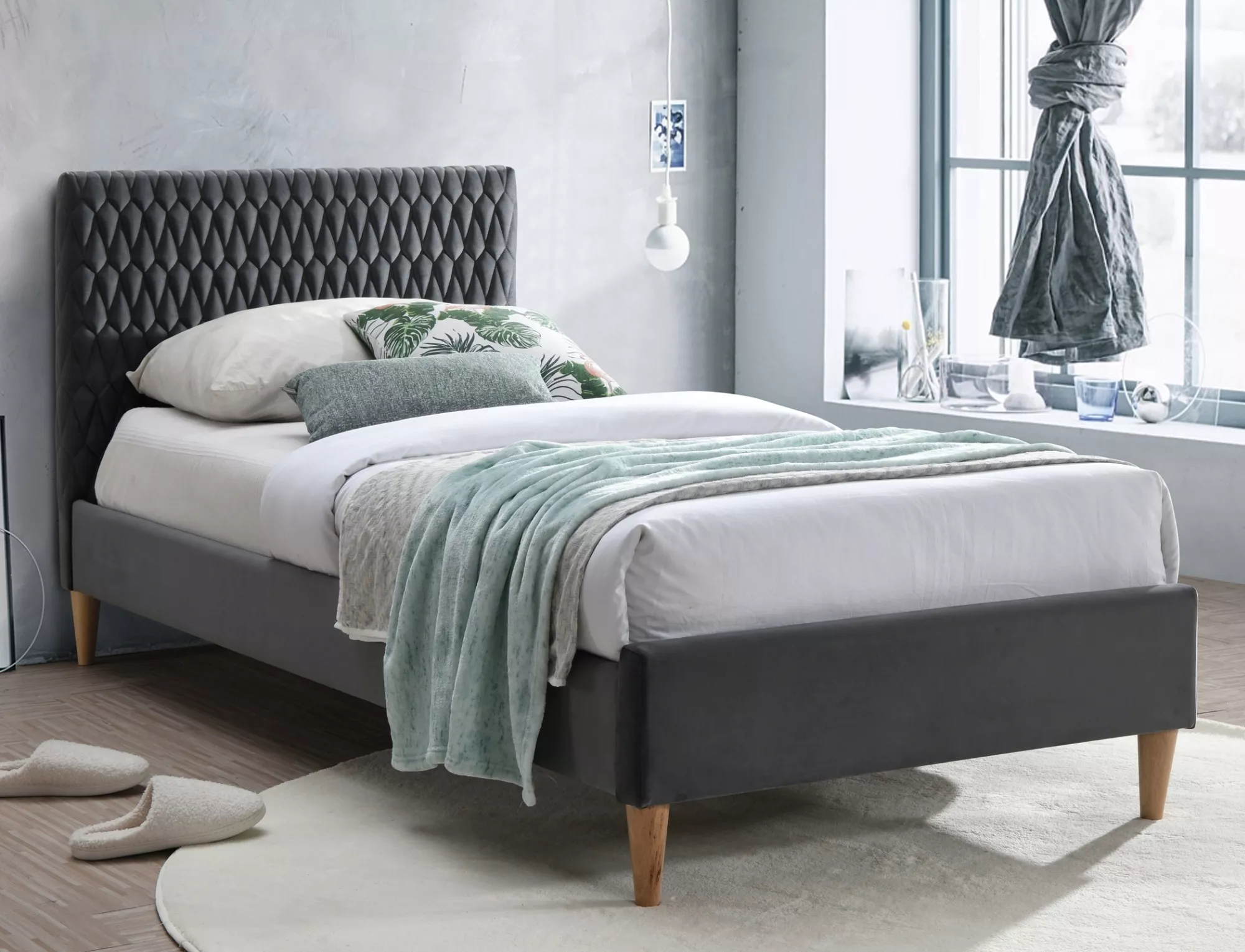 Łóżko, aksamit, kolor: Bluvel 14 – szary, zawiera w komplecie stelaż z listew sprężynowych osadzonych w elastycznych uchwytach. W kolekcji Azurro dostępne szafki nocne i skrzynia. Wymiar materaca 90x200cm (cena bez materaca).