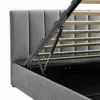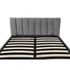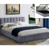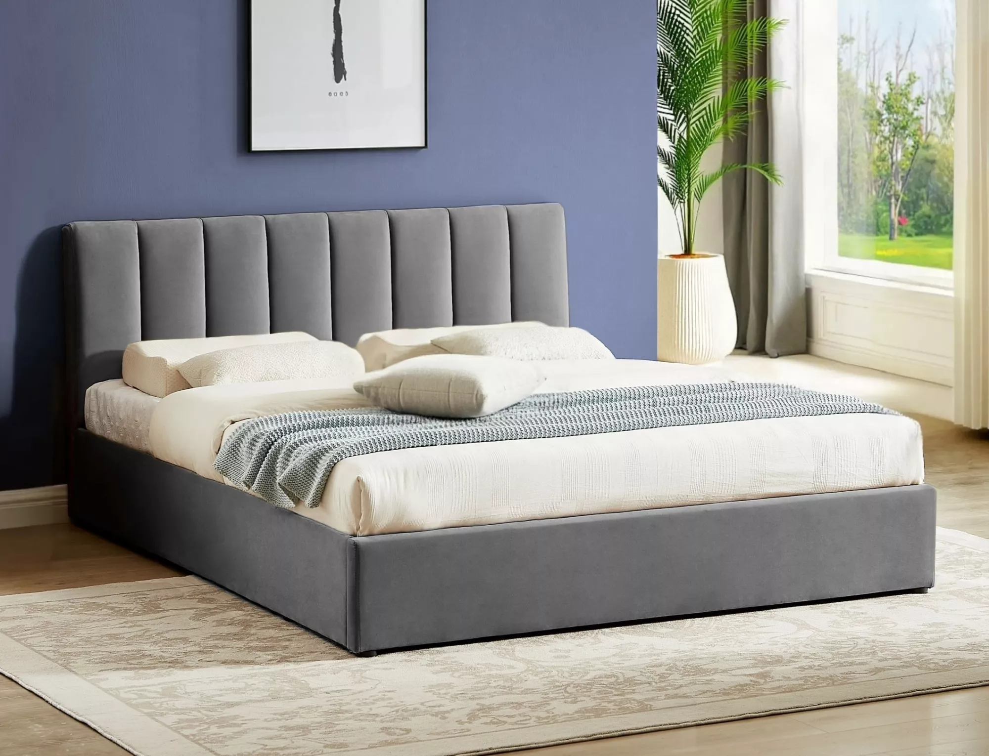 Łóżko z pojemnikiem, tkanina aksamit, kolor: szary, tap. 192. Łóżko zawiera w komplecie stelaż z listew giętych osadzonych w elastycznych uchwytach, szerokość listwy 5 cm, odstęp miedzy listwami 6 cm. Gazowe siłowniki. Uwaga: pojemnik z miękką podłogą. Wymiar materaca 140x200cm (cena bez materaca).