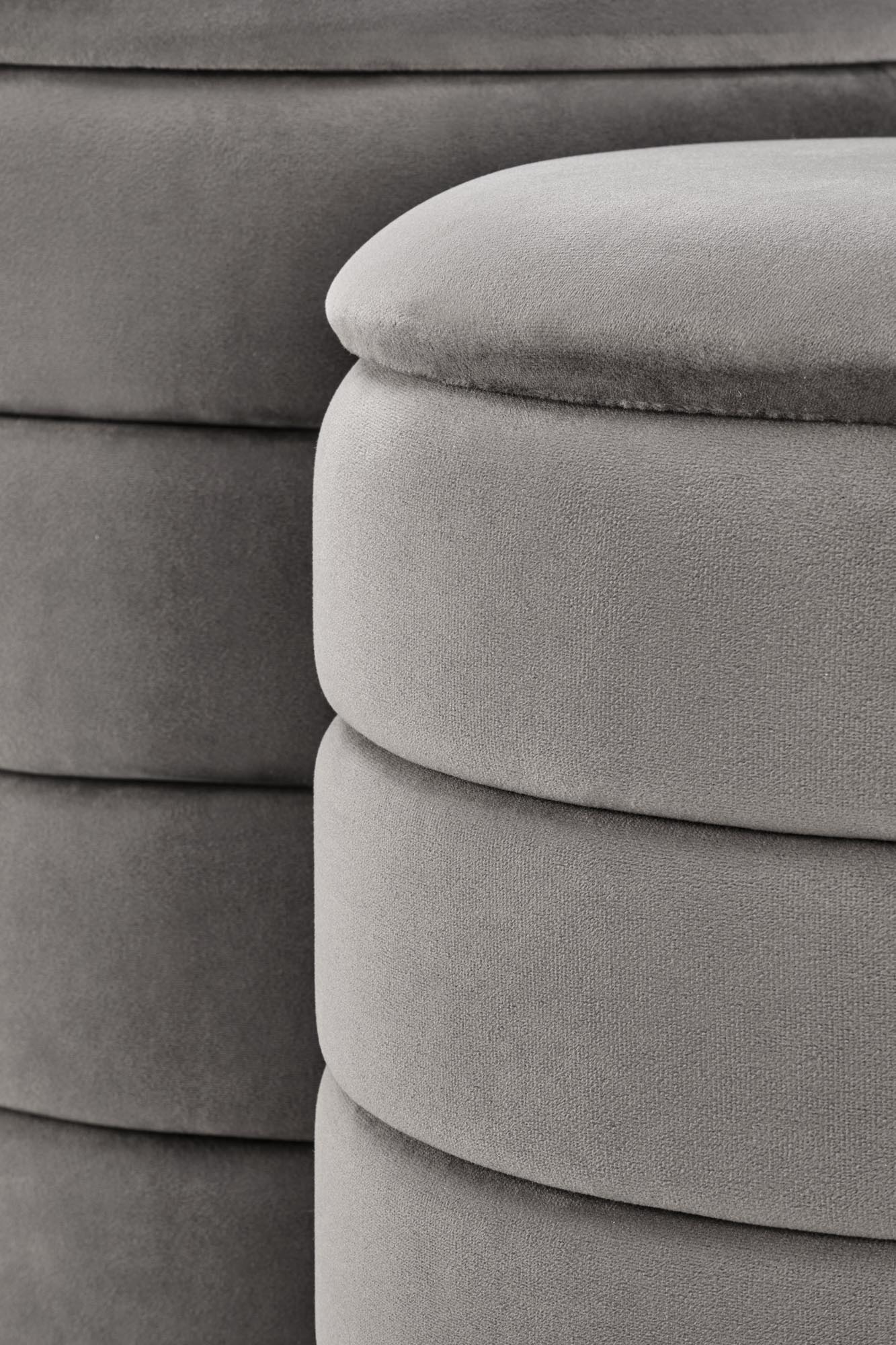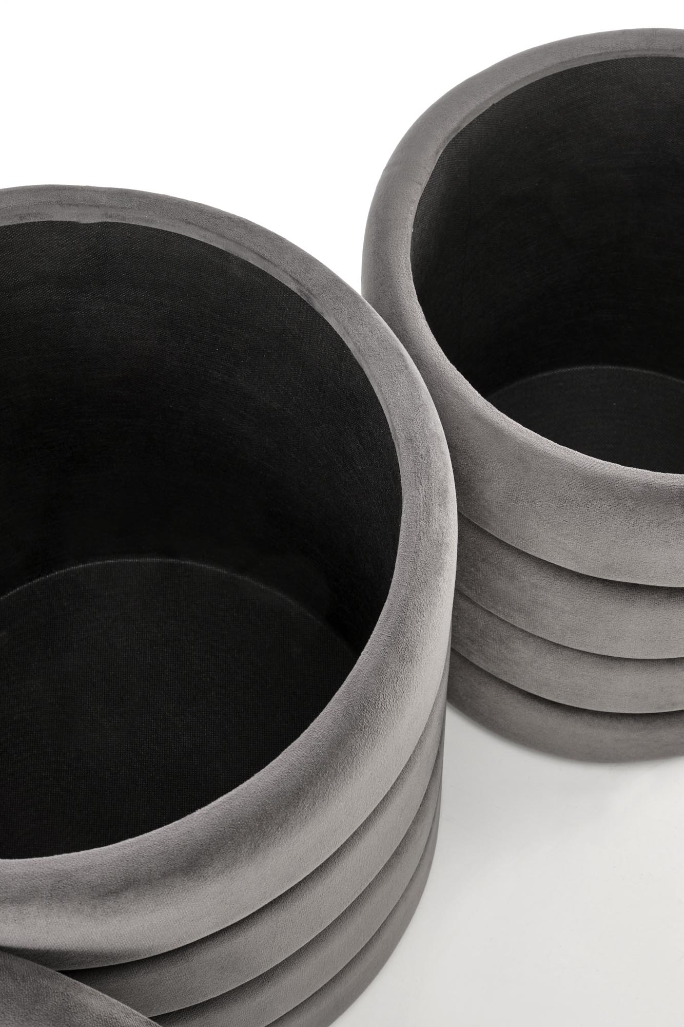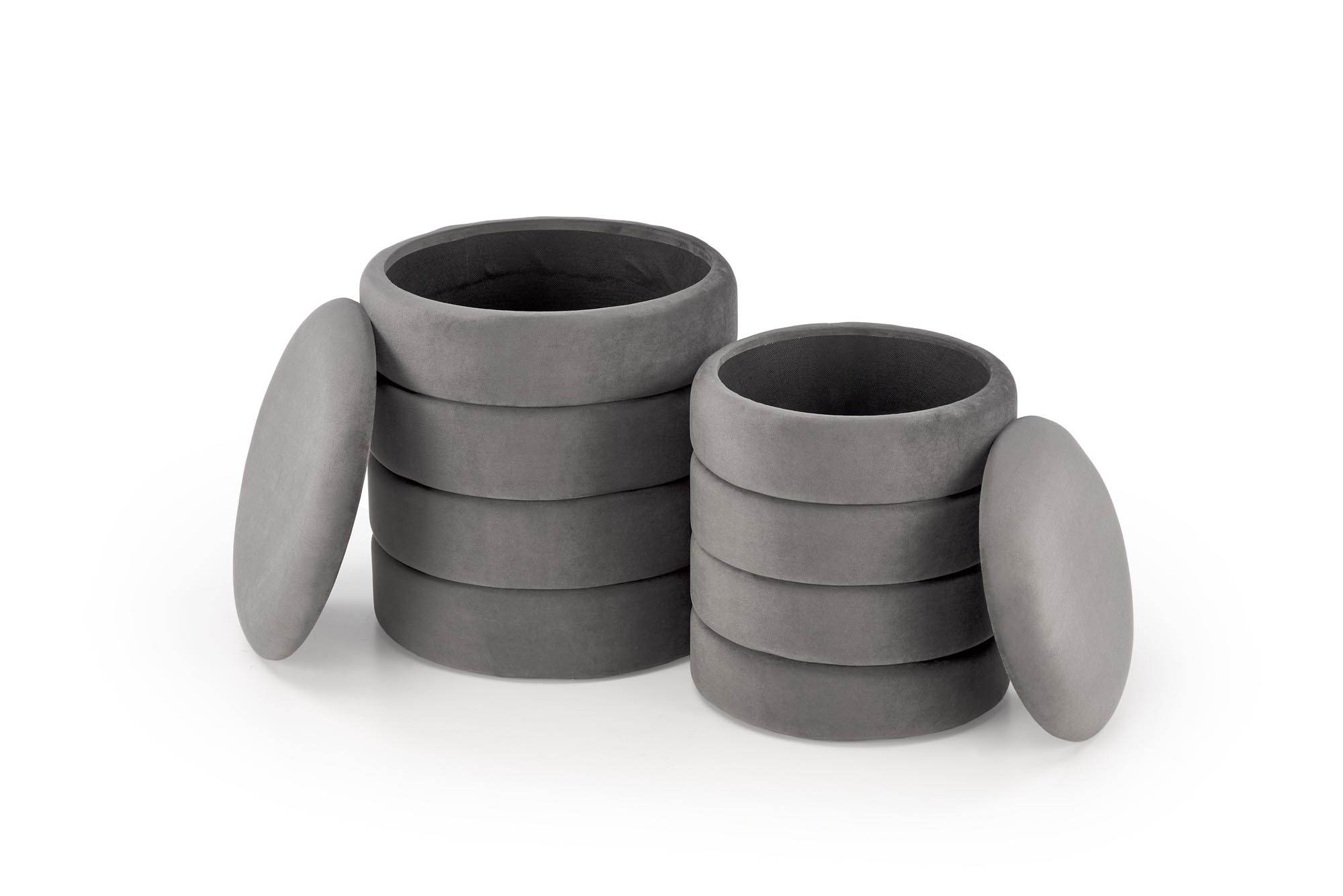 wymiary: 40/44 cm oraz 33/39 cm; zestaw 2 puf z funkcją pojemnika, materiał: tkanina – velvet, kolor popielaty