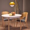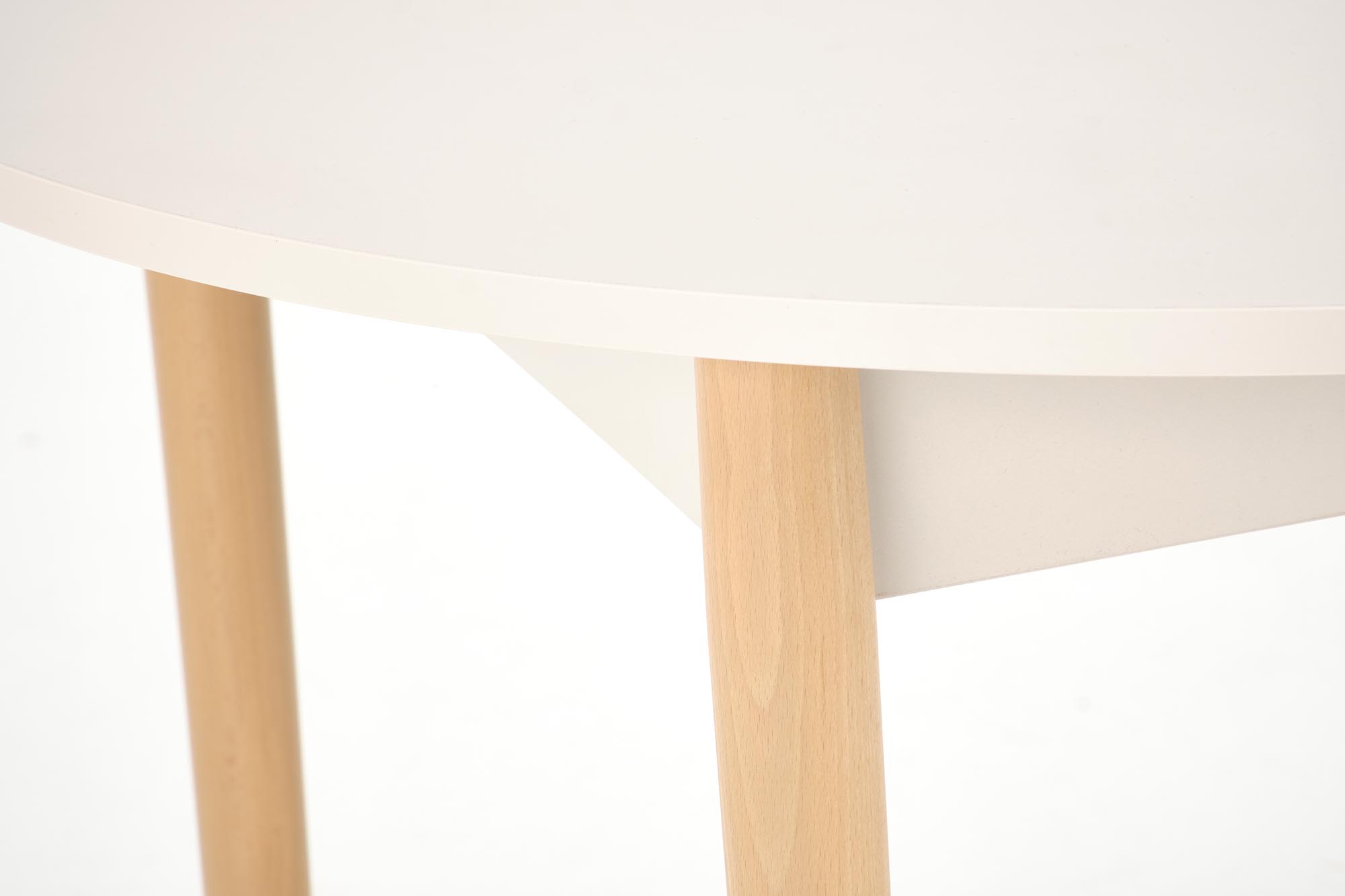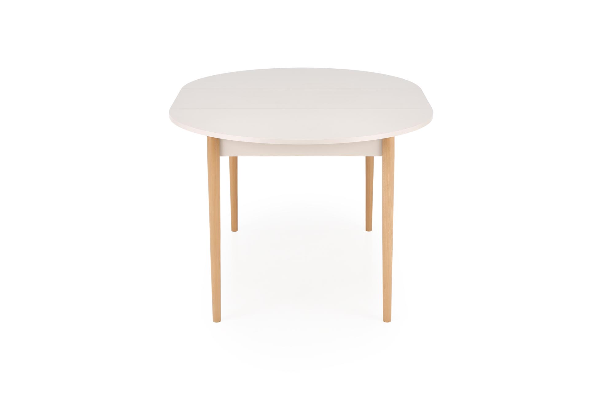 stół rozkładany, wymiary: 102-142/102/75 cm, materiał: płyta meblowa laminowana / drewno lite – bukowe, kolor: blat – kaszmir, nogi – naturalny