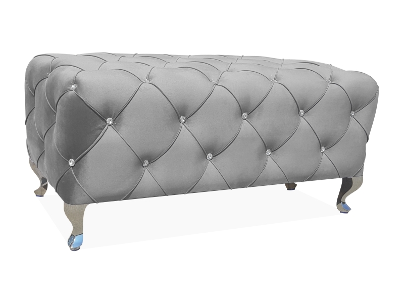 Puf / ławka, tkanina aksamit: szary BLUVEL 14 / nogi: metal, kolor: srebrny. Ilość kryształków (guzików): 54 szt., wysokość nóżek: 14 cm
