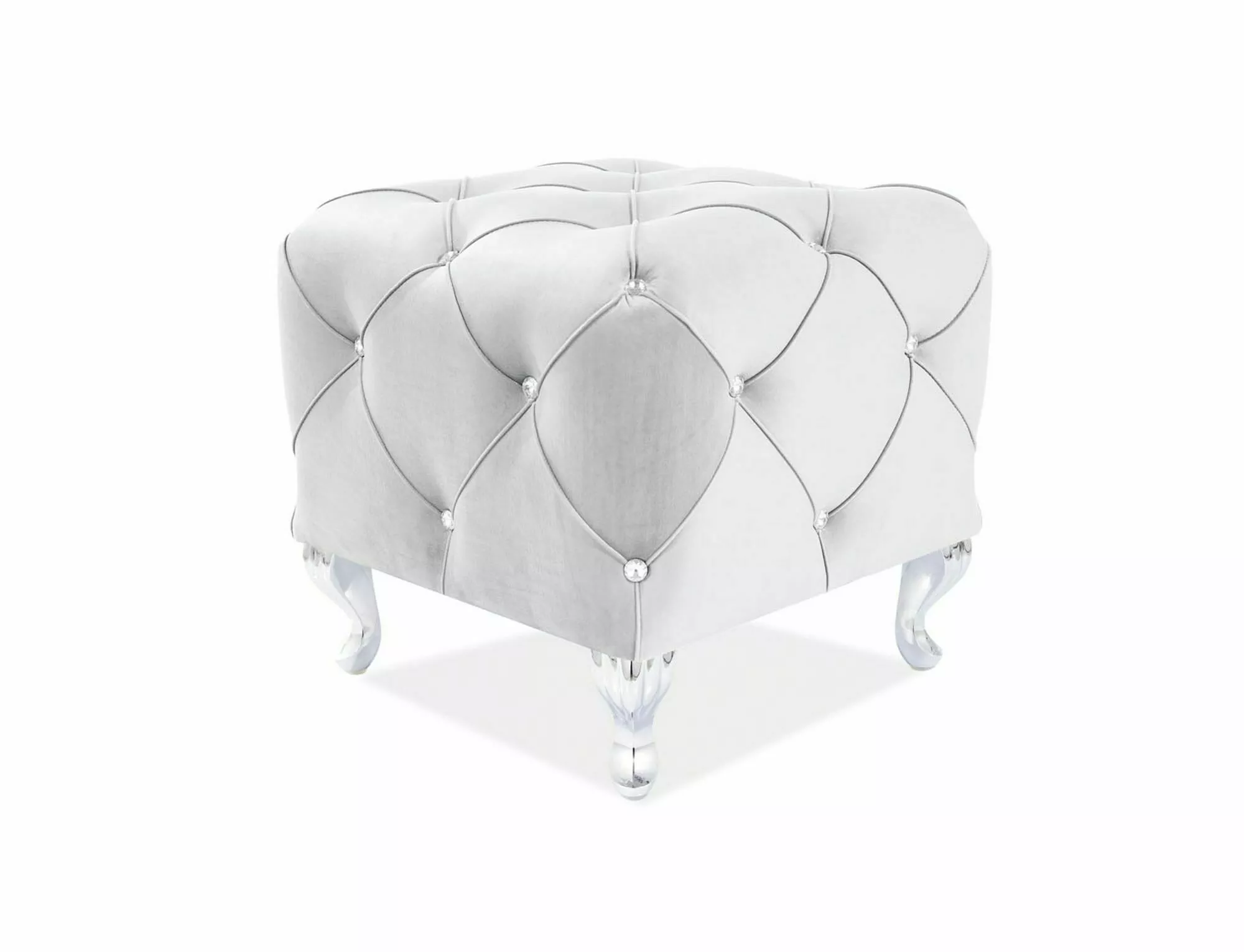 Puf, tkanina aksamit: jasny szary BLUVEL 03 / nogi: metal, kolor: srebrny. Ilość kryształków (guzików): 29 szt., wysokość nóżek: 14 cm.