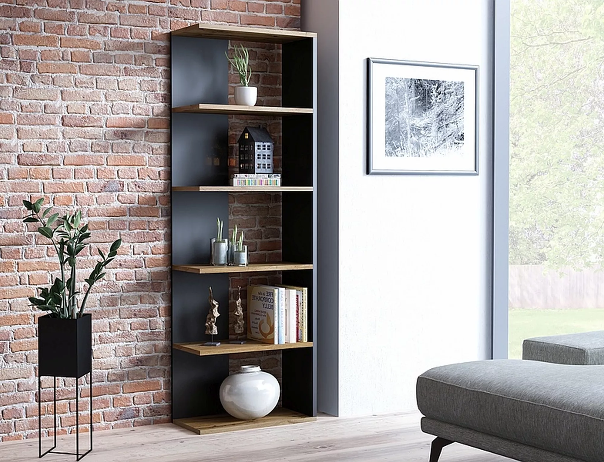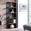 Regał, płyta laminowana, kolor: dąb wotan + czarny. Uniwersalny: lewo- lub prawostronny. Odległość między półkami: 318mm.