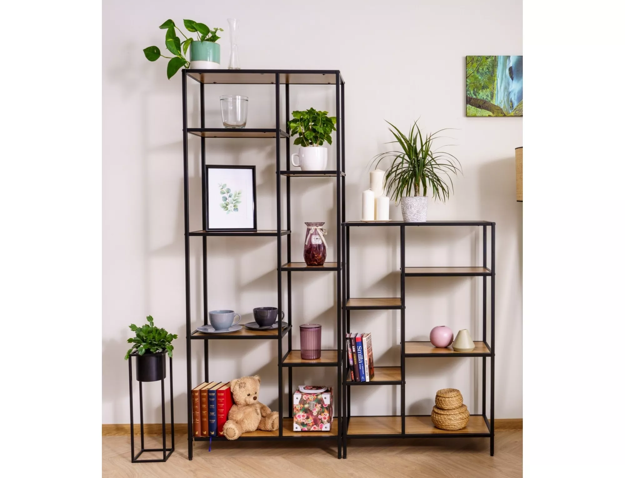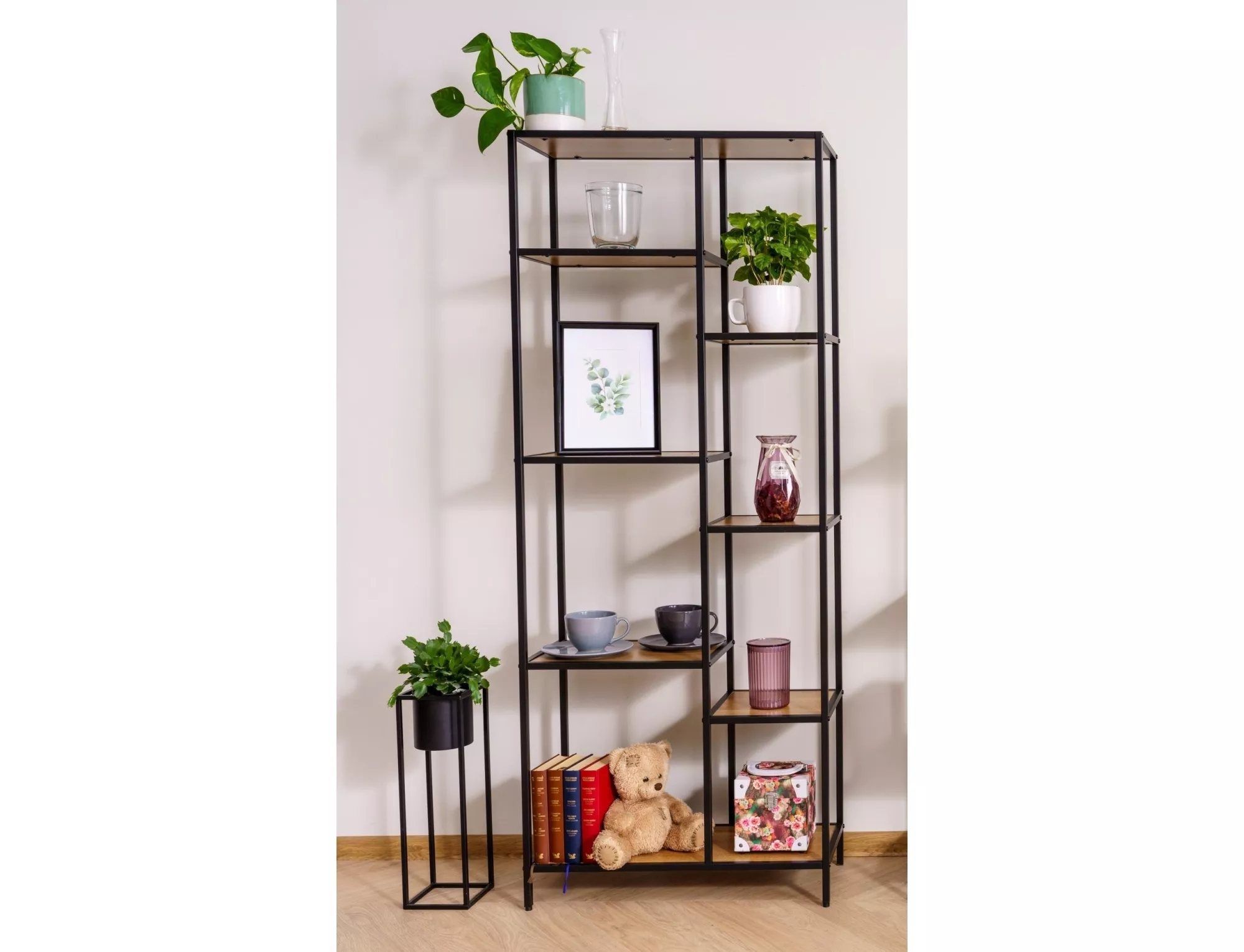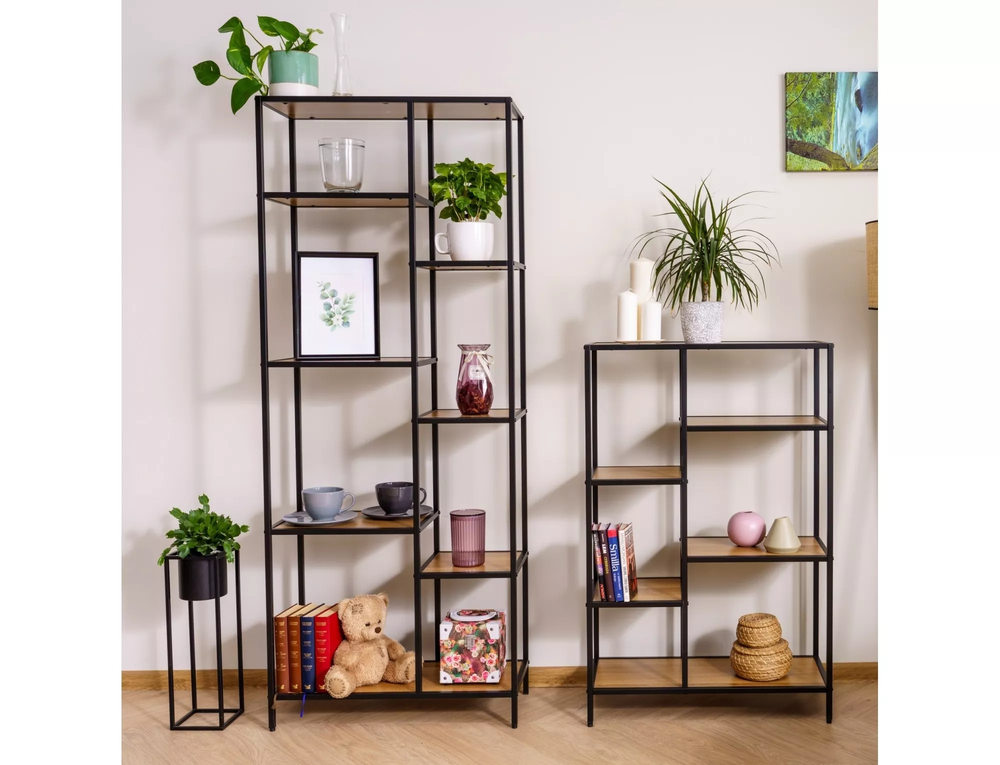 Regał, blat: płyta laminowana, stelaż: metal, kolor: dąb / czarny mat. W kolekcji dostępne 2 wysokości regałów w 2-ch kolorach.