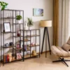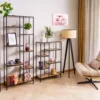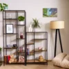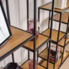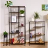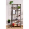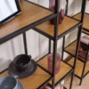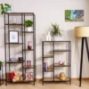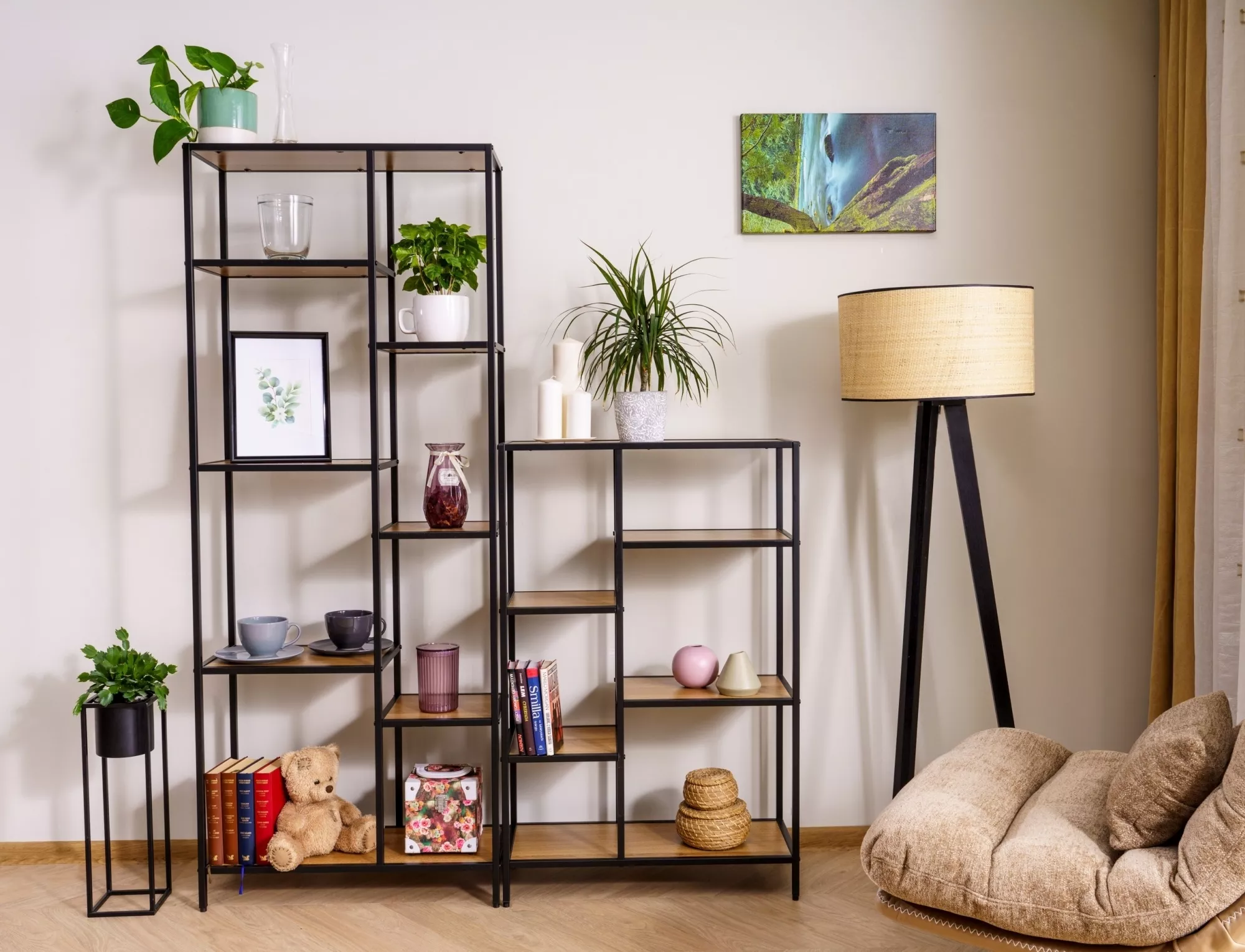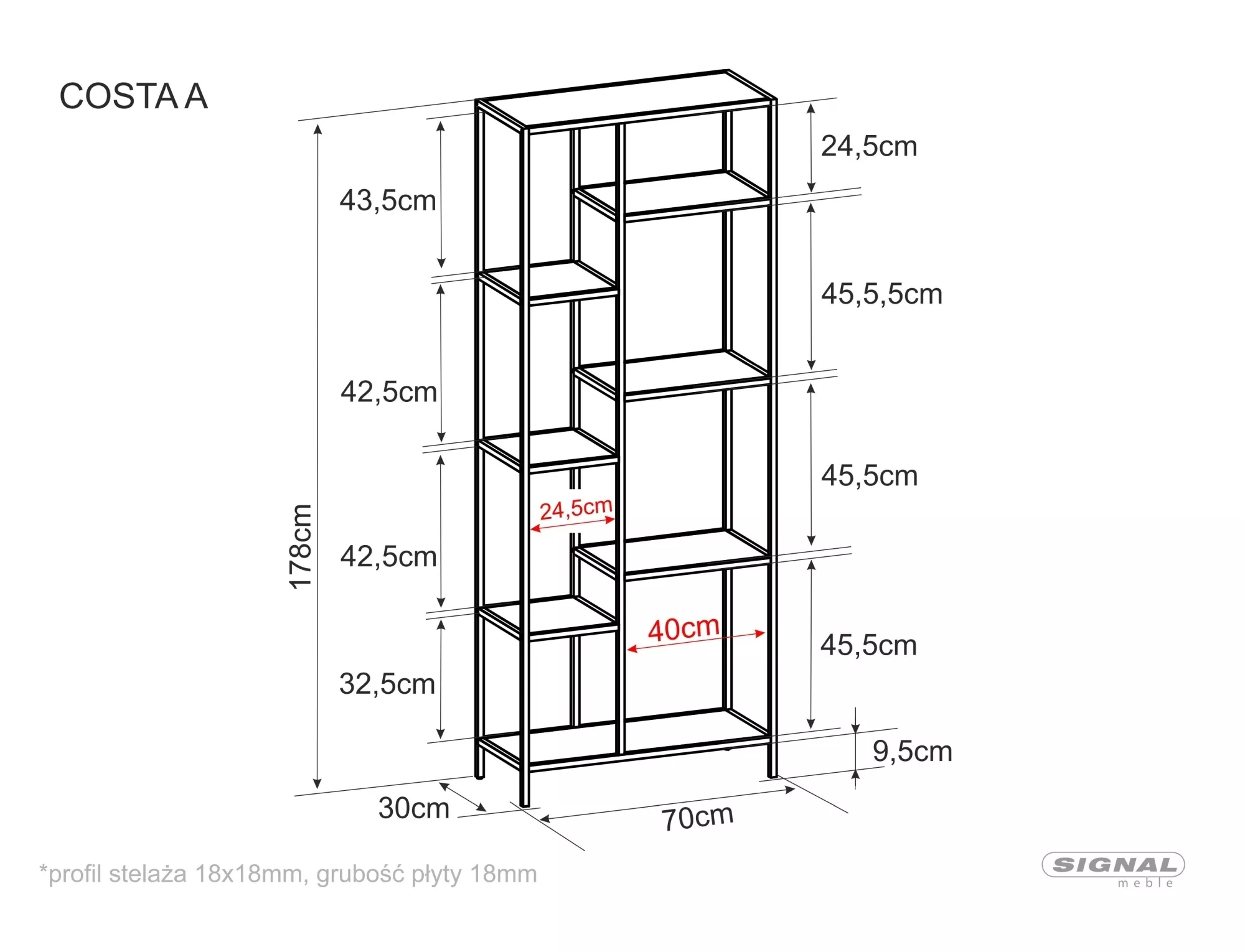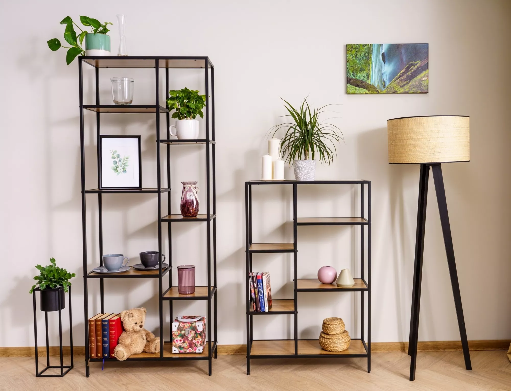 Regał, blat: płyta laminowana, stelaż: metal, kolor: dąb / czarny mat. W kolekcji dostępne 2 wysokości regałów w 2-ch kolorach.