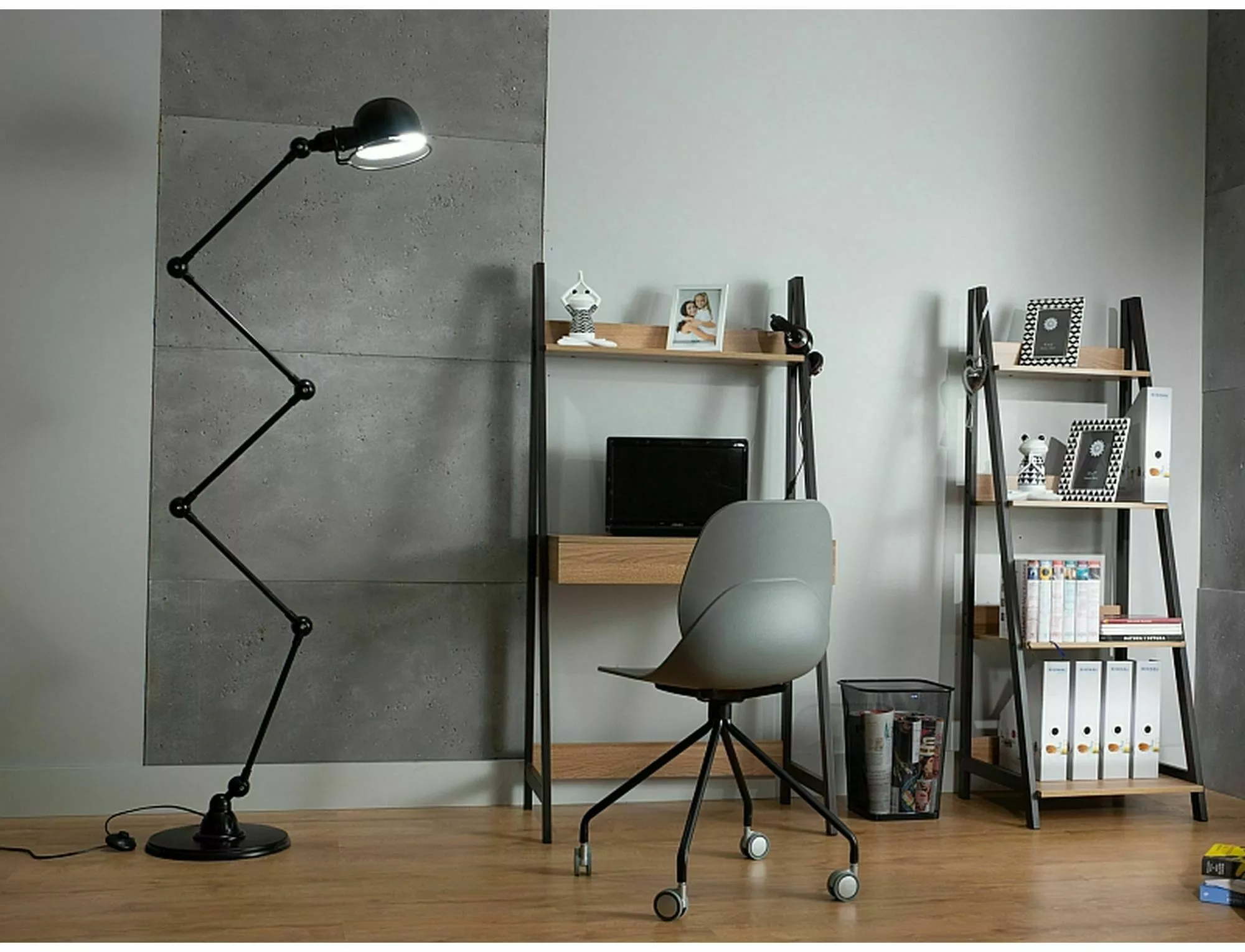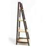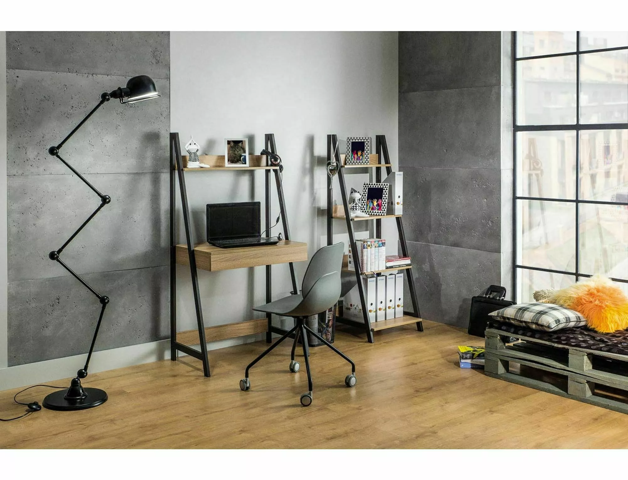 Regał, półki: MDF, kolor: dąb, stelaż: metal, kolor: ciemny brąz.