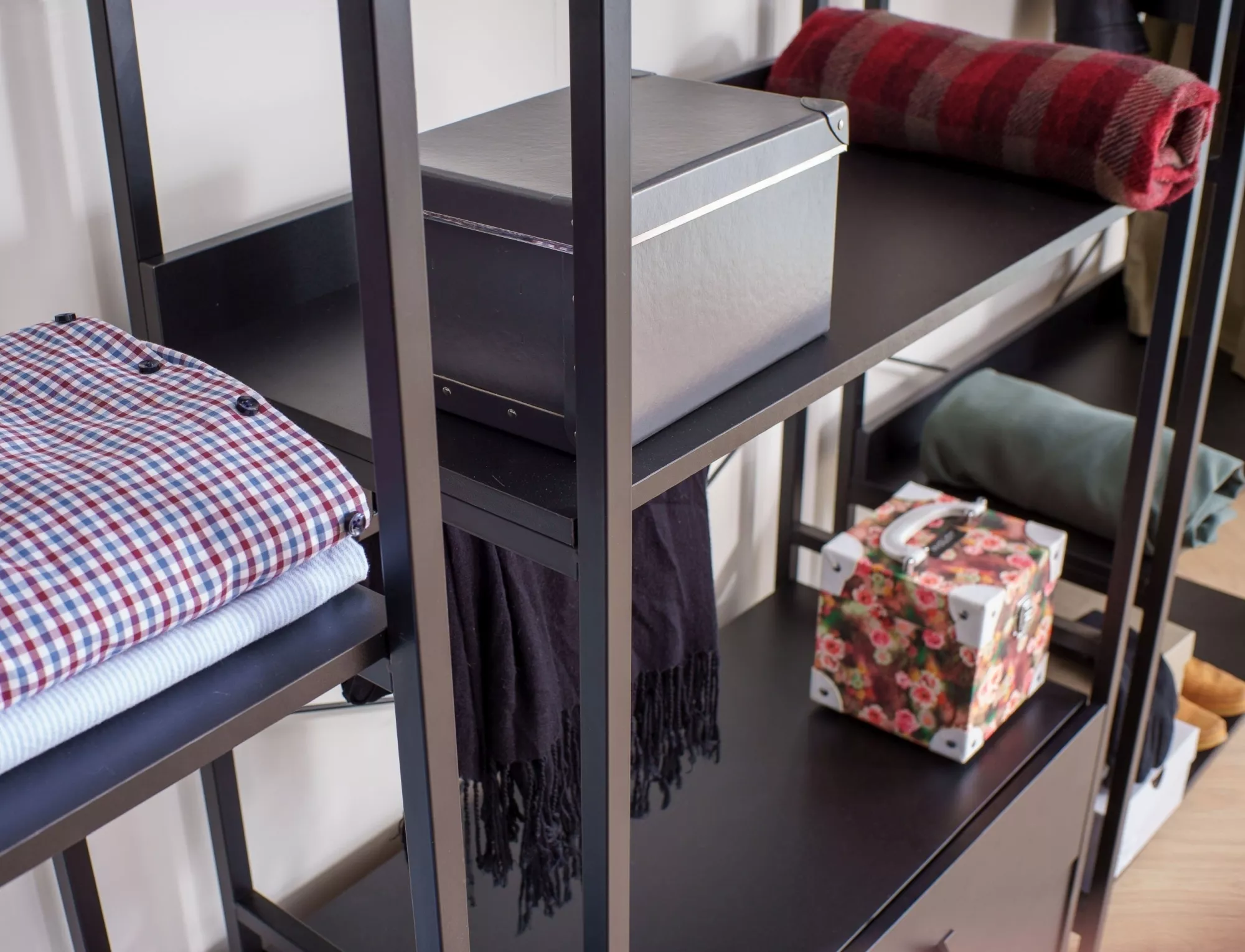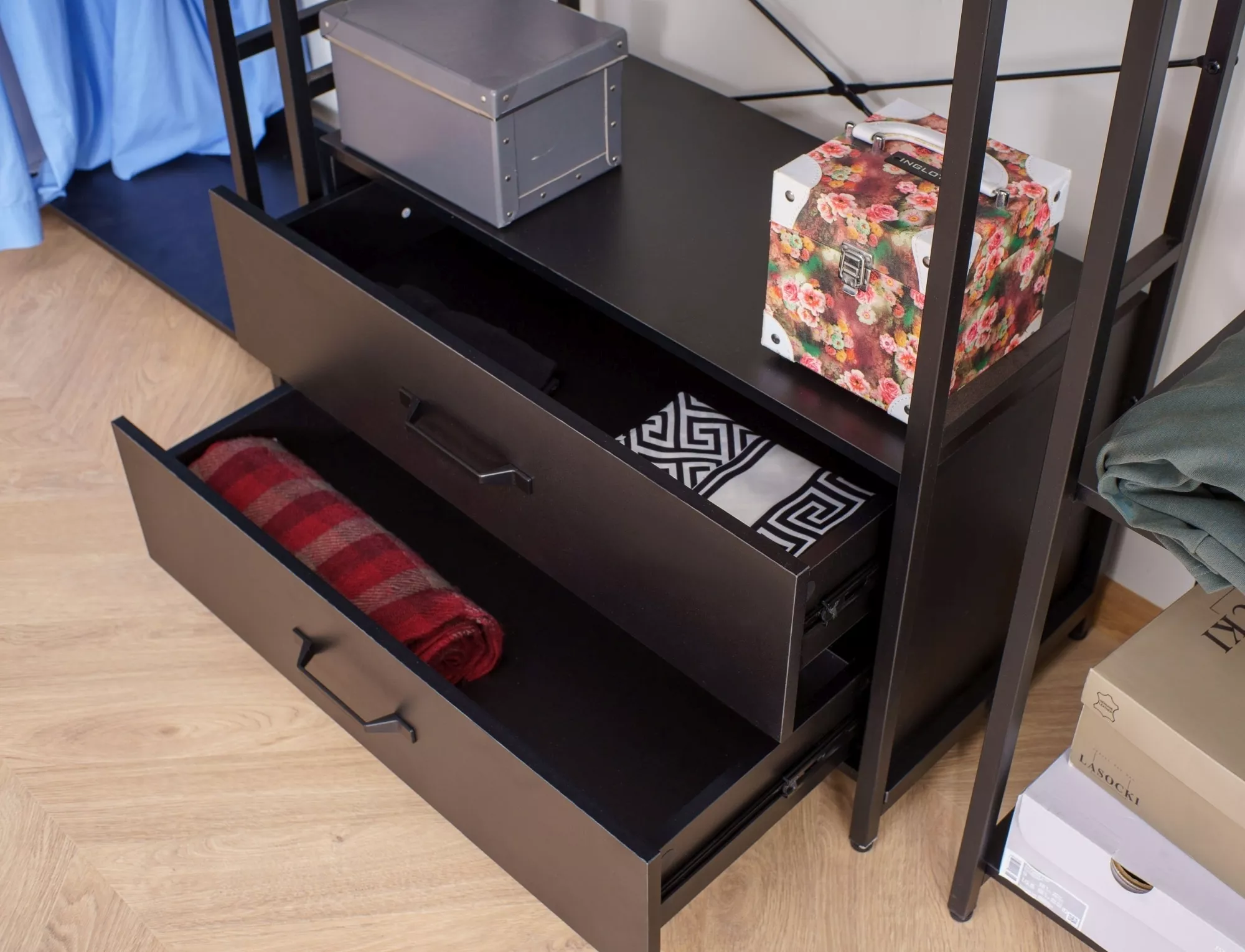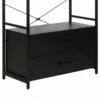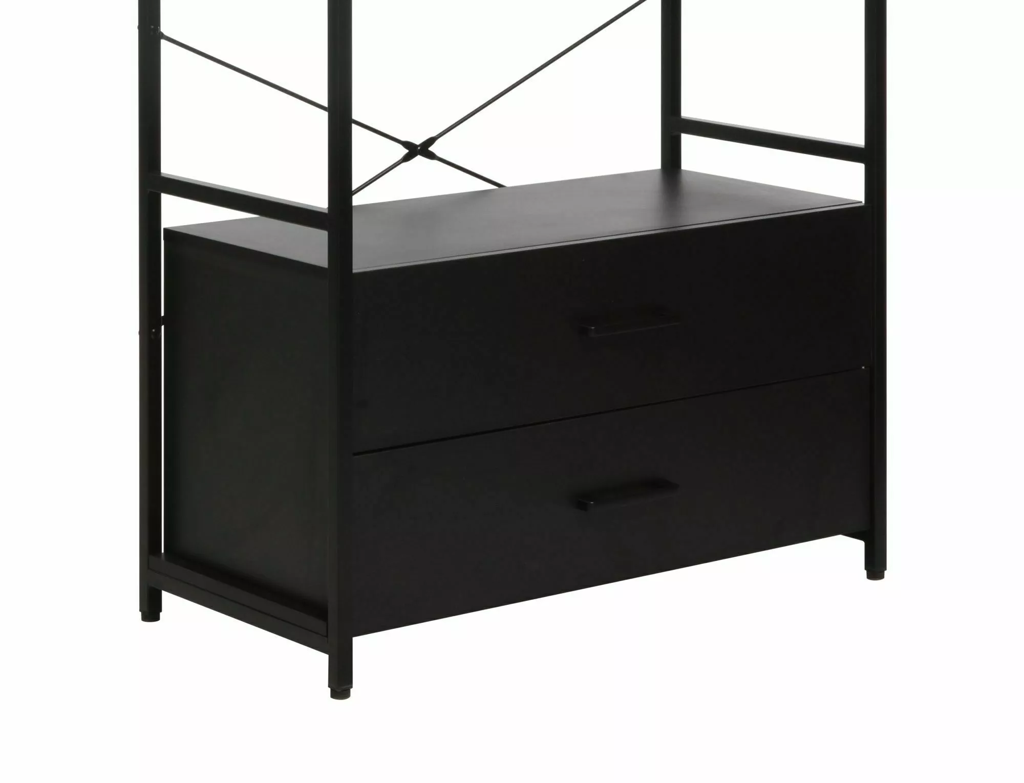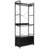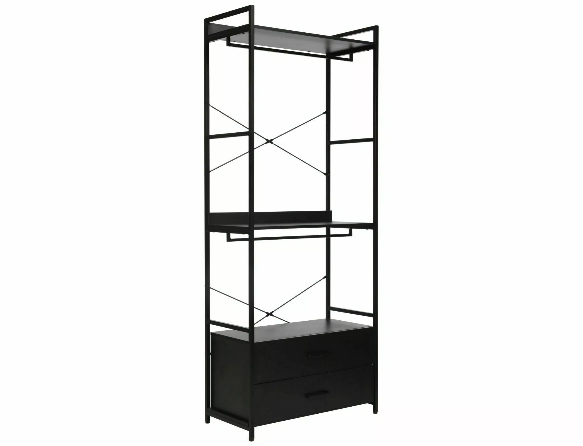Regał / wieszak, półki: płyta laminowana, stelaż: metal, kolor: czarny / czarny mat. Zamykana szafka z półką.