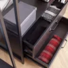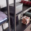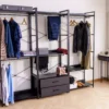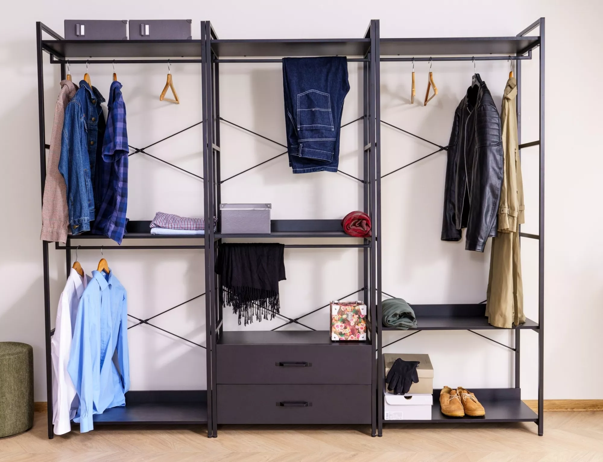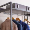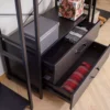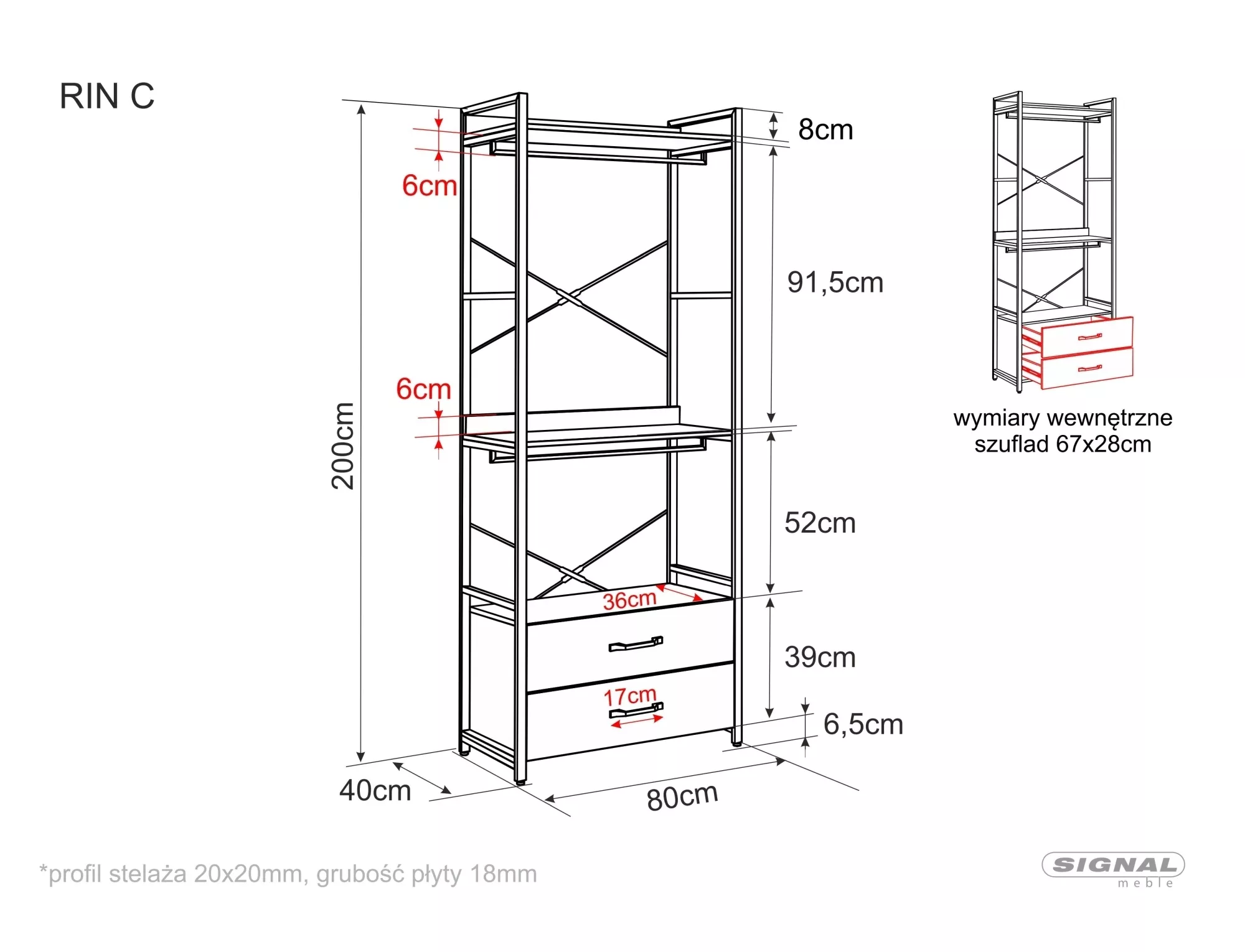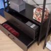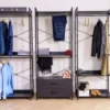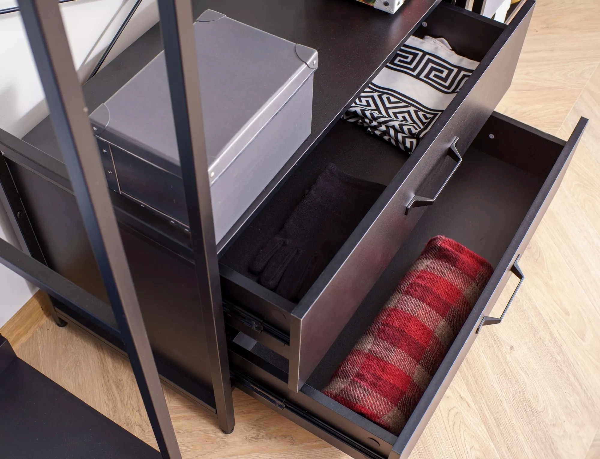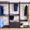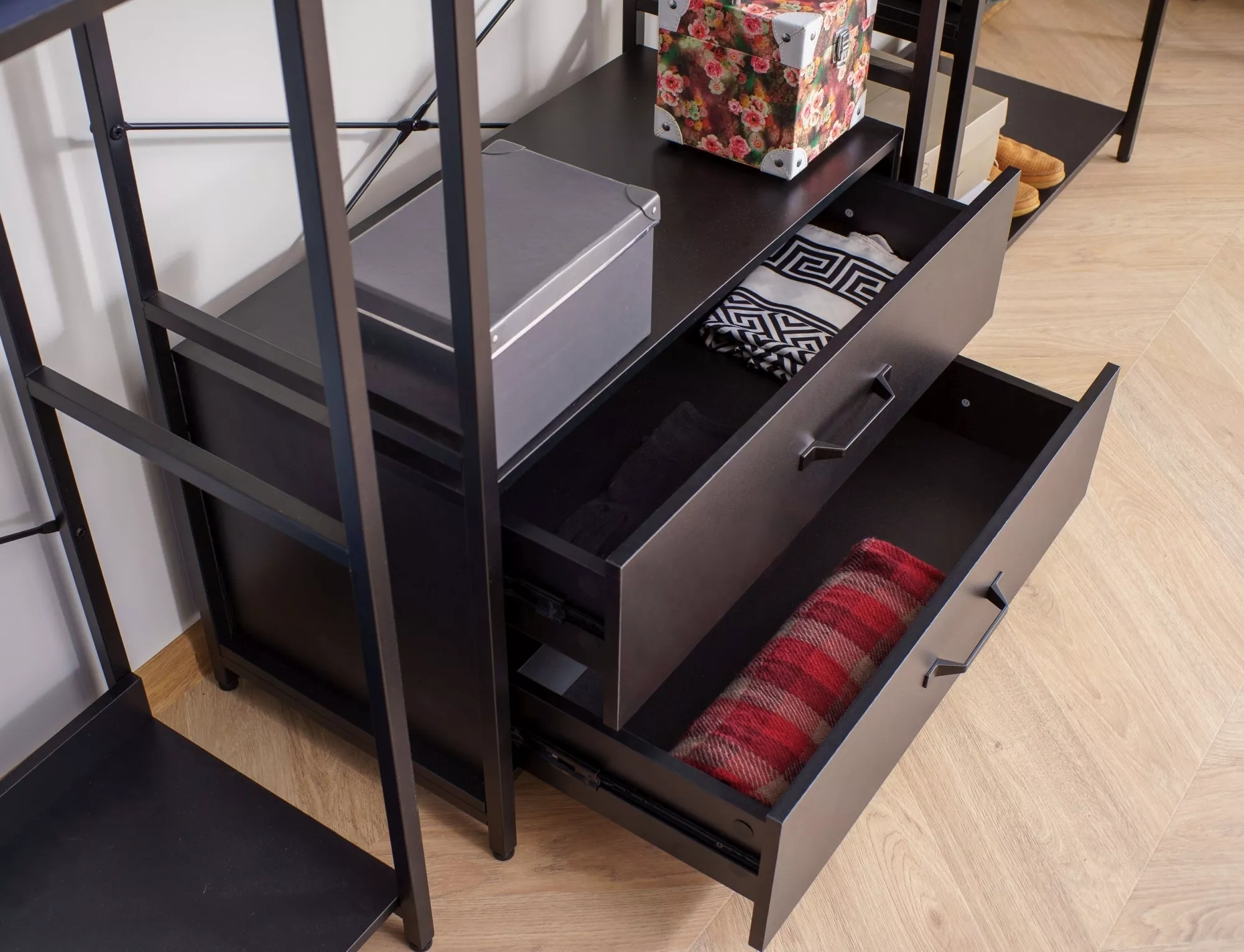 Regał / wieszak, półki: płyta laminowana, stelaż: metal, kolor: czarny / czarny mat. Zamykana szafka z półką.