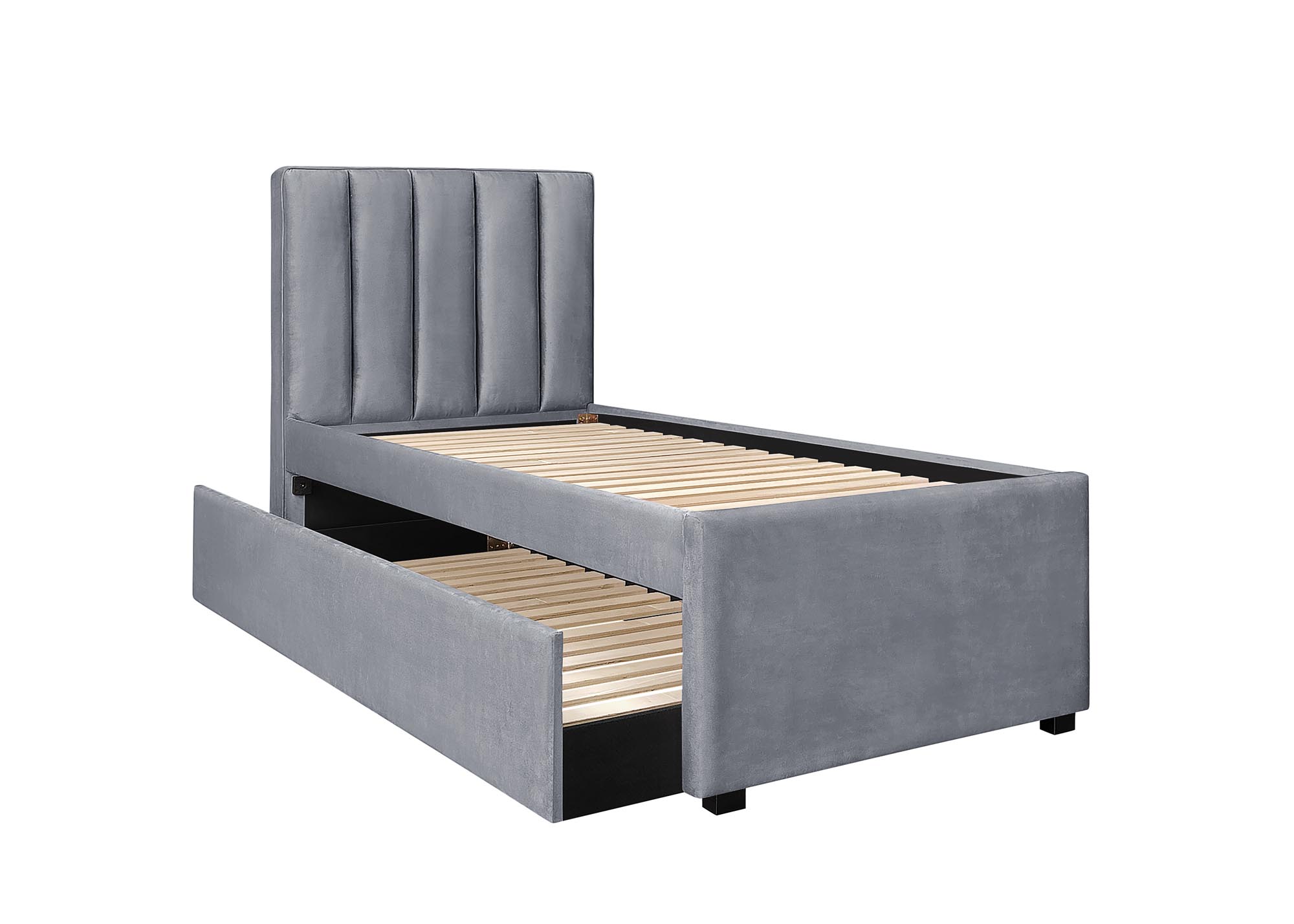 wymiary: 96/221/122 cm; łóżko dwuosobowe z wysuwanym dolnym materacem; materiał: tkanina – velvet, kolor: popielaty; * łózko bez materaca, w opcji materac POLARIS 90 lub SYRIUSZ 90