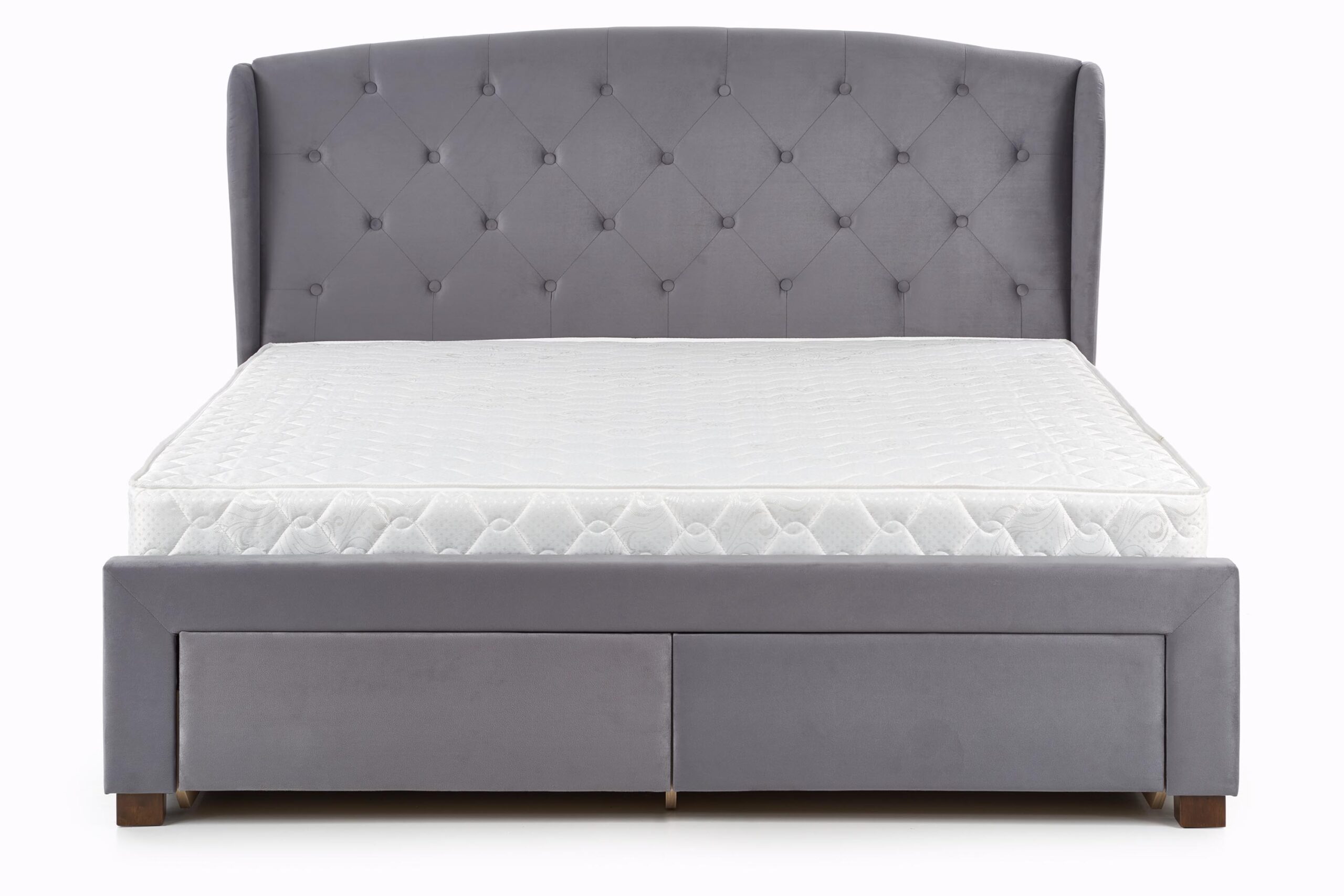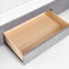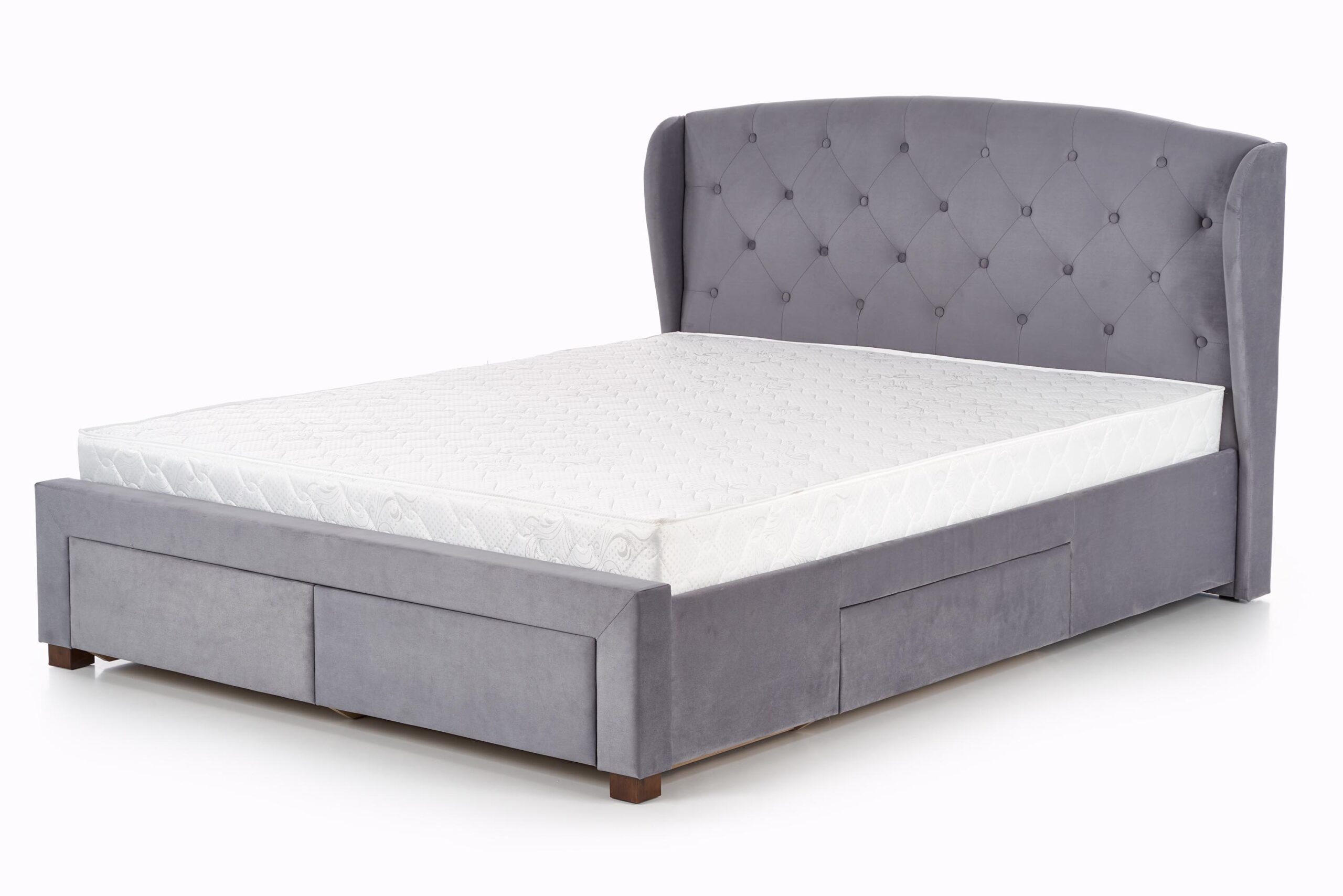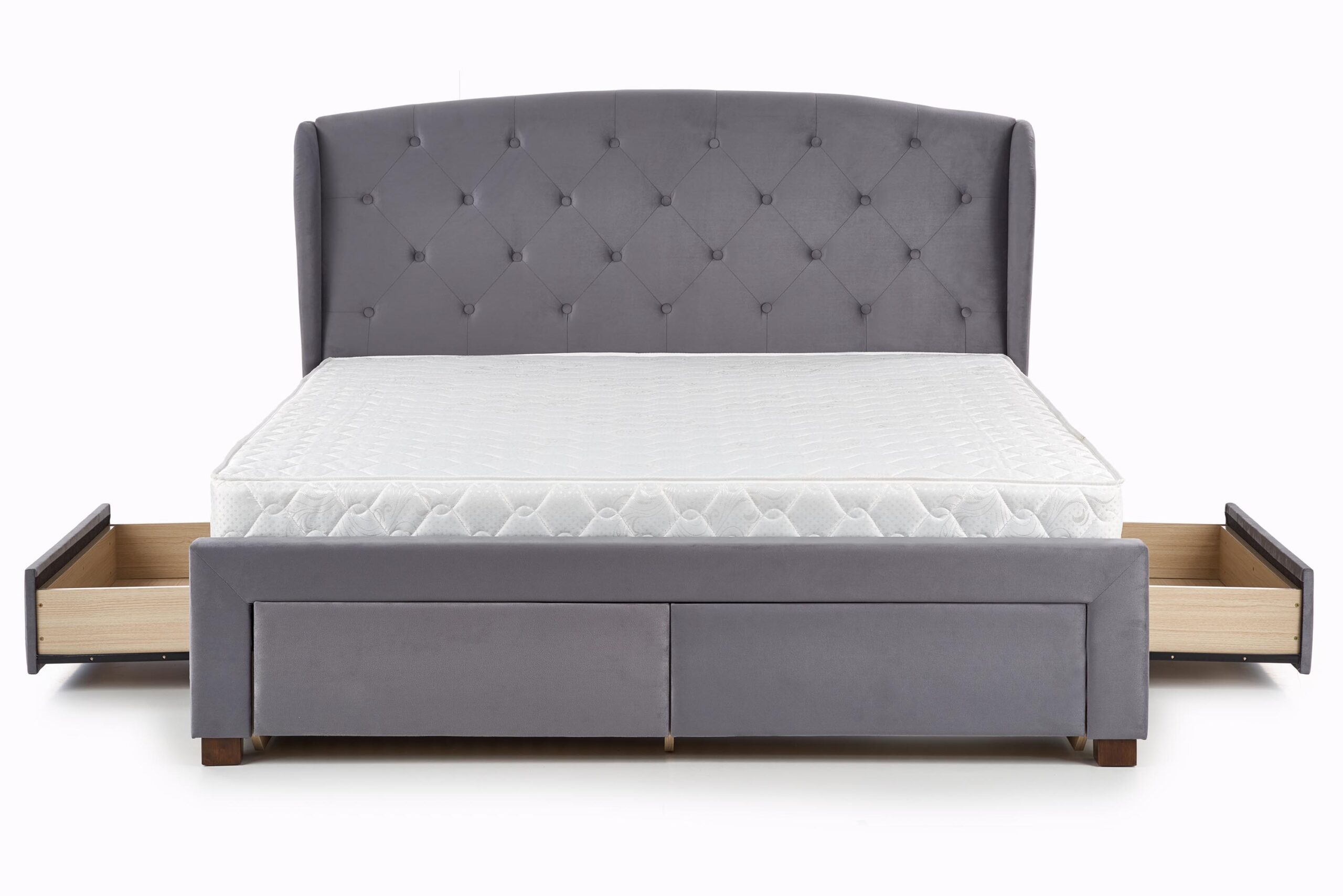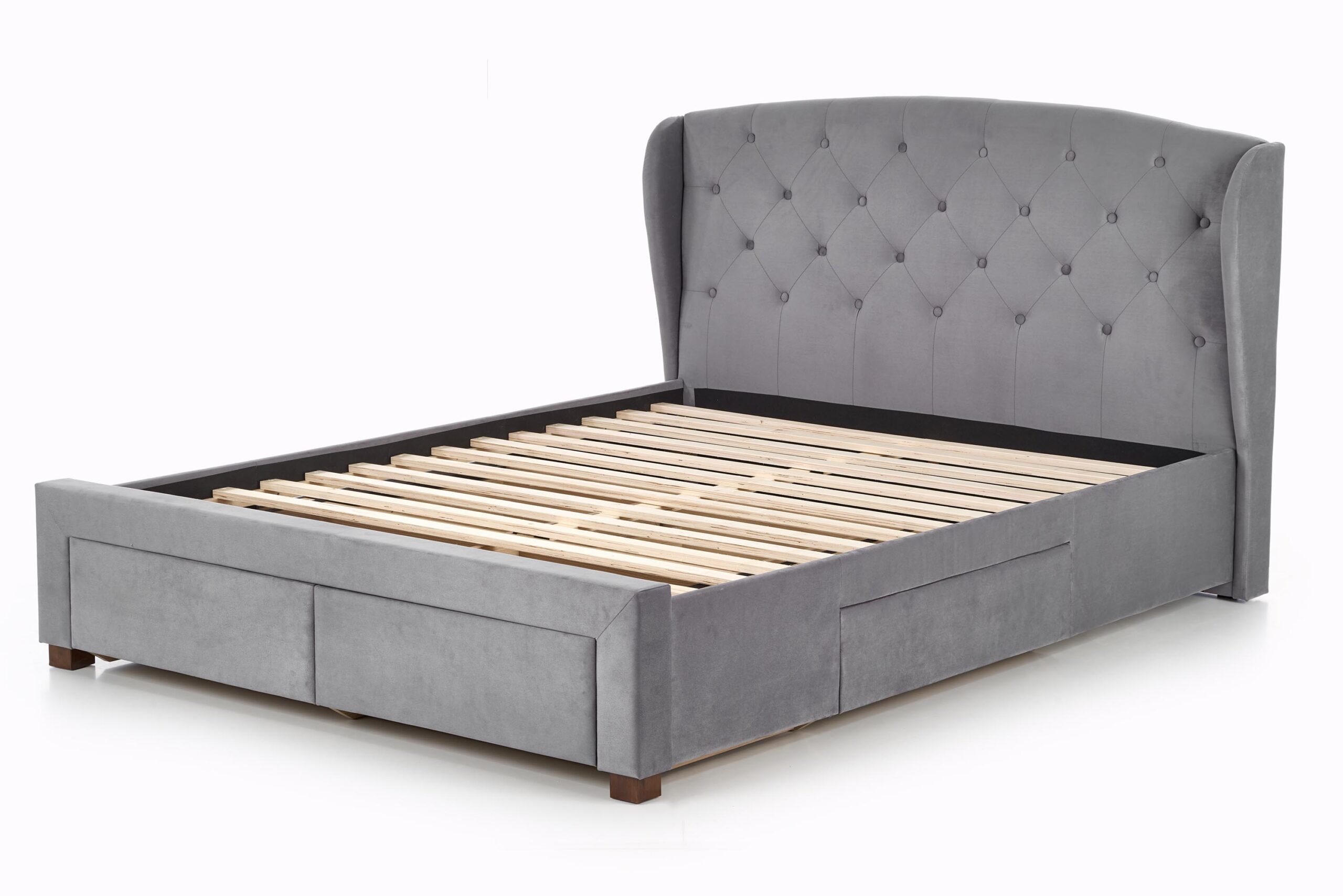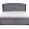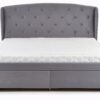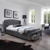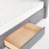 wymiary: 171/218/111 cm, łóżko z szufladami, materiał: tkanina / drewno lite, kolor: tkanina – popielaty, drewno – orzech