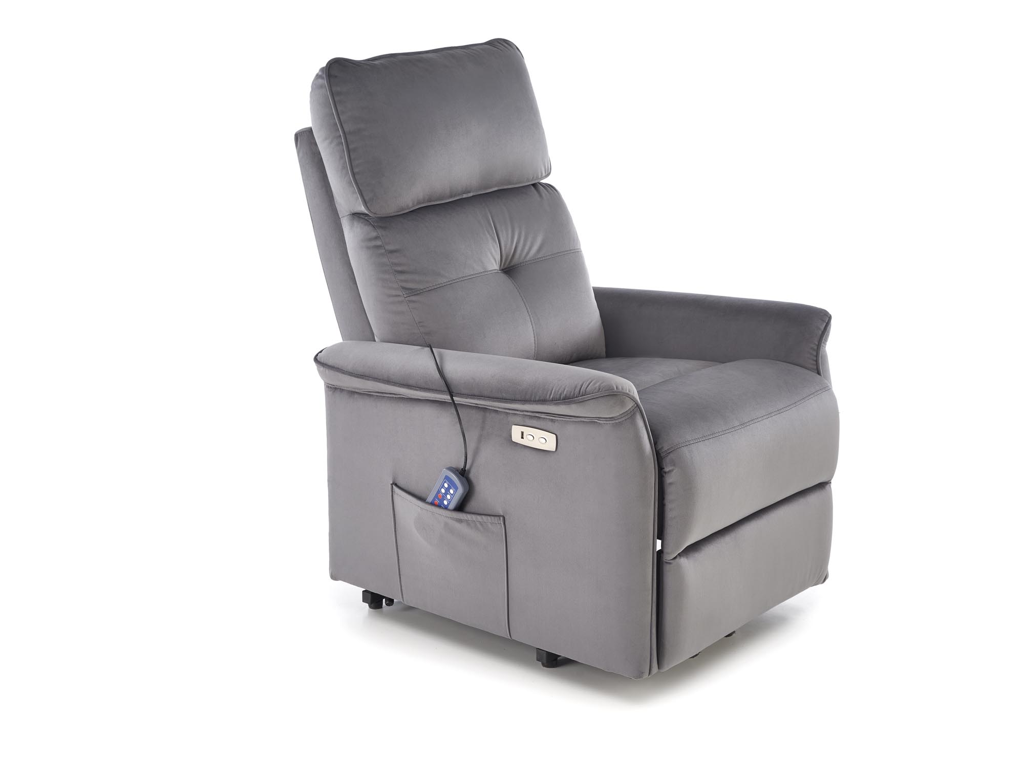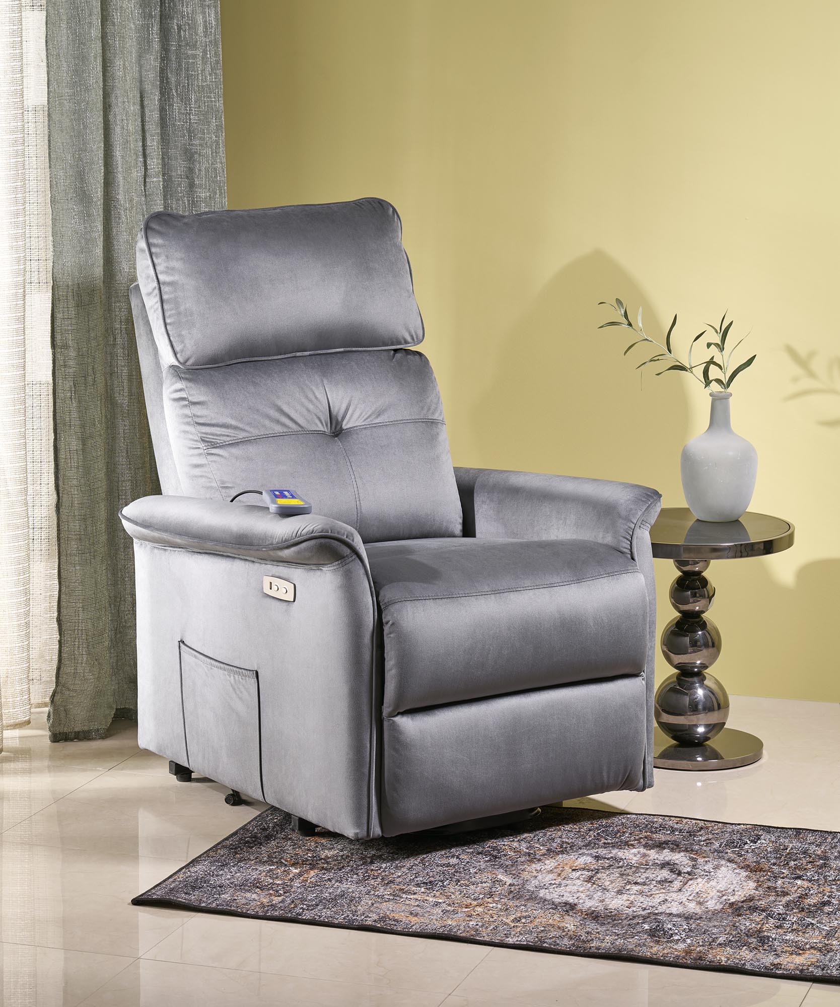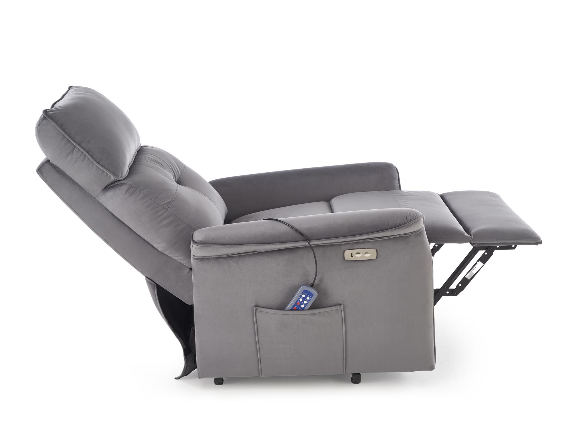 wymiary: 80/108-90/90-160/51-52 cm, fotel z funkcją elektrycznego rozkładania / funkcja pionizacji / funkcja masażu / gniazdo USB, materiał: tkanina velvet – BLUVEL, kolor: popielaty #14