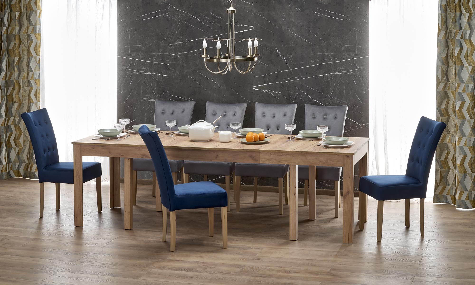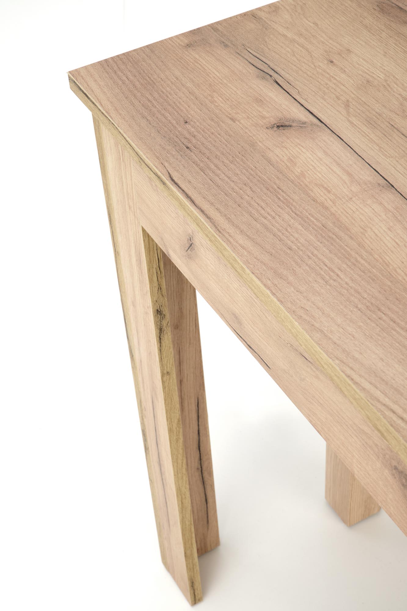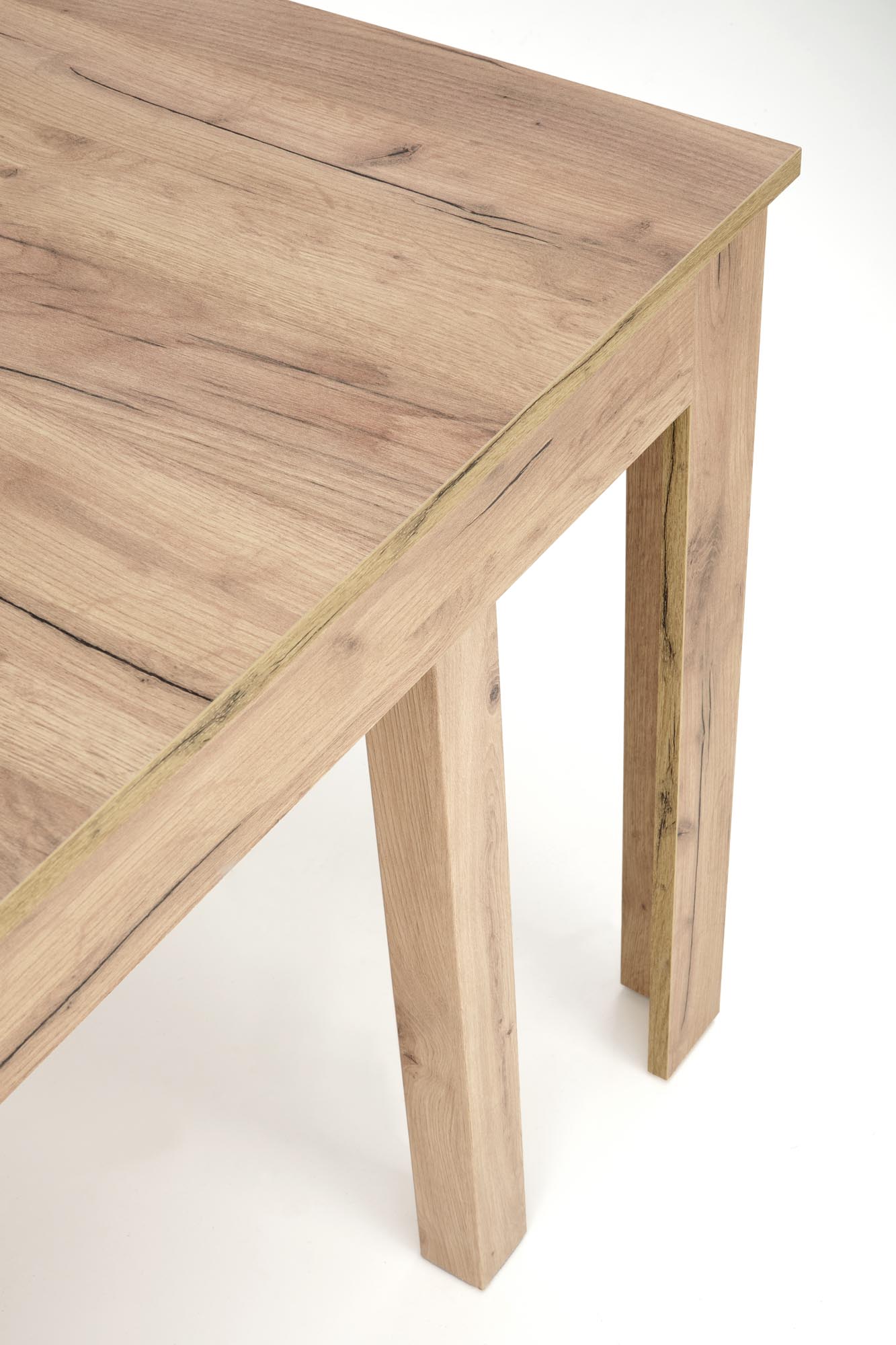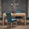 stół rozkładany, wymiary: 160÷300/90/76 cm, materiał: blat – płyta laminowana, na obrzeżach ABS, nogi – MDF laminowany, kolor: dąb craft