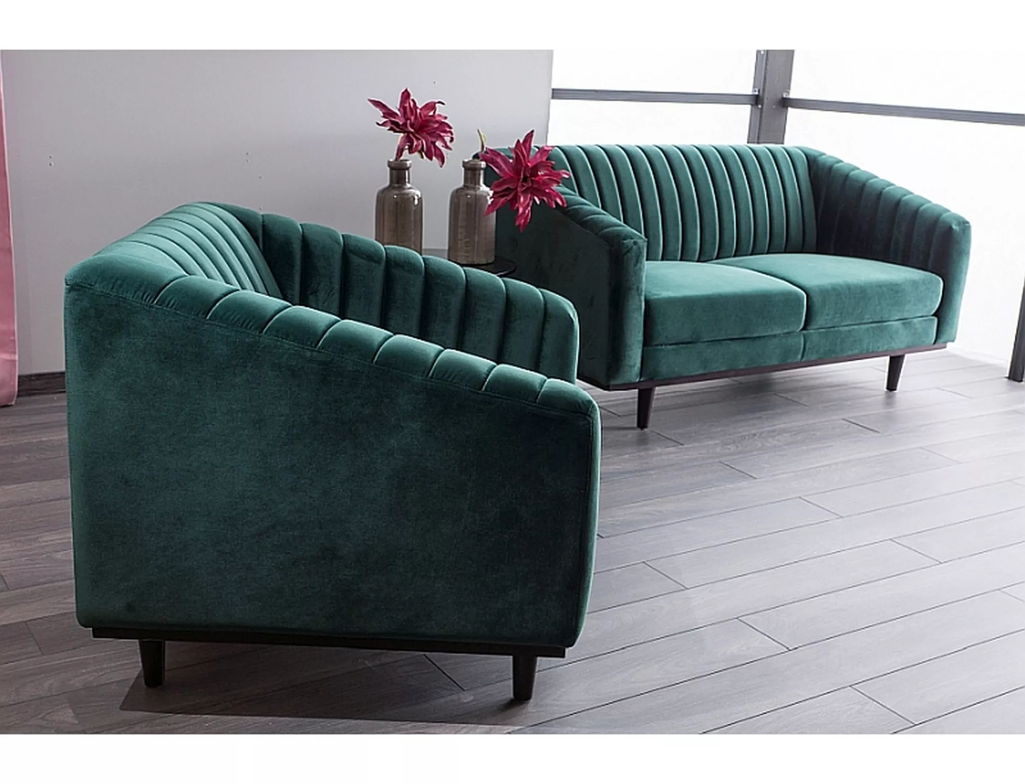 Sofa, tkanina aksamit, kolor: wg próbnika Bluvel 78 – zielony, drewno, kolor: wenge. Wymiary sofy: A – 78, B – 150, C – 43, D – 60, E – 85, F – 18 cm.