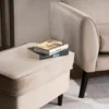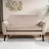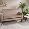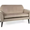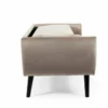 Sofa, tkanina aksamit: Bluvel 40 – ciemny beżowy / drewno, kolor: wenge. Wymiary sofy: A – 85, B – 147, C – 52, D – 52, E – 75, F – 23 cm.